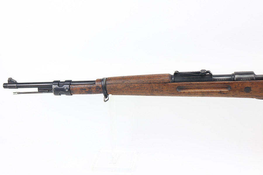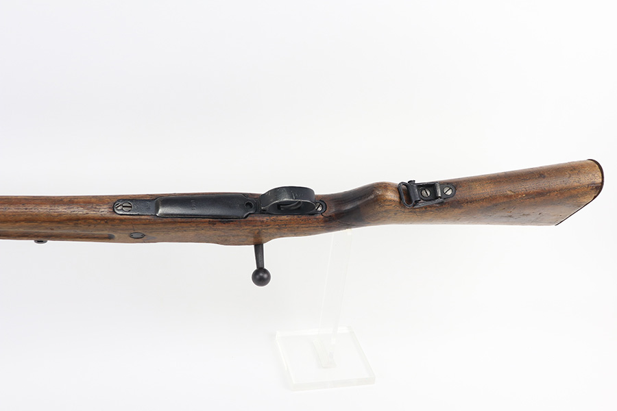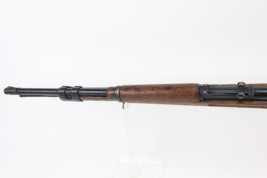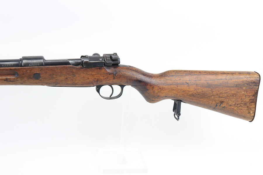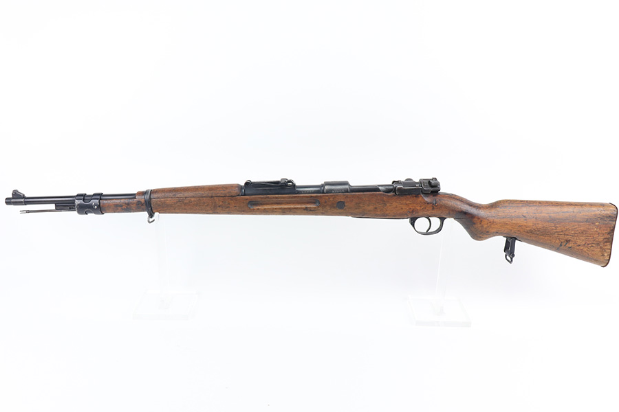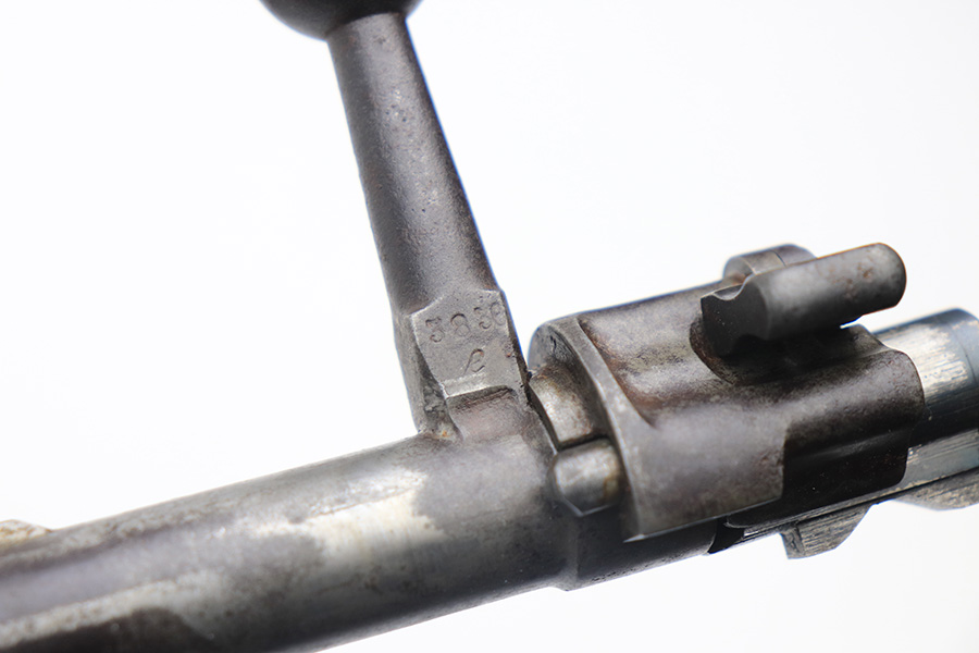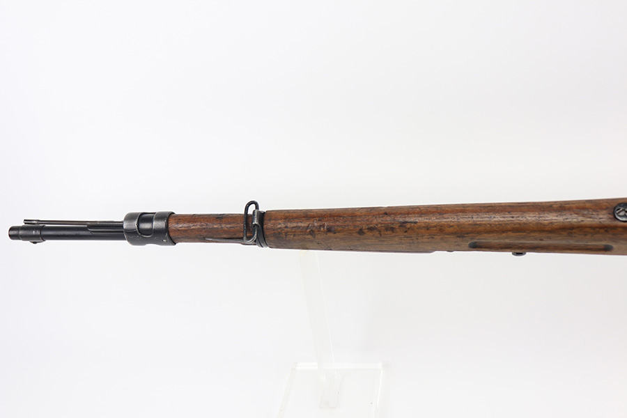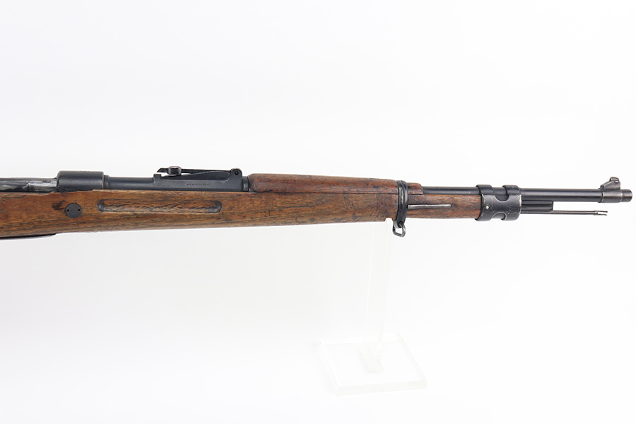 2/18/22 – This is the Chinese Chiang Kai-shek rifle, which was their copy of the German Standardmodell rifle. Production ran from 1935-49, and this model was one of the main battle rifles for the Chinese National Revolutionary Army. It was a shortened and lightened version of the Gewehr 98, specifically, a copy of the Oberndorf Export Mauser named Standard Modell. 10,000 had been bought by China in 1934 and the Germans provided the tooling to produce the Type 24. This particular rifle appears arsenal refinished, but does have mostly matching numbers throughout with a mismatched bolt. Otherwise appears to have all matching small parts. It has seen extensive use, and the bore shows notable wear to the rifling with corrosion throughout. Stock has a crack around the wrist.