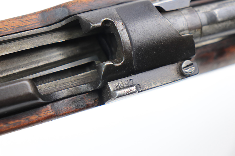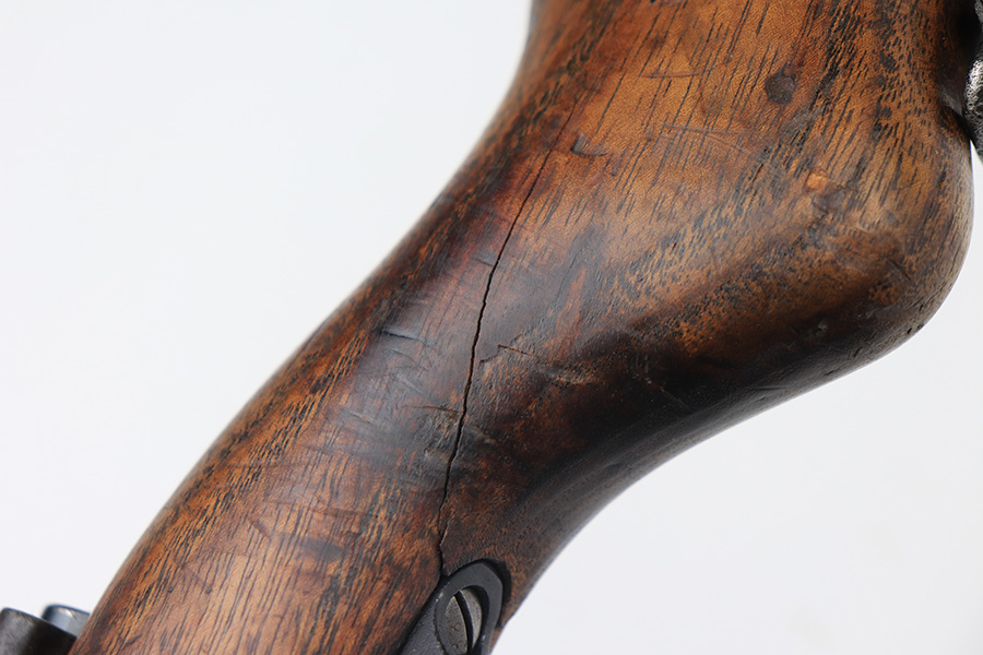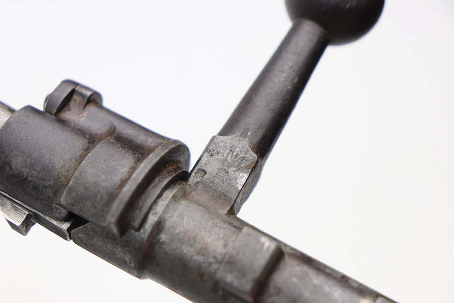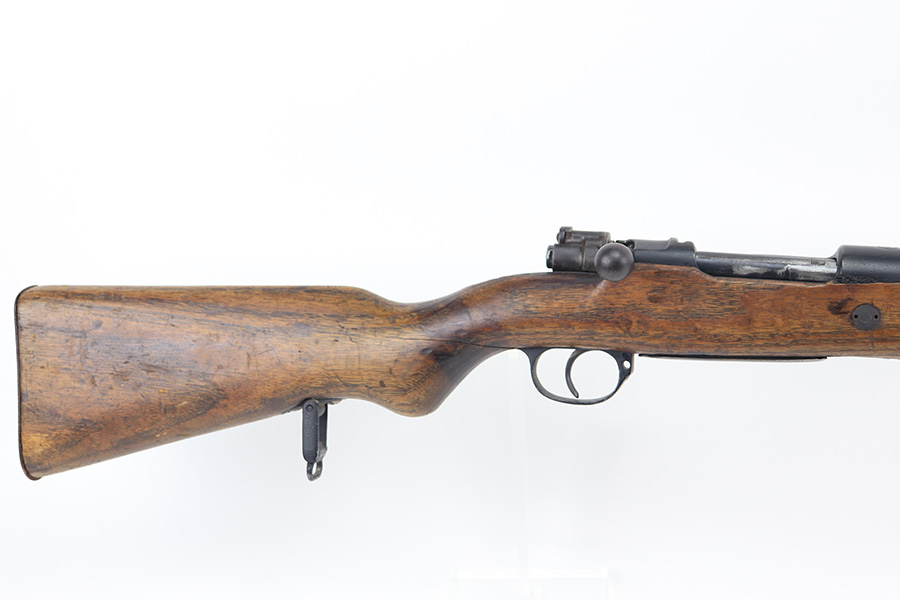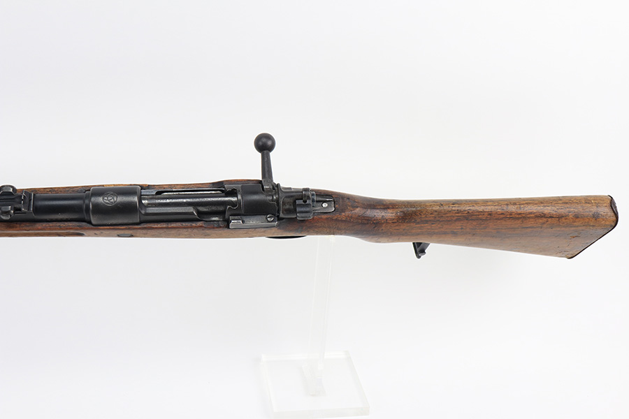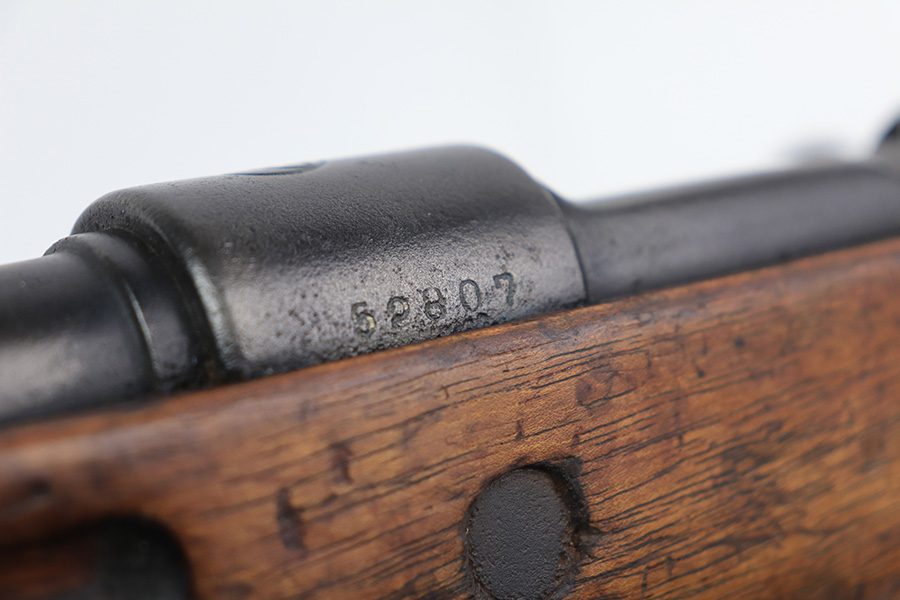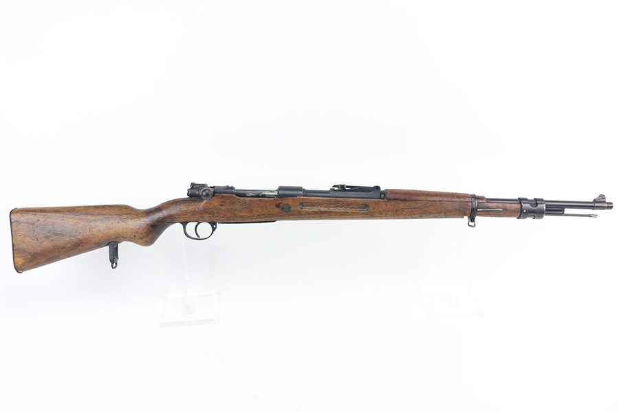2/18/22 – This is the Chinese Chiang Kai-shek rifle, which was their copy of the German Standardmodell rifle. Production ran from 1935-49, and this model was one of the main battle rifles for the Chinese National Revolutionary Army. It was a shortened and lightened version of the Gewehr 98, specifically, a copy of the Oberndorf Export Mauser named Standard Modell. 10,000 had been bought by China in 1934 and the Germans provided the tooling to produce the Type 24. This particular rifle appears arsenal refinished, but does have mostly matching numbers throughout with a mismatched bolt. Otherwise appears to have all matching small parts. It has seen extensive use, and the bore shows notable wear to the rifling with corrosion throughout. Stock has a crack around the wrist.