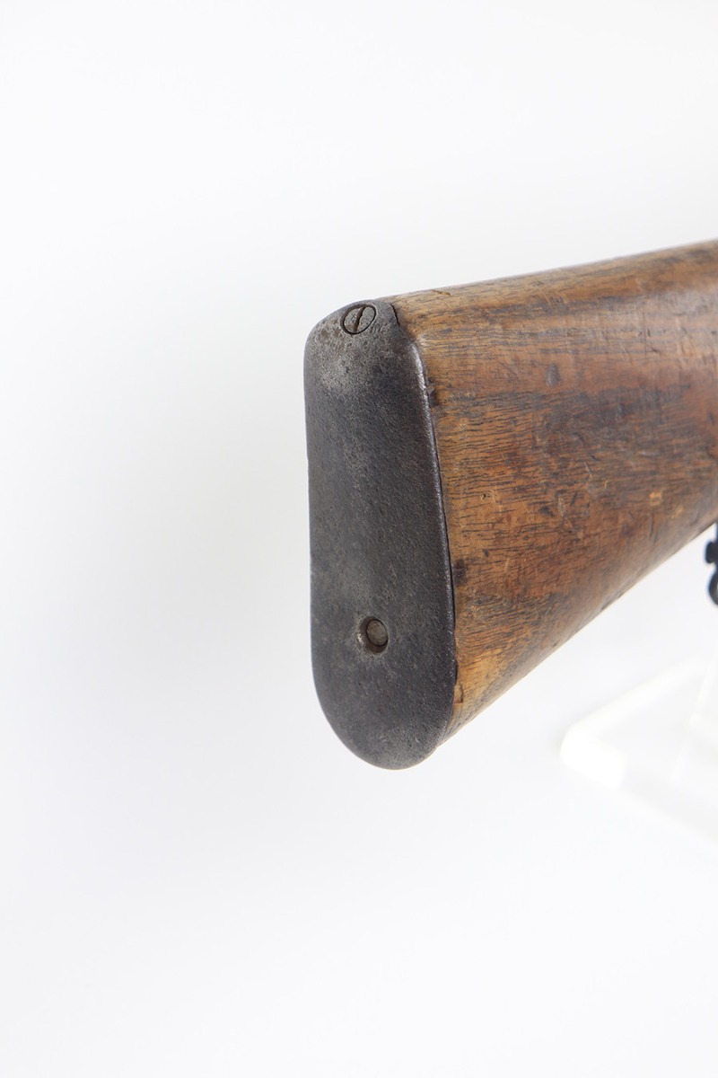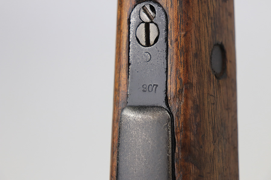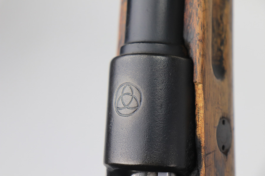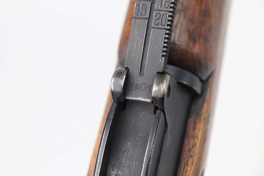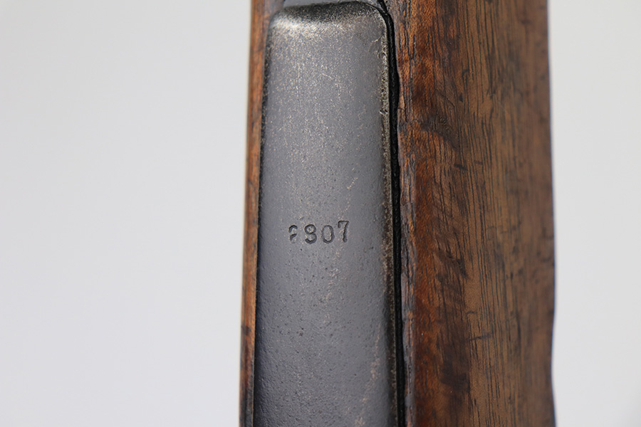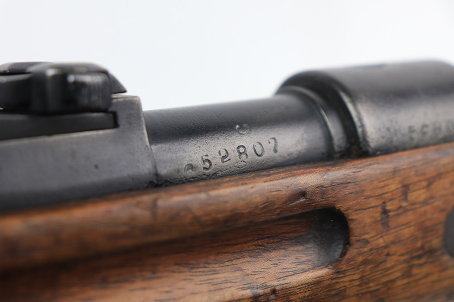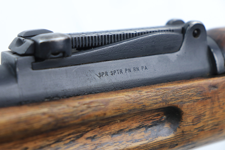2/18/22 – This is the Chinese Chiang Kai-shek rifle, which was their copy of the German Standardmodell rifle. Production ran from 1935-49, and this model was one of the main battle rifles for the Chinese National Revolutionary Army. It was a shortened and lightened version of the Gewehr 98, specifically, a copy of the Oberndorf Export Mauser named Standard Modell. 10,000 had been bought by China in 1934 and the Germans provided the tooling to produce the Type 24. This particular rifle appears arsenal refinished, but does have mostly matching numbers throughout with a mismatched bolt. Otherwise appears to have all matching small parts. It has seen extensive use, and the bore shows notable wear to the rifling with corrosion throughout. Stock has a crack around the wrist.