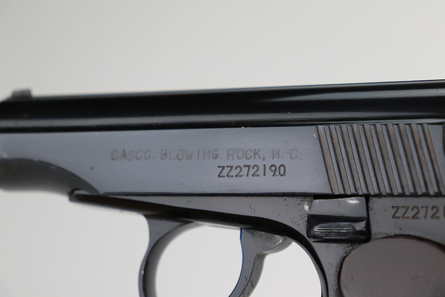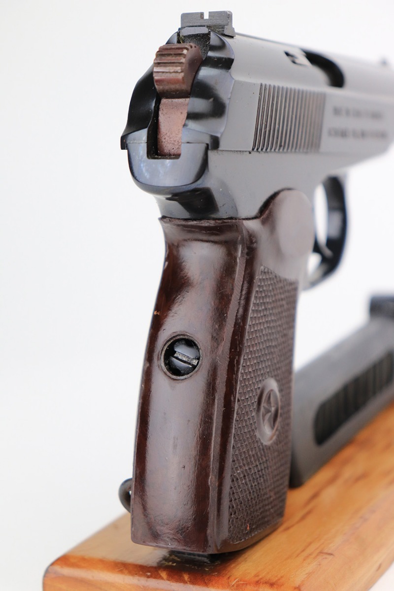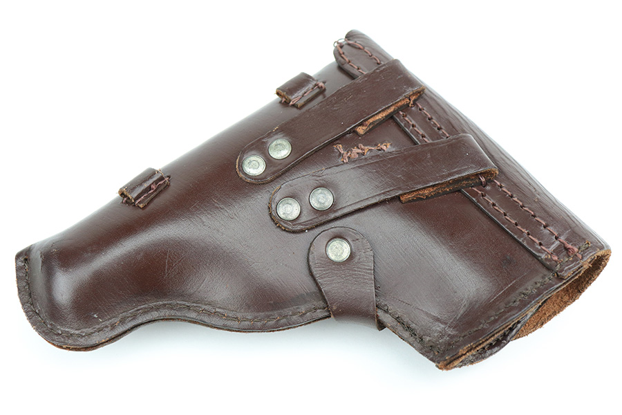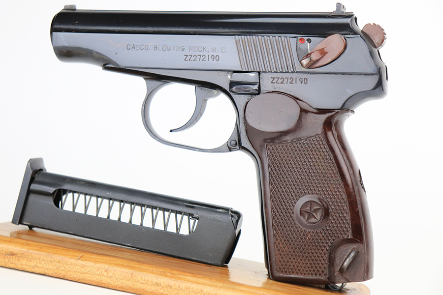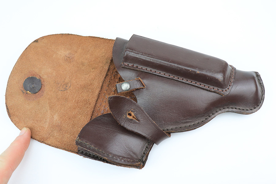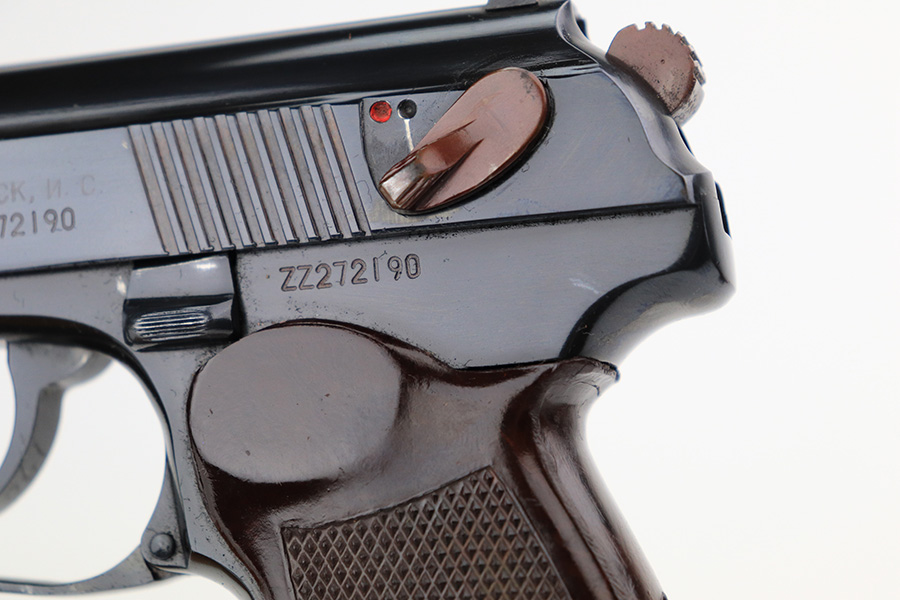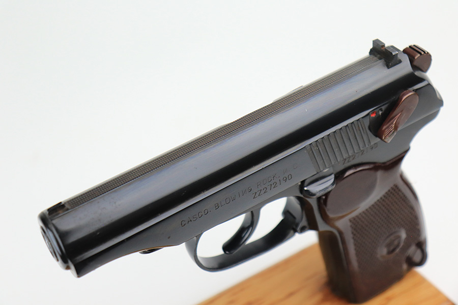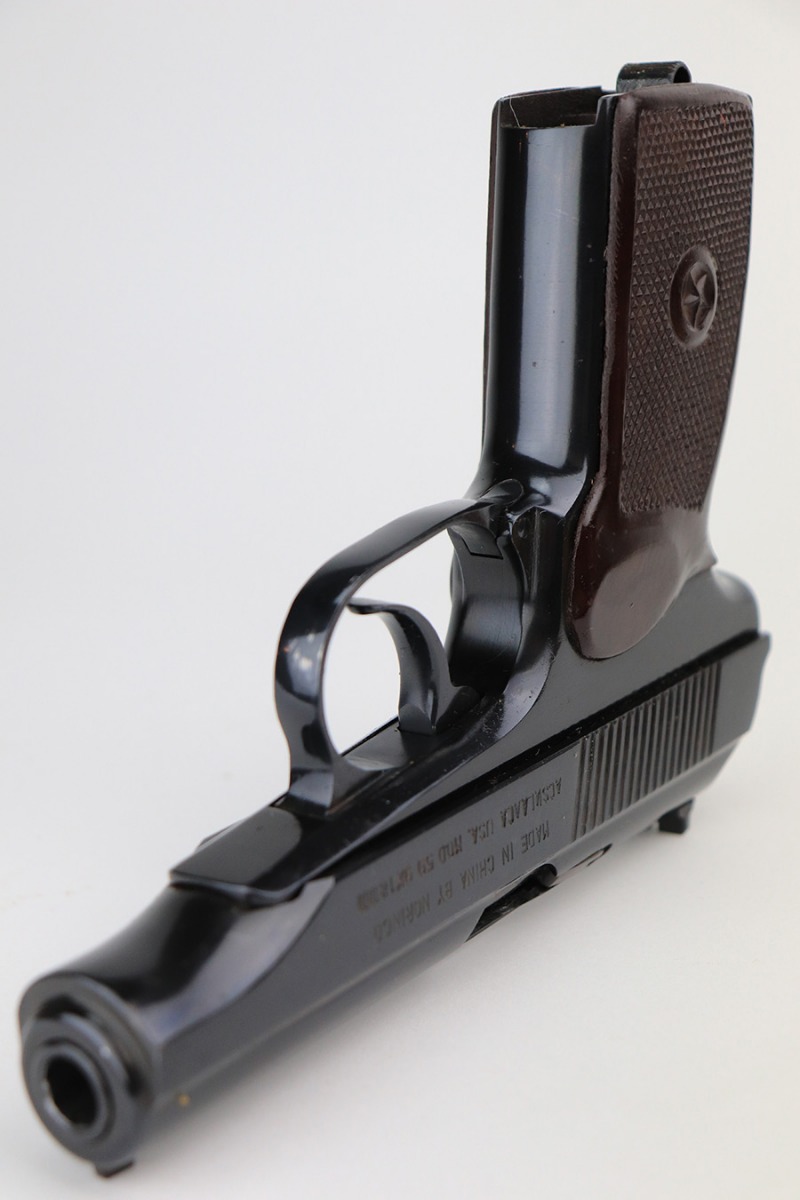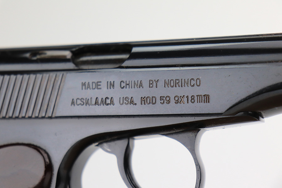 4/22/22 – This is a near-mint example of a Chinese-made Norinco Makarov Model 59 manufactured in the 1980’s. The gun is all matching and has an import mark on the left side of the slide. It comes as a rig with an excellent brown leather holster (a few of the stitches on the left side of the top flap are coming apart), one matching-numbered magazine, and one mismatched magazine. The gun has retained nearly all of its original high polish finish. There are just some tiny handling marks here and there (especially on the underside of the trigger guard) and some tiny dots of discoloration around the muzzle. Comes with a proper reddish bakelite grip. Minty bore.