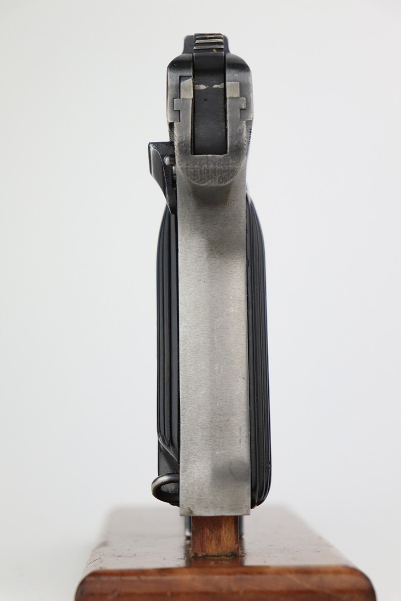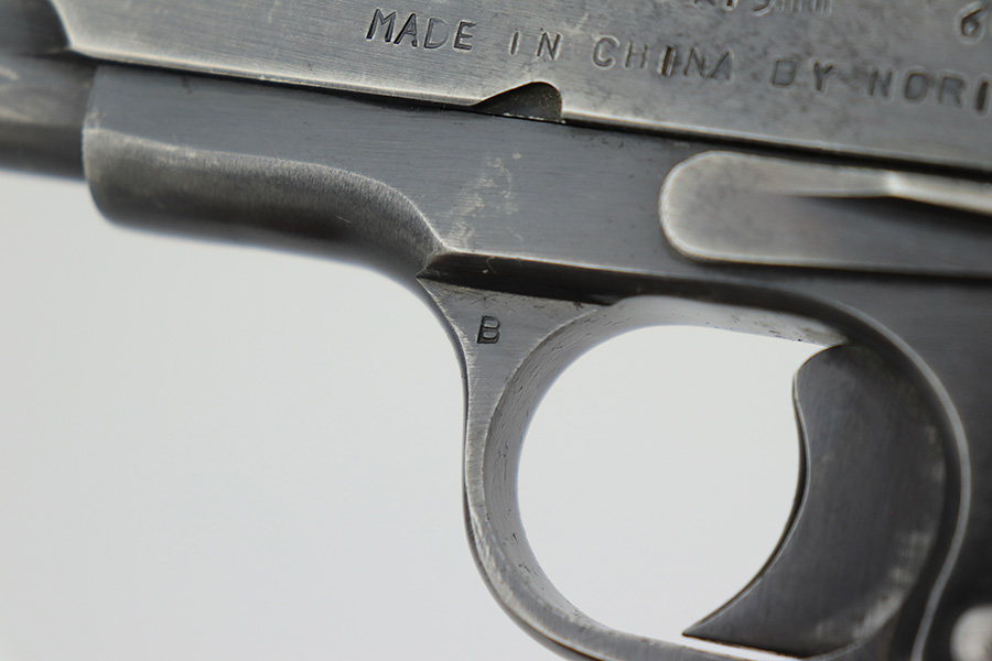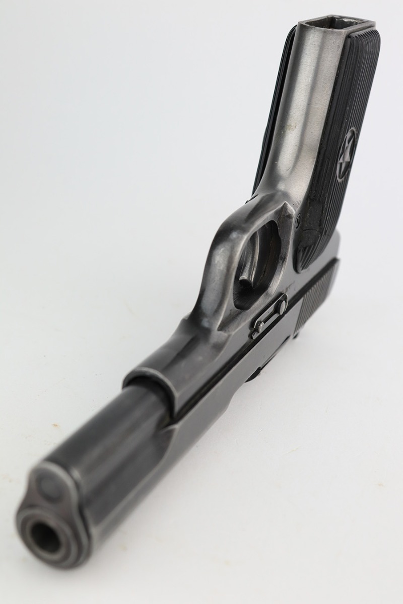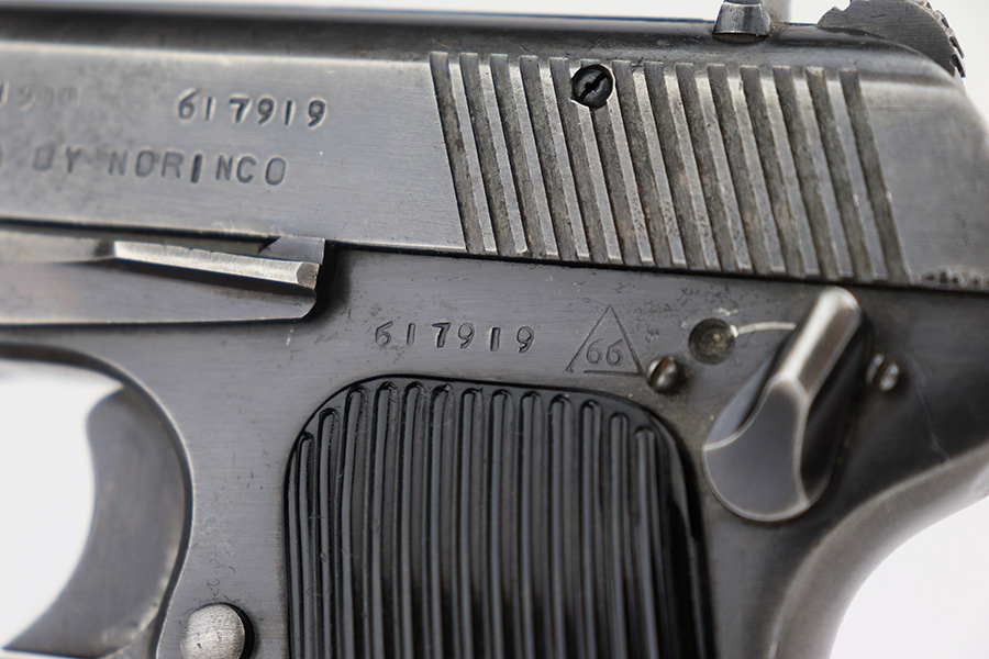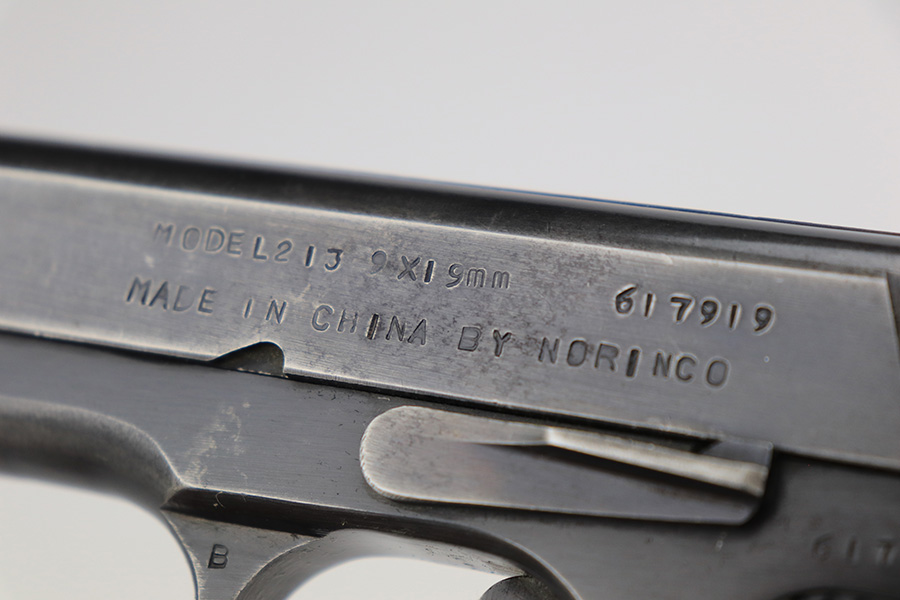 4/28/23 – This is a nice example of a Chinese Norinco Tokarev Model 213 manufactured in Factory 66 around 1959, chambered in 9mm Luger. It is all matching and comes with one matching-numbered magazine. Import mark on the right side of the frame. It has retained roughly half of its original bluing with obvious finish loss throughout. An area of splotchy discoloration on the left side of the slide, around the muzzle. Excellent black plastic grips. Minty bore.