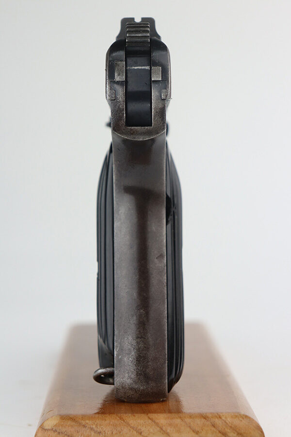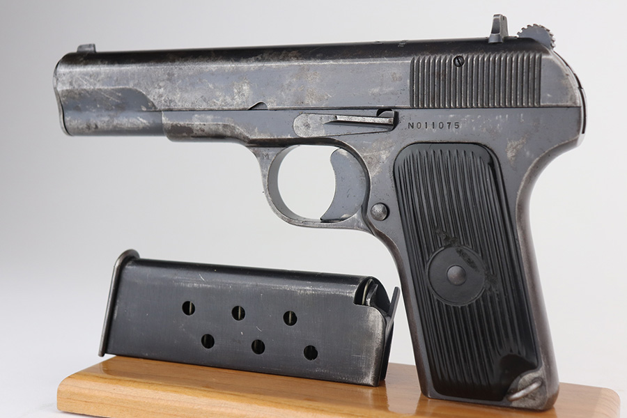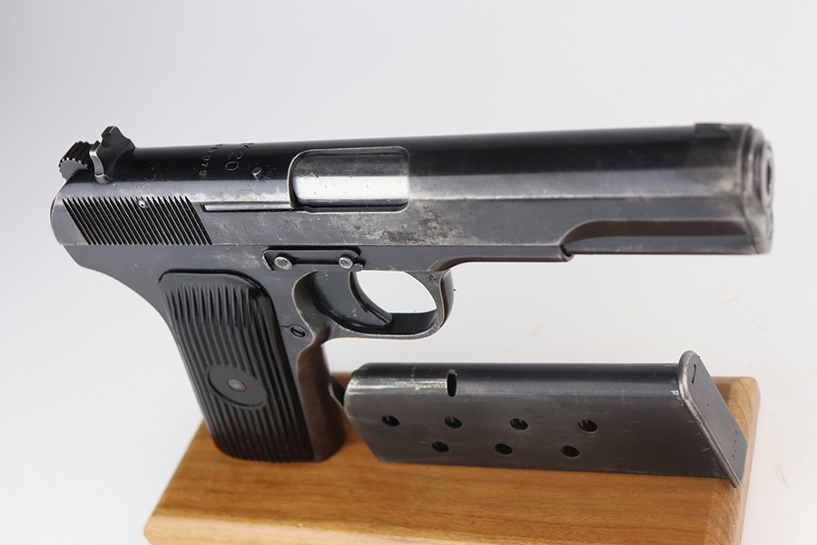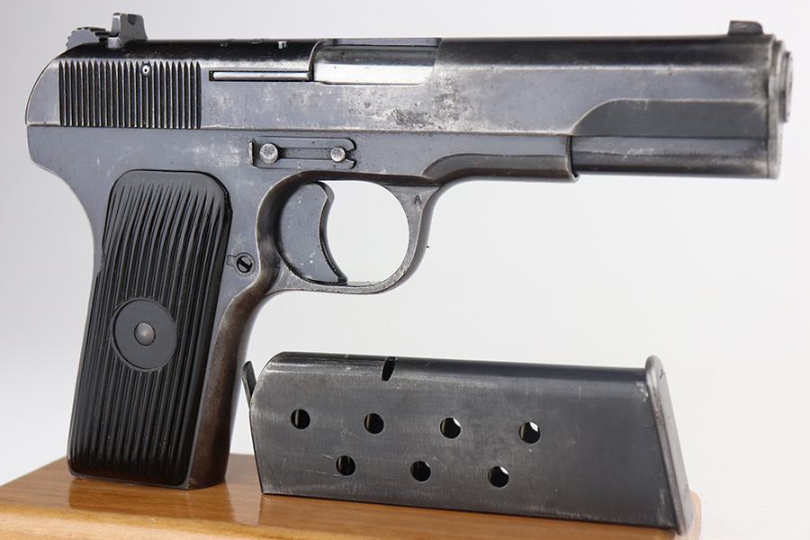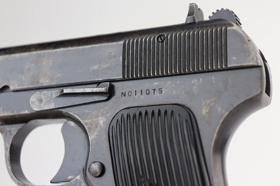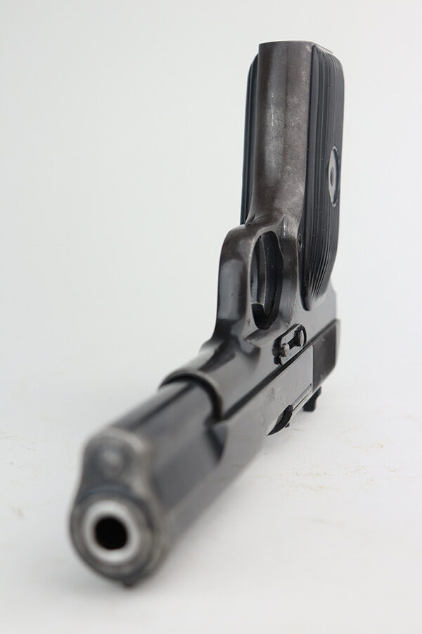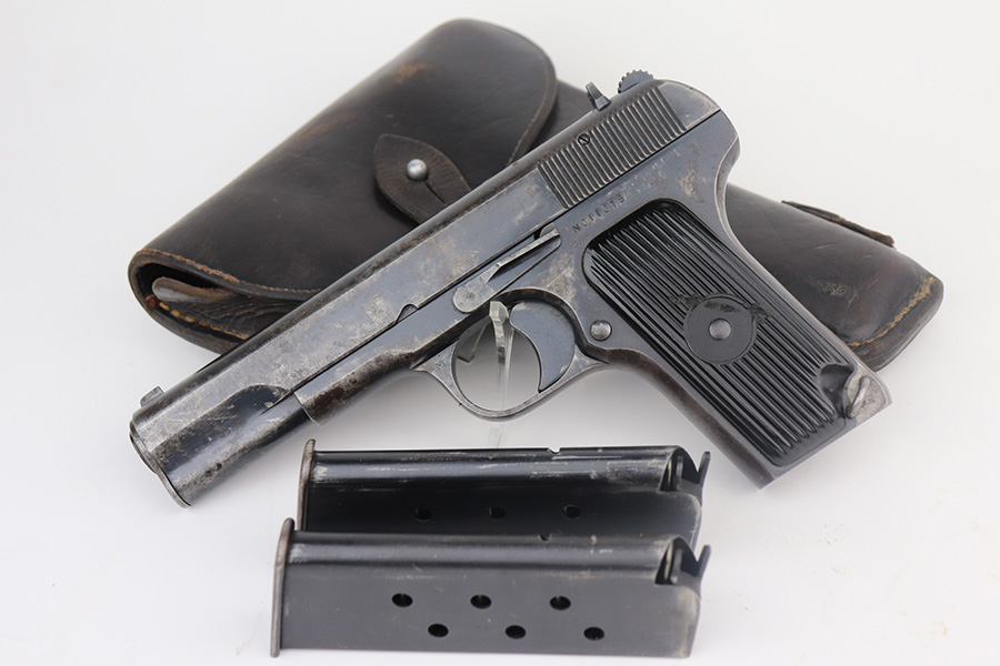 6/21/21 – This is a Chinese M20 rig, manufactured in the 1960’s. The M20 was a version of the Type 54 made without factory markings to conceal the weapon’s origins. Many of these were provided to Vietnamese forces during the Vietnam War. This one is all matching and comes with a period-correct holster, cleaning rod, and two mismatched magazines. It has retained roughly 60% of its finish. There is thinning and patina on the straps and areas of pin pricking here and there. There is a gouge in the left grip and a small chip in the right grip. The bore has decent rifling, but there is oxidation and pin-pricking throughout.