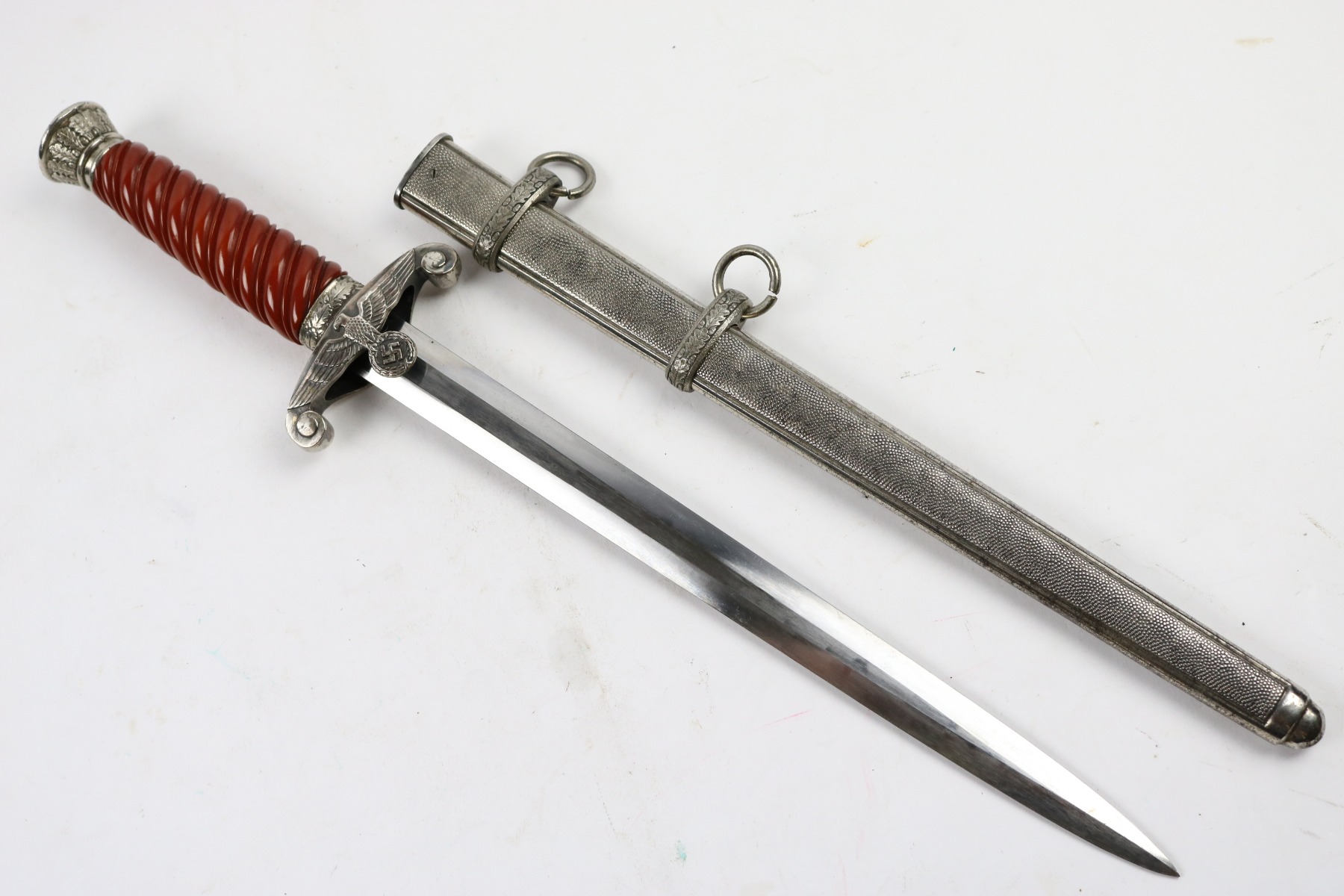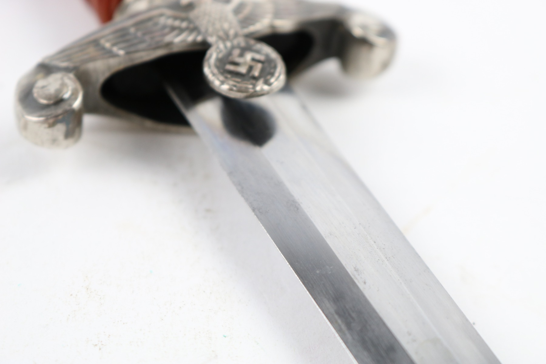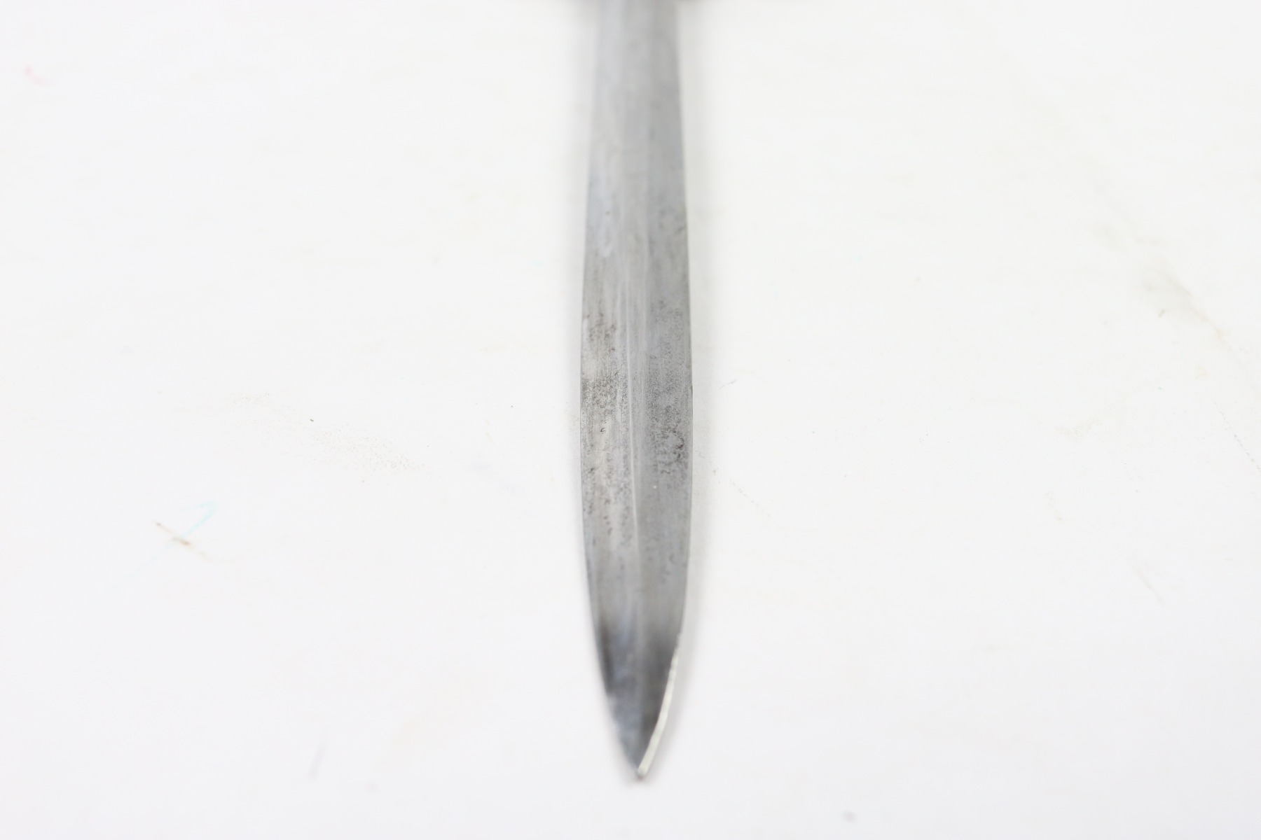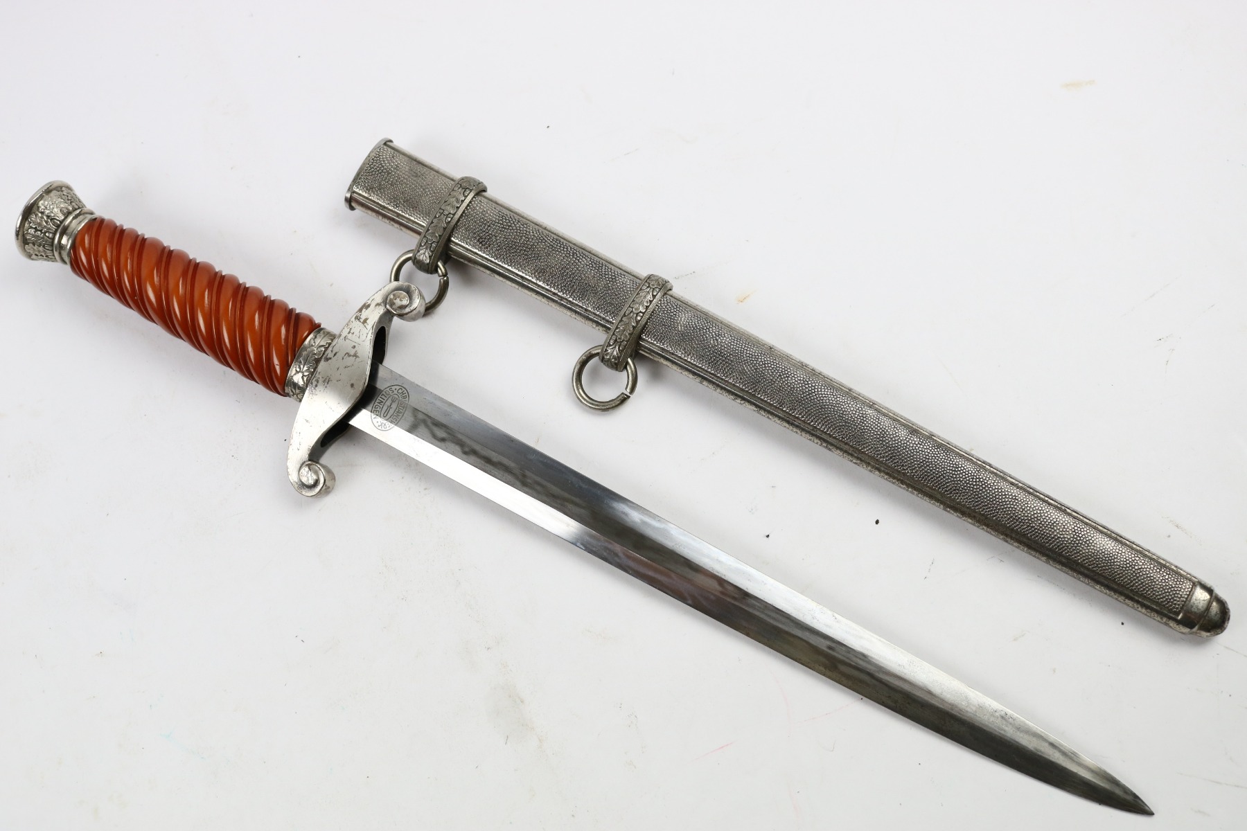 7/18/18 – This is an original WW2 production nazi army dagger made by Christianwerke. Christianwerke made army daggers are one of the more scarce makers, and therefore demands a premium price to other army daggers. This dagger is in good condition with some oxidation and areas of light discoloration on the blade. The maker-marked side of the blade has slightly more wear than the reverse side. The handle is excellent with no cracks or chips. There’s surface wear / finish loss on the pommel and hand guard. The hand guard does have some minor “play” but isn’t loose. The scabbard is original with no dents. Guaranteed all original and authentic.