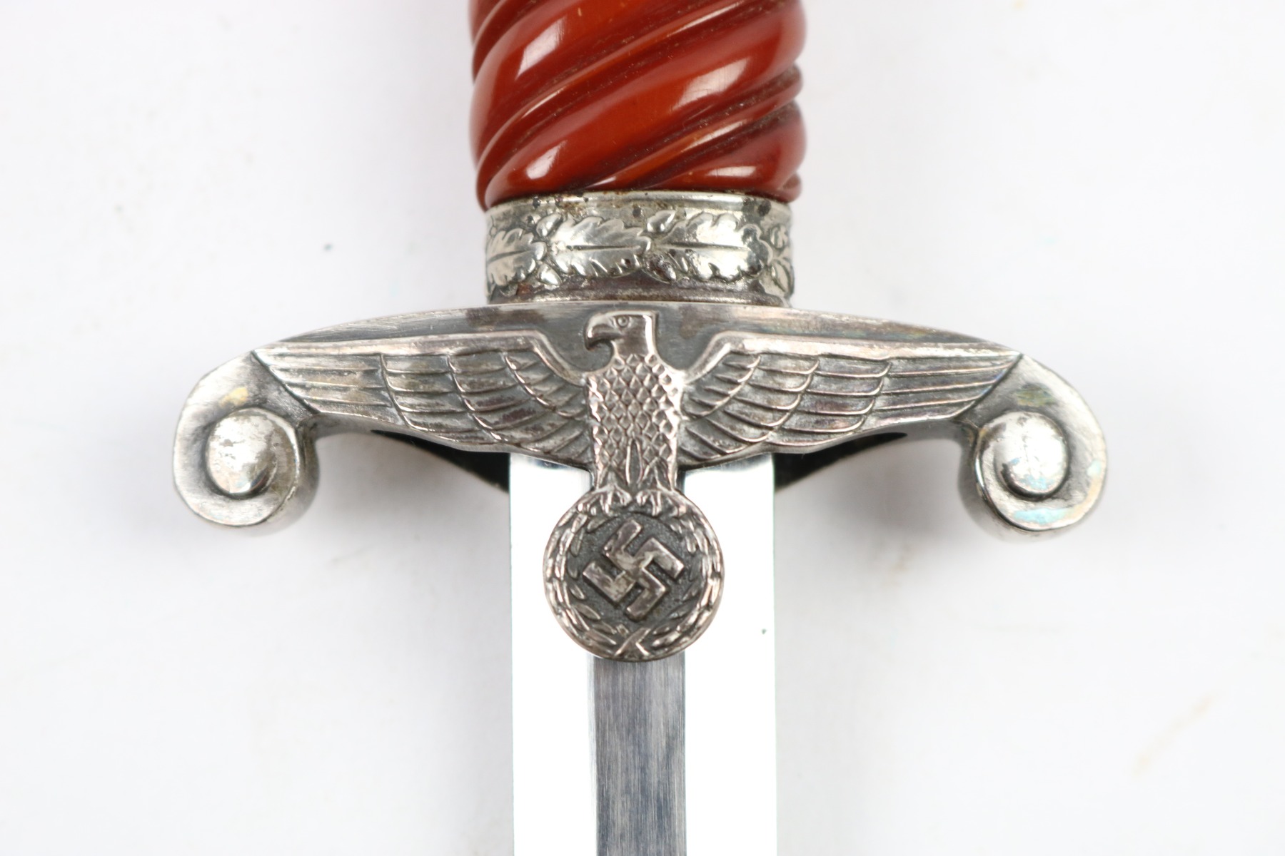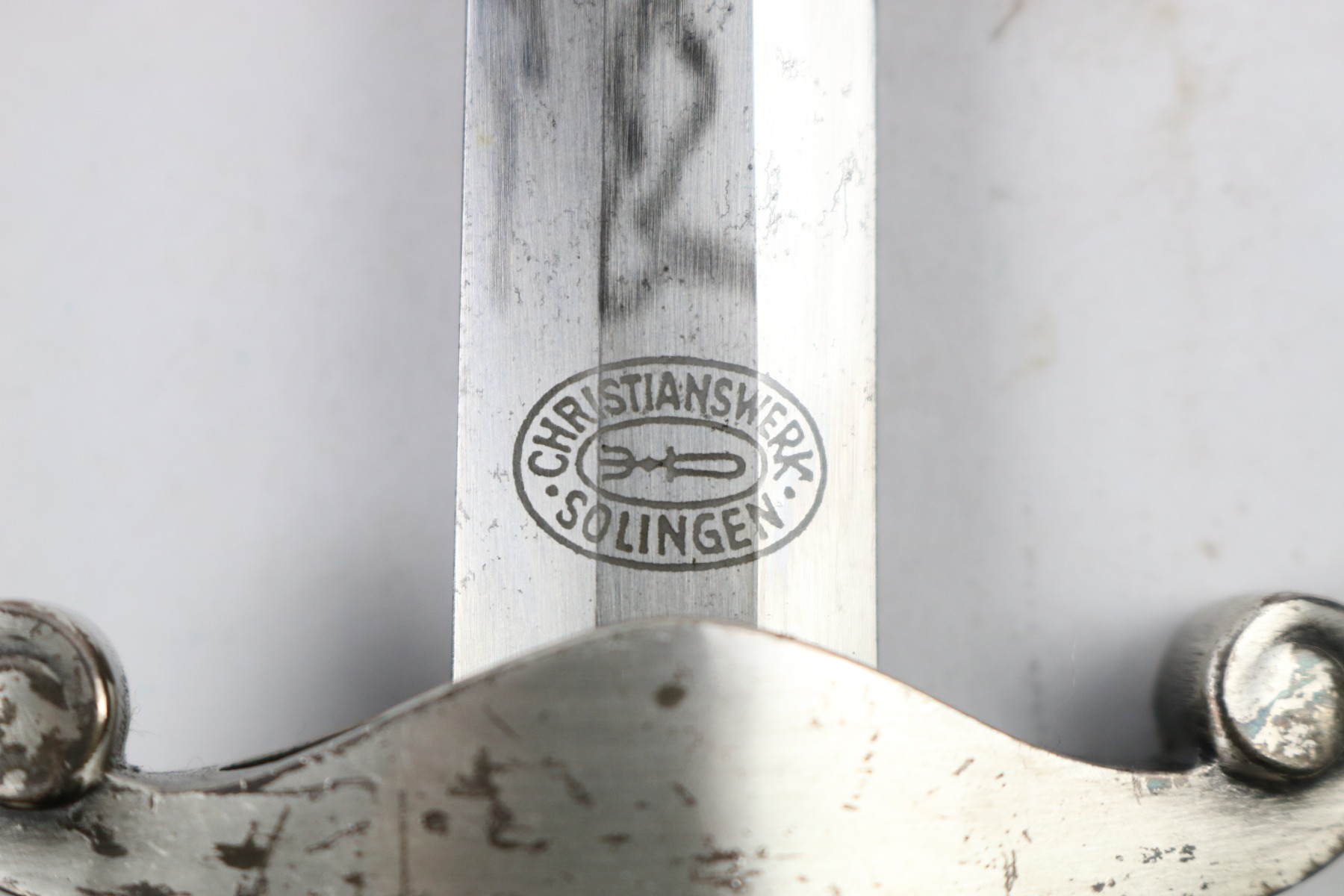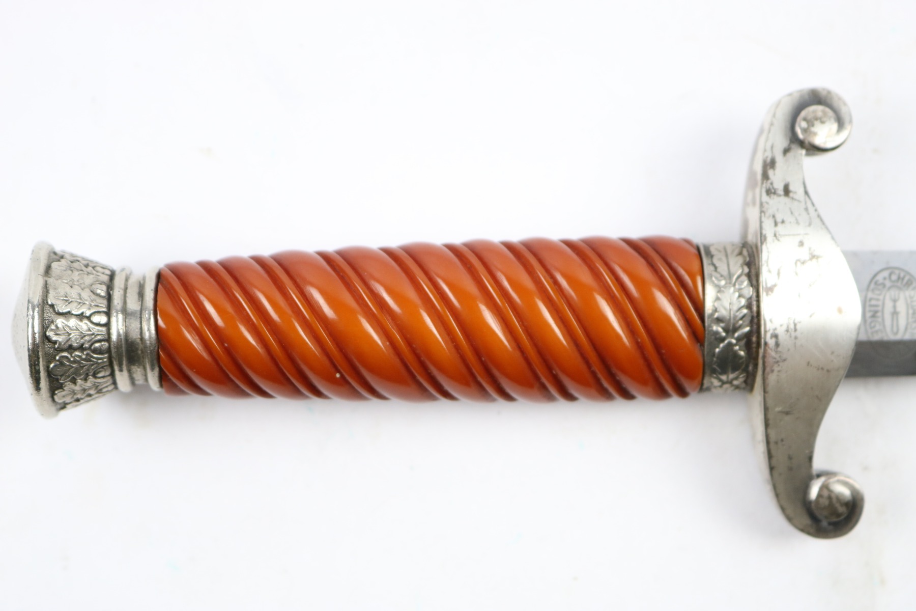 7/18/18 – This is an original WW2 production nazi army dagger made by Christianwerke. Christianwerke made army daggers are one of the more scarce makers, and therefore demands a premium price to other army daggers. This dagger is in good condition with some oxidation and areas of light discoloration on the blade. The maker-marked side of the blade has slightly more wear than the reverse side. The handle is excellent with no cracks or chips. There’s surface wear / finish loss on the pommel and hand guard. The hand guard does have some minor “play” but isn’t loose. The scabbard is original with no dents. Guaranteed all original and authentic.