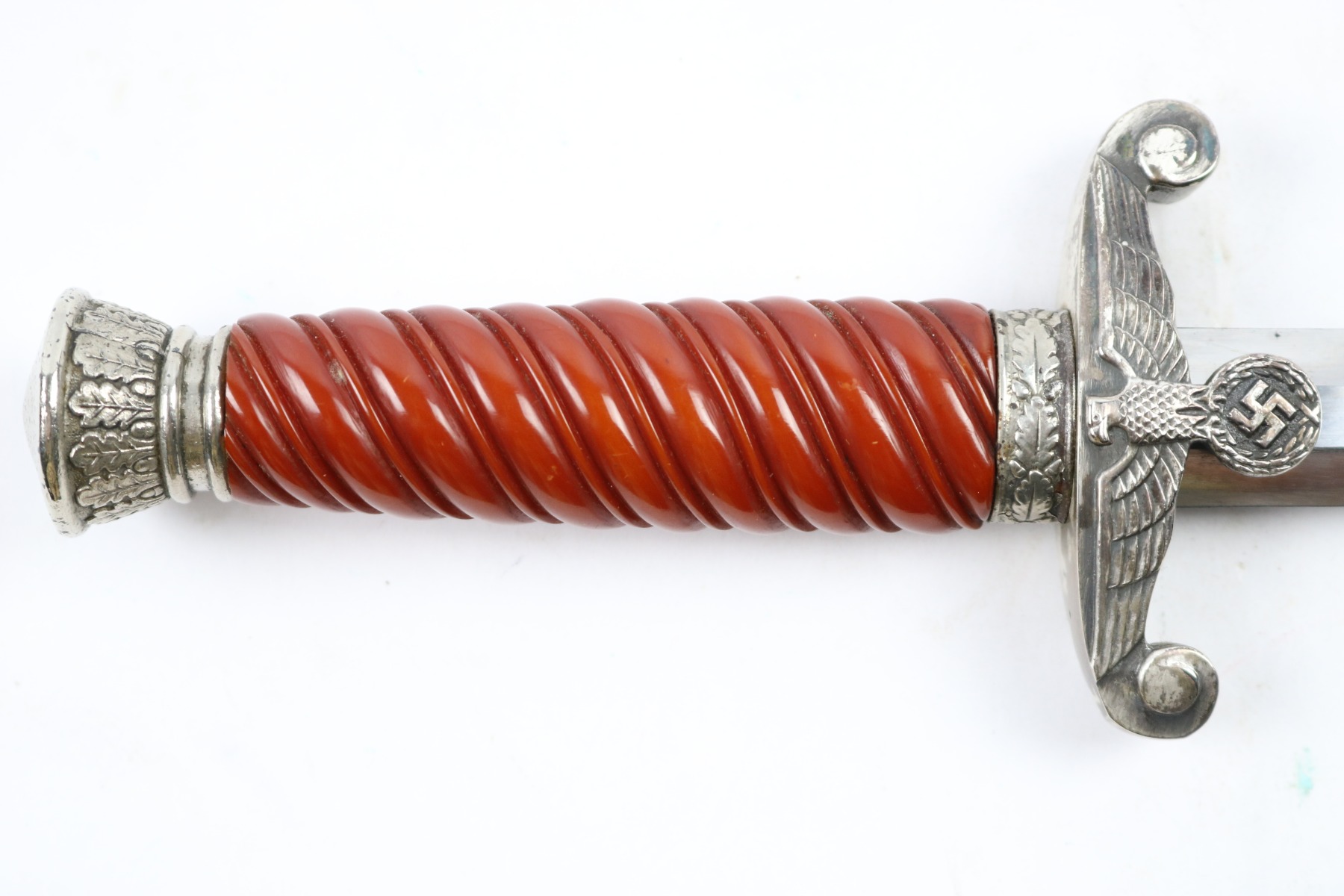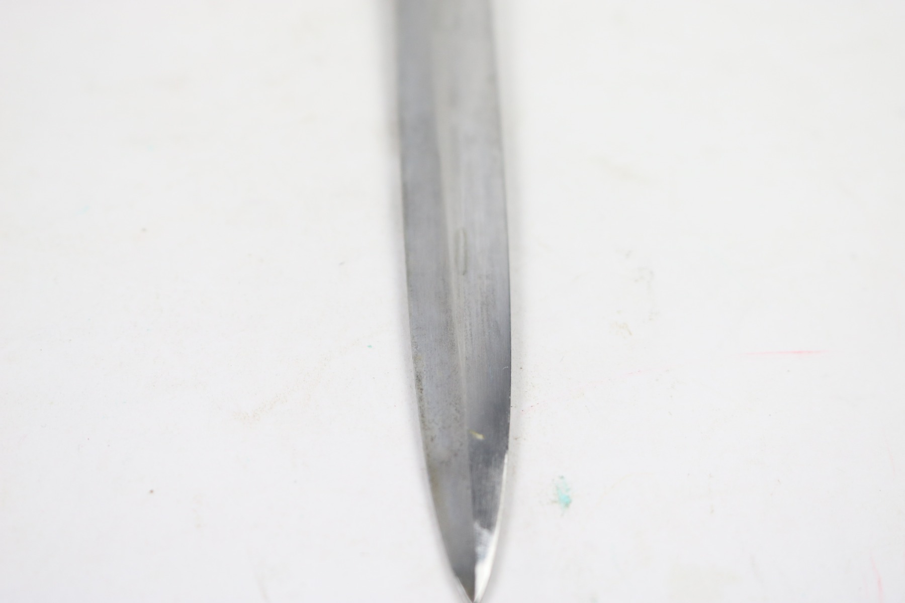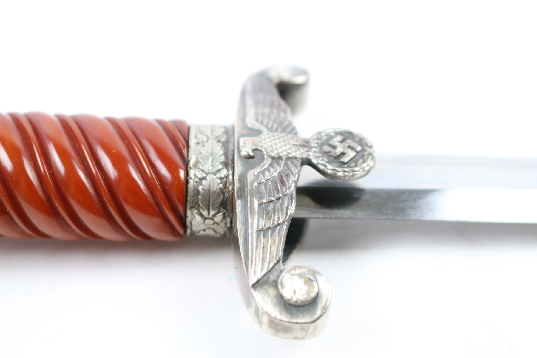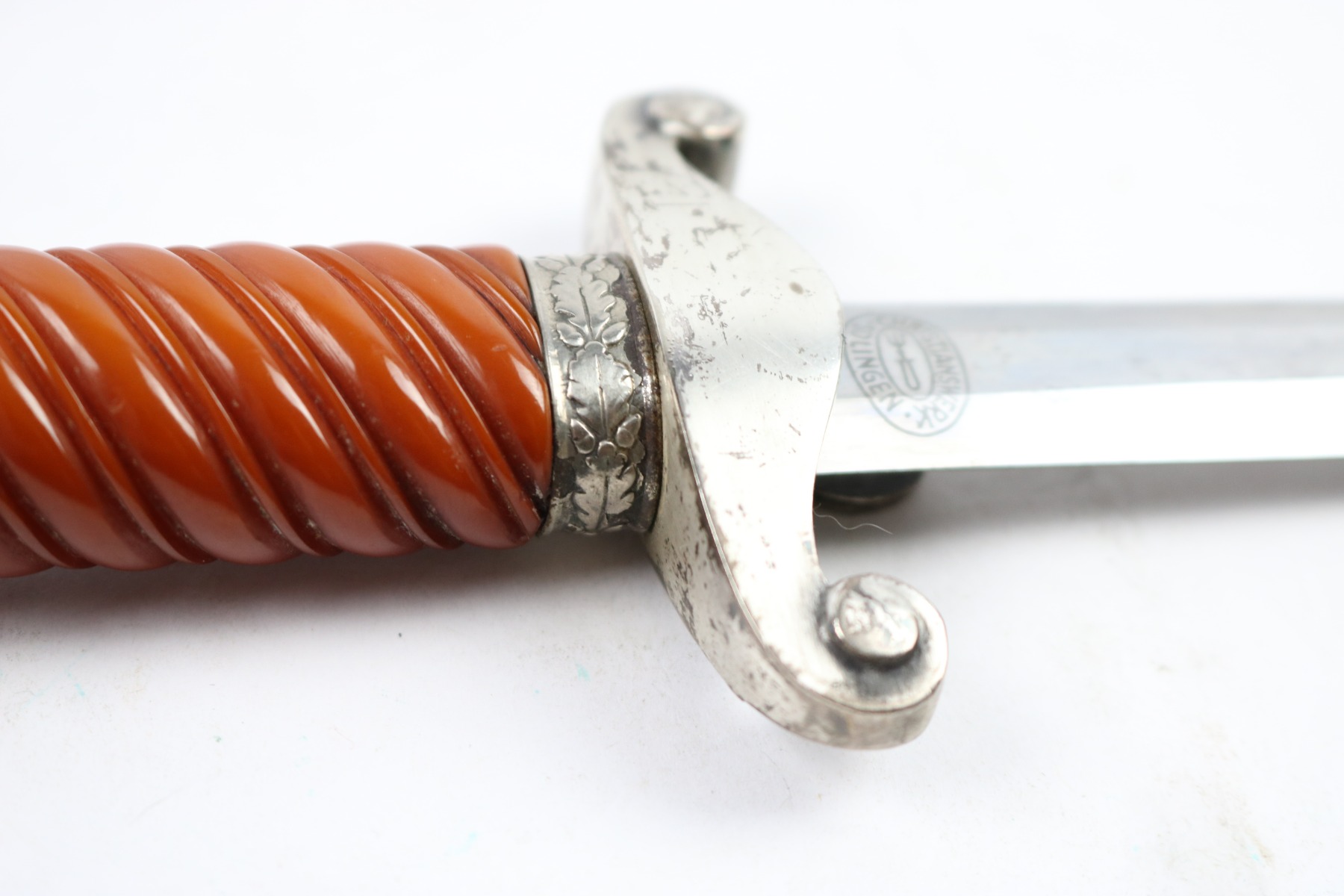 7/18/18 – This is an original WW2 production nazi army dagger made by Christianwerke. Christianwerke made army daggers are one of the more scarce makers, and therefore demands a premium price to other army daggers. This dagger is in good condition with some oxidation and areas of light discoloration on the blade. The maker-marked side of the blade has slightly more wear than the reverse side. The handle is excellent with no cracks or chips. There’s surface wear / finish loss on the pommel and hand guard. The hand guard does have some minor “play” but isn’t loose. The scabbard is original with no dents. Guaranteed all original and authentic.