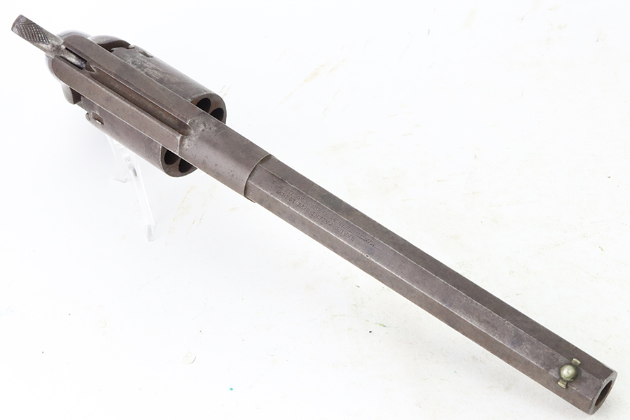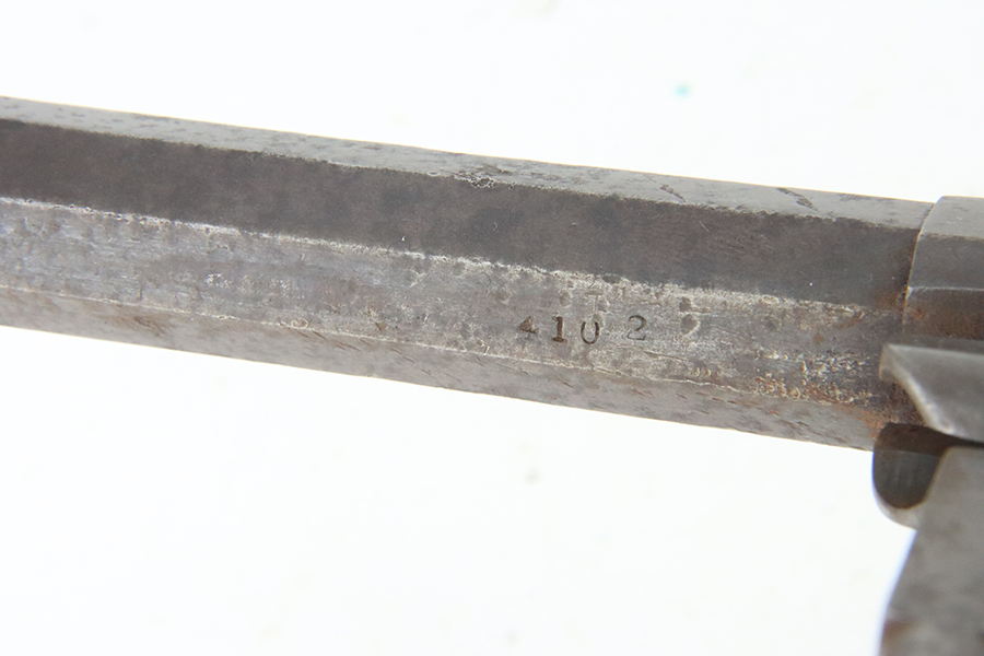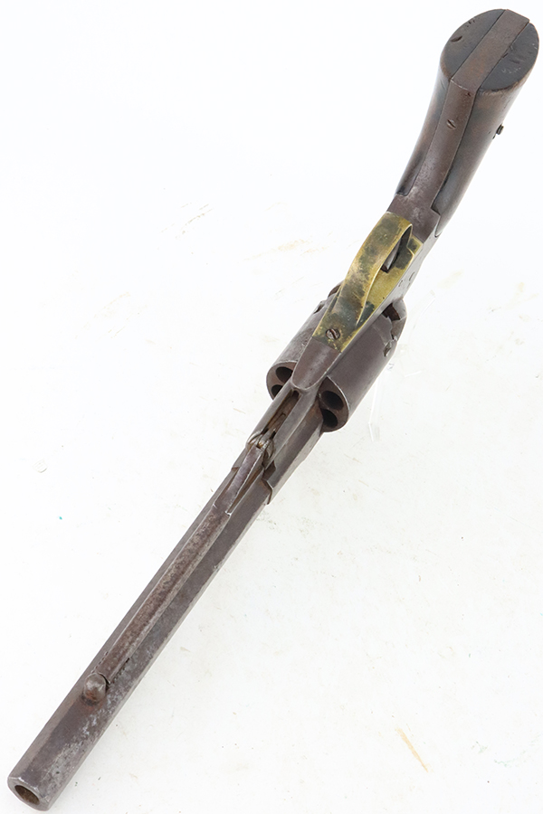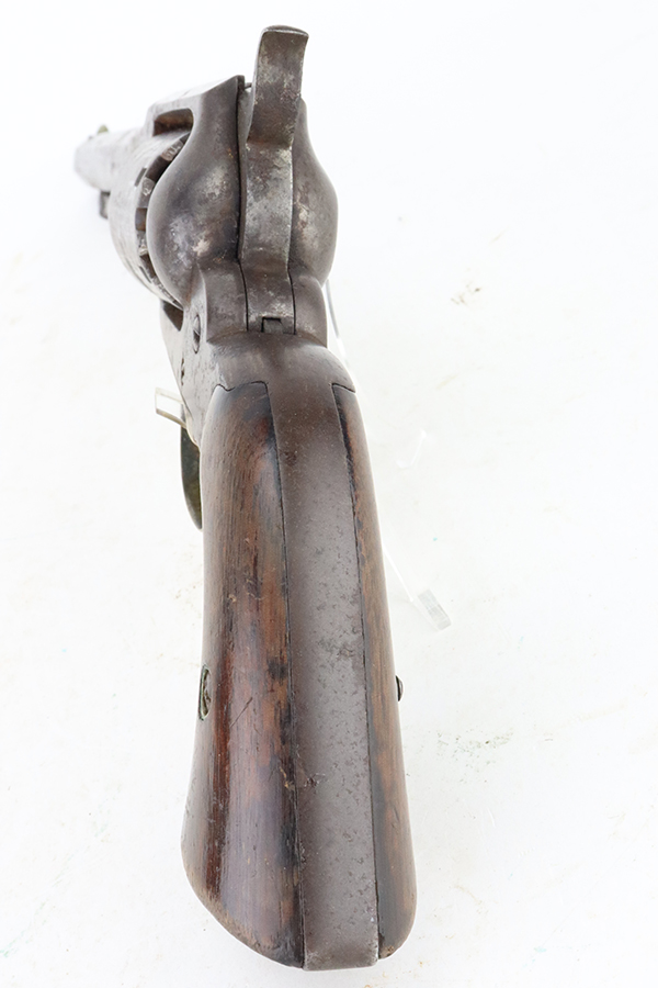 6/13/24 – This is a Remington-Beals Model 1858 Revolver from the Civil War. The Remington is a single-action, six-shot, percussion revolver produced by E. Remington & Sons, Ilion, N.Y., based on the Fordyce Beals patent of September 14, 1858 (Patent 21,478). The Remington Army revolver is large-framed revolver in .44 caliber with an 8-inch barrel length. The Remington Navy revolver is slightly smaller framed than the Army and in .36 caliber with a 7.375 inch [Beals Navy 7.5 inch] barrel length. There were three progressive models made: the Remington-Beals Army & Navy (1860–1862), the 1861 Army & Navy (1862–1863), and the New Model Army & Navy (1863–1875). This is the Navy configuration with a 7.5 inch barrel and is chambered in .36 Caliber. The entire gun is covered in obvious brown “attic patina” and oxidation. Some light surface rust here and there. Some areas of pitting here and there, most noticeable on the cylinder. Fitted with period-correct wood grips. Poor bore. Fully functional.