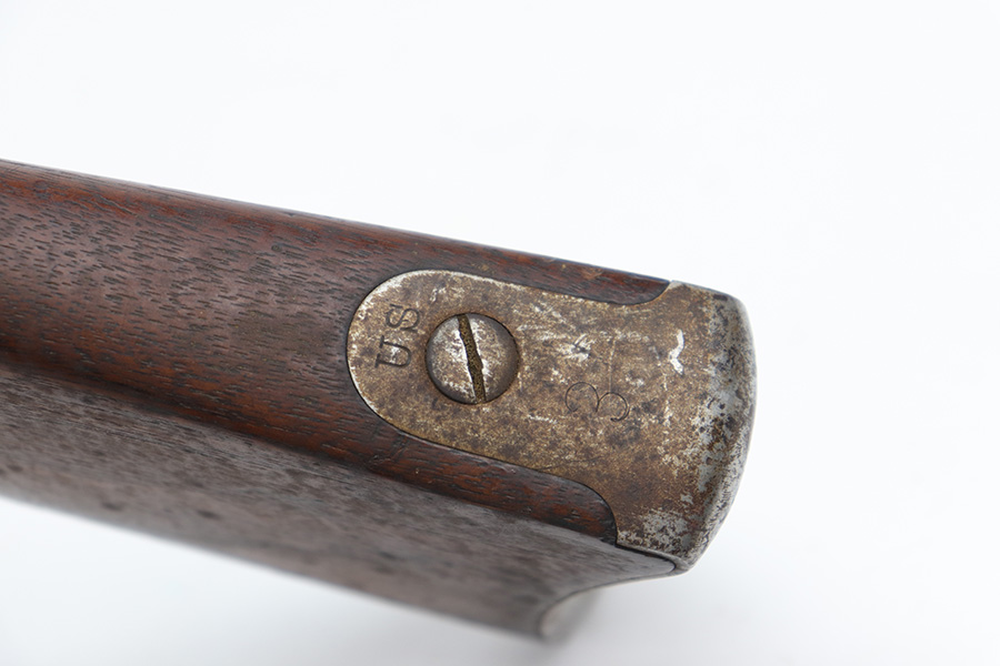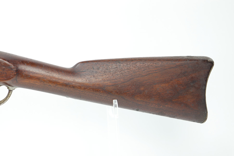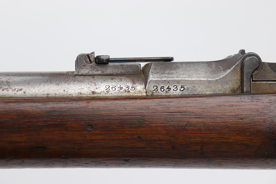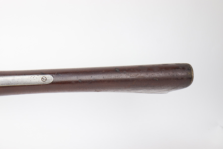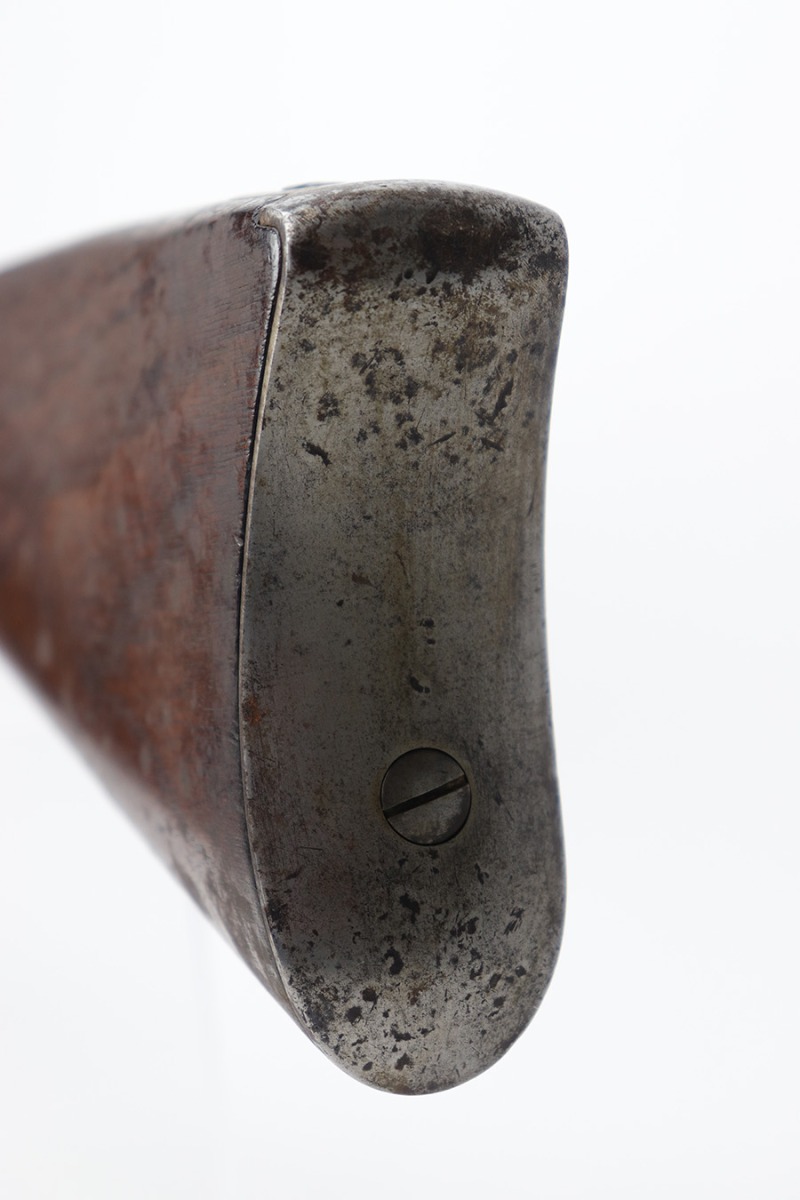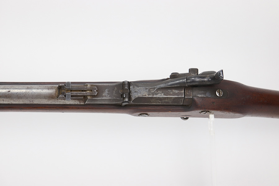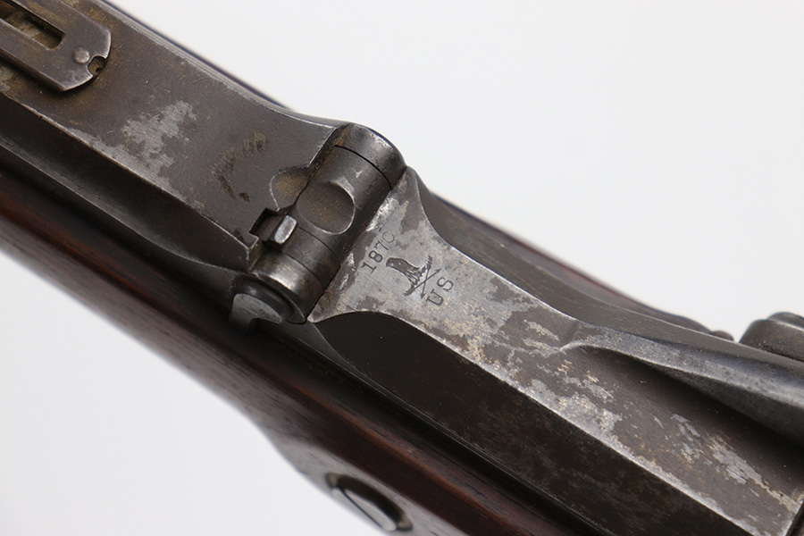 6/16/23 – This is a nice example of a Springfield Model 1863 Musket, dated 1863 on the lock plate. As evidenced by the “1870” date and US property marking on the breech, this particular rifle was converted to a Model 1868 musket in 1870. This conversion consisted of replacing the percussion lock with the breech-loading trapdoor mechanism, and relining the barrels to convert them from .58 to .50 caliber. Barrel and receiver have matching serial numbers. Three military cartouches on the left side of the stock. Overall, the musket is in fair condition, but there is virtually no finish on the metal parts. There is noticeable spotty oxidation and brown patina throughout and some light surface rust near the muzzle. Very nice wood stock with no major damage, just the usual signs of wear. Comes with an original cleaning rod. The bore is shiny for the most part with strong rifling, but there are some small spots of oxidation here and there.
