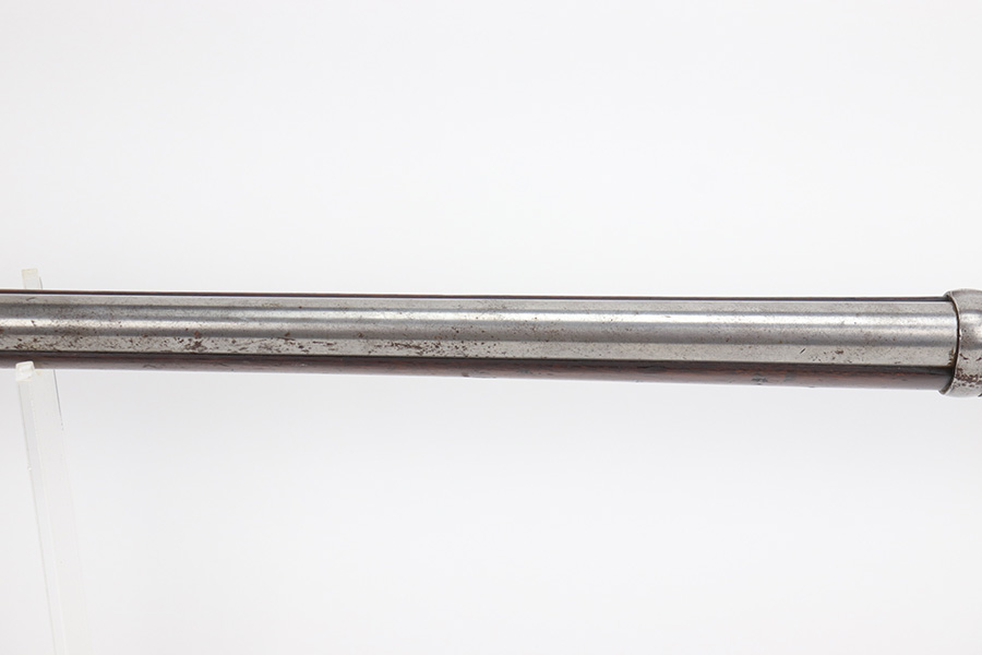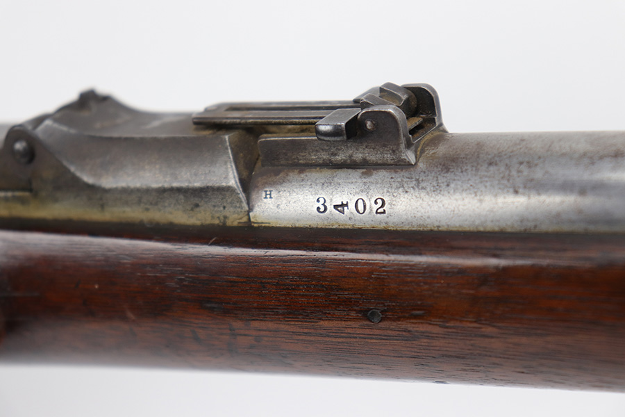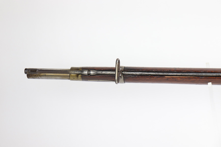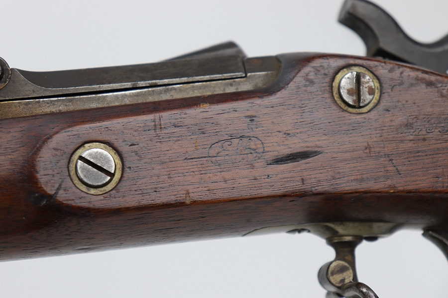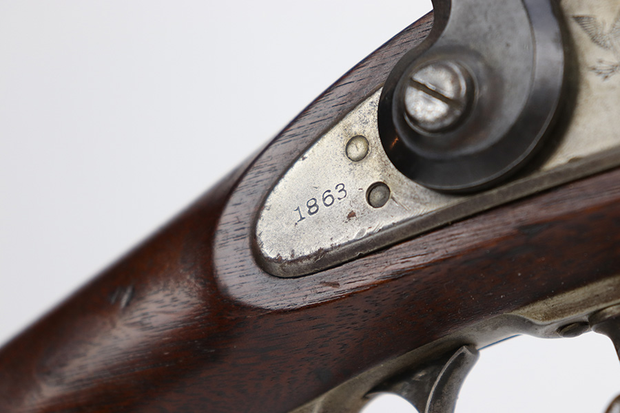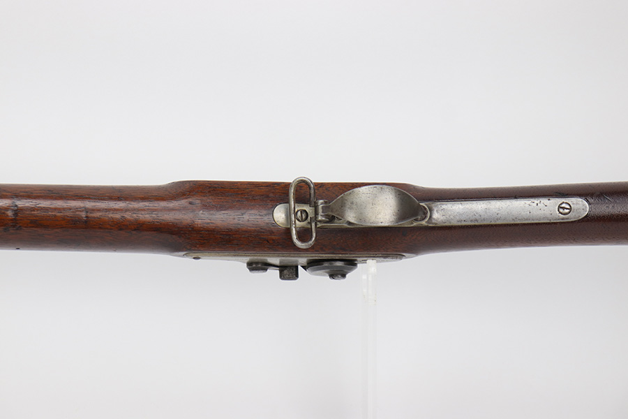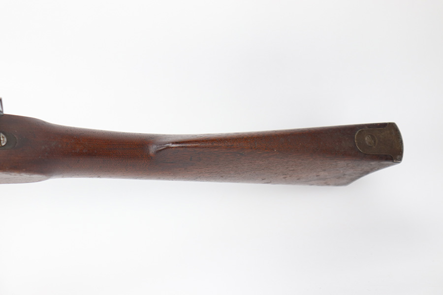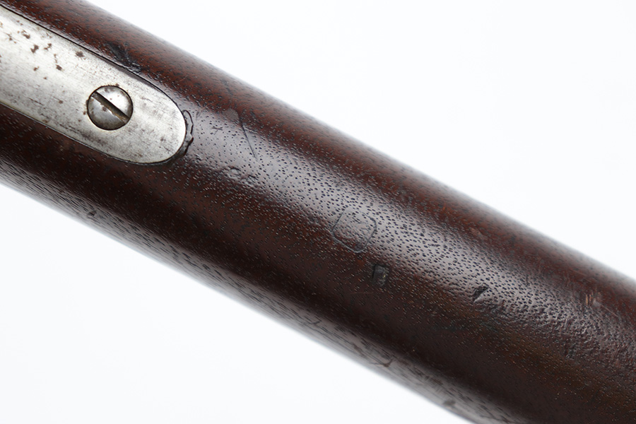 6/16/23 – This is a nice example of a Springfield Model 1863 Musket, dated 1863 on the lock plate. As evidenced by the “1870” date and US property marking on the breech, this particular rifle was converted to a Model 1868 musket in 1870. This conversion consisted of replacing the percussion lock with the breech-loading trapdoor mechanism, and relining the barrels to convert them from .58 to .50 caliber. Barrel and receiver have matching serial numbers. Three military cartouches on the left side of the stock. Overall, the musket is in fair condition, but there is virtually no finish on the metal parts. There is noticeable spotty oxidation and brown patina throughout and some light surface rust near the muzzle. Very nice wood stock with no major damage, just the usual signs of wear. Comes with an original cleaning rod. The bore is shiny for the most part with strong rifling, but there are some small spots of oxidation here and there.