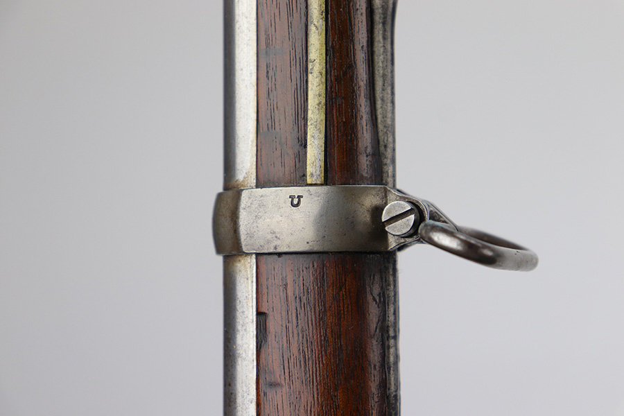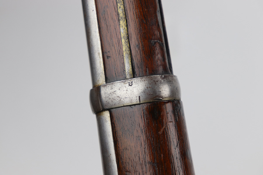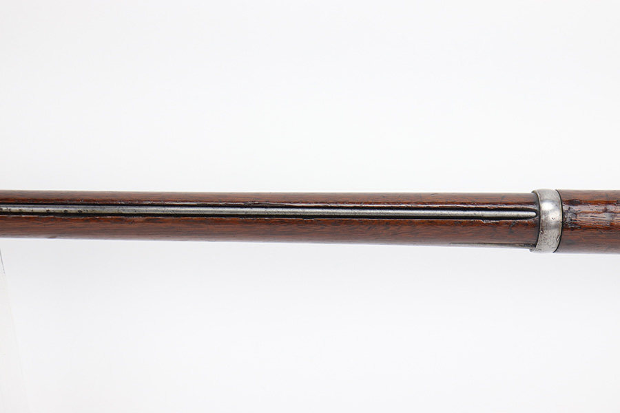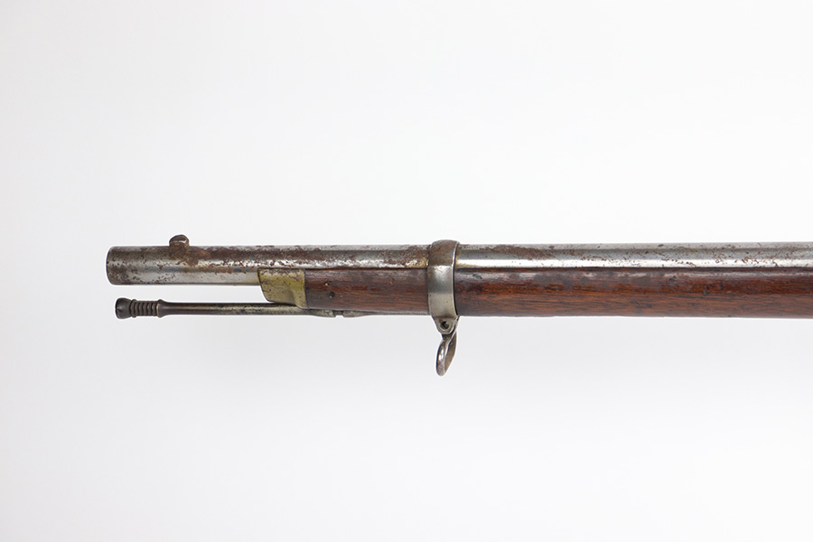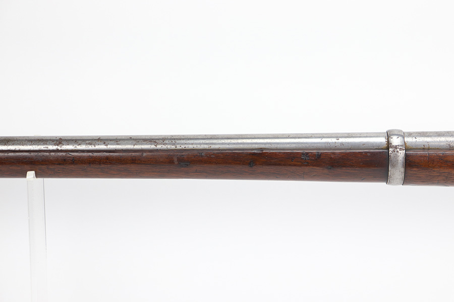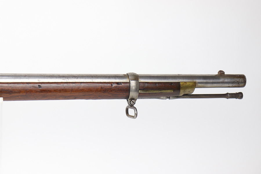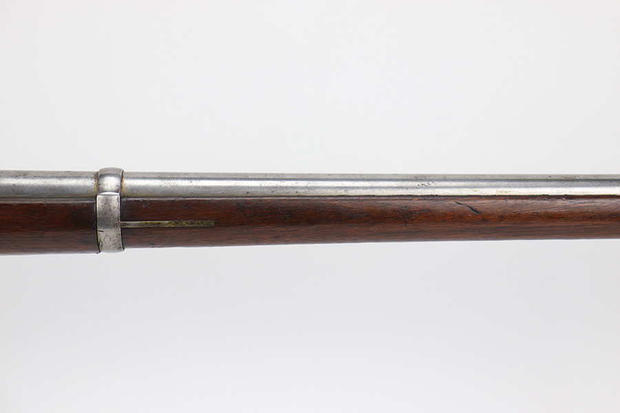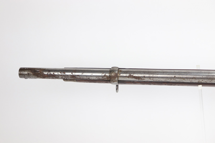 6/16/23 – This is a nice example of a Springfield Model 1863 Musket, dated 1863 on the lock plate. As evidenced by the “1870” date and US property marking on the breech, this particular rifle was converted to a Model 1868 musket in 1870. This conversion consisted of replacing the percussion lock with the breech-loading trapdoor mechanism, and relining the barrels to convert them from .58 to .50 caliber. Barrel and receiver have matching serial numbers. Three military cartouches on the left side of the stock. Overall, the musket is in fair condition, but there is virtually no finish on the metal parts. There is noticeable spotty oxidation and brown patina throughout and some light surface rust near the muzzle. Very nice wood stock with no major damage, just the usual signs of wear. Comes with an original cleaning rod. The bore is shiny for the most part with strong rifling, but there are some small spots of oxidation here and there.