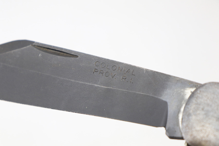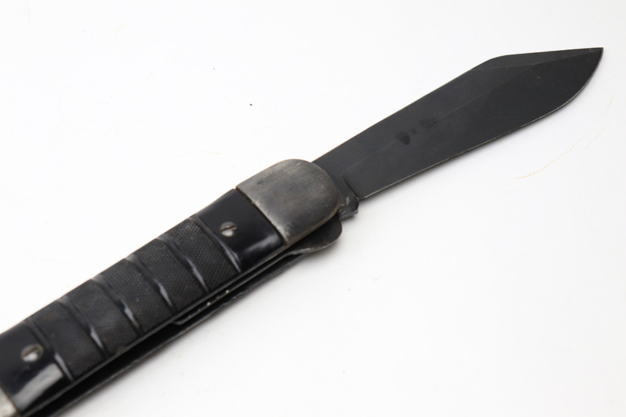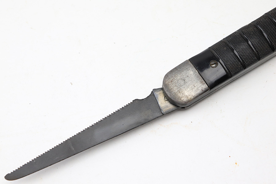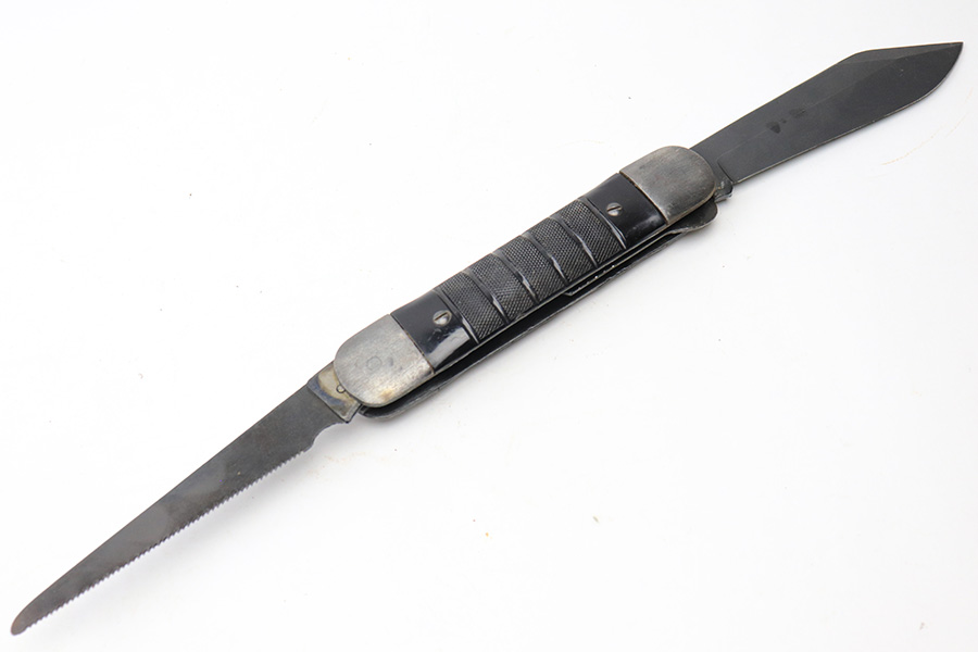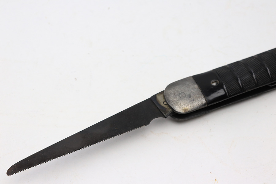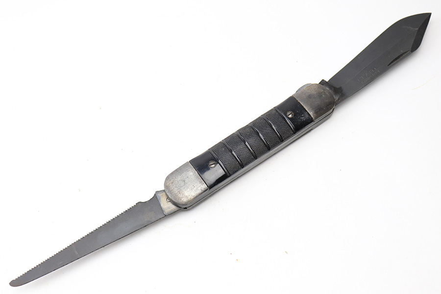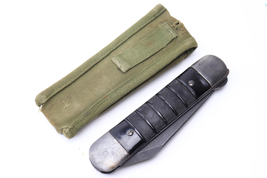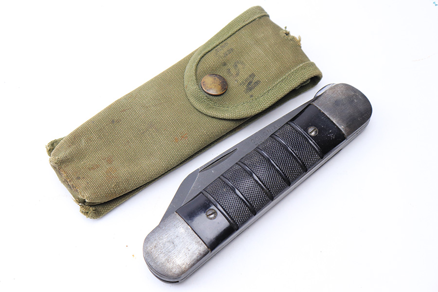 6/2/22 – This is an original WW2 era USN survival folding knife. The knife unfolds two different style blades, both of which are in great condition. The non-serrated knife is maker stamped by Colonial. Folds and unfolds without issue and smooth action. Comes with a canvas “USN” ink stamped carrying case.