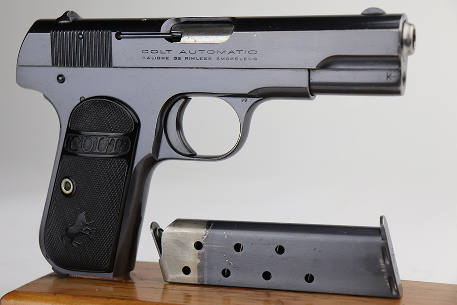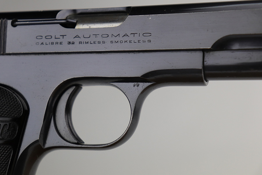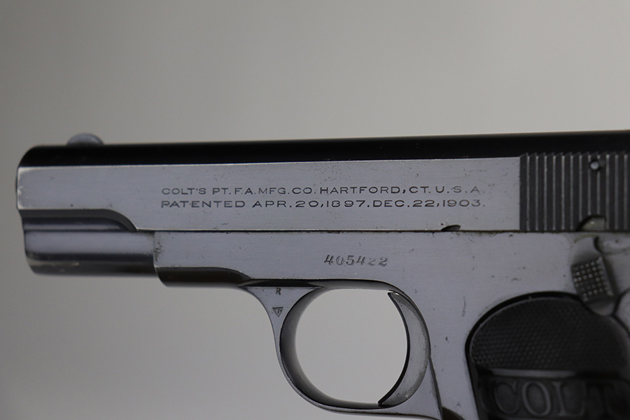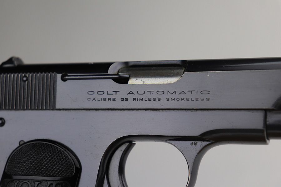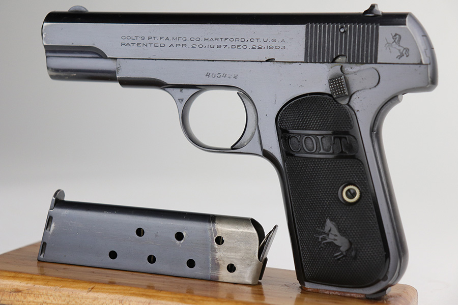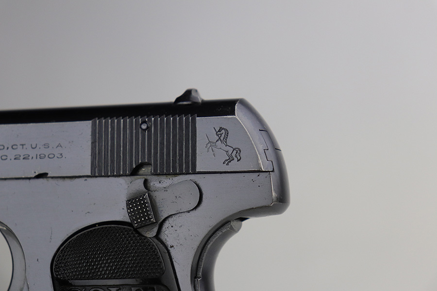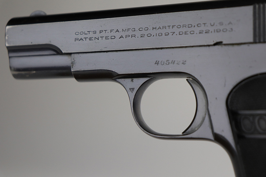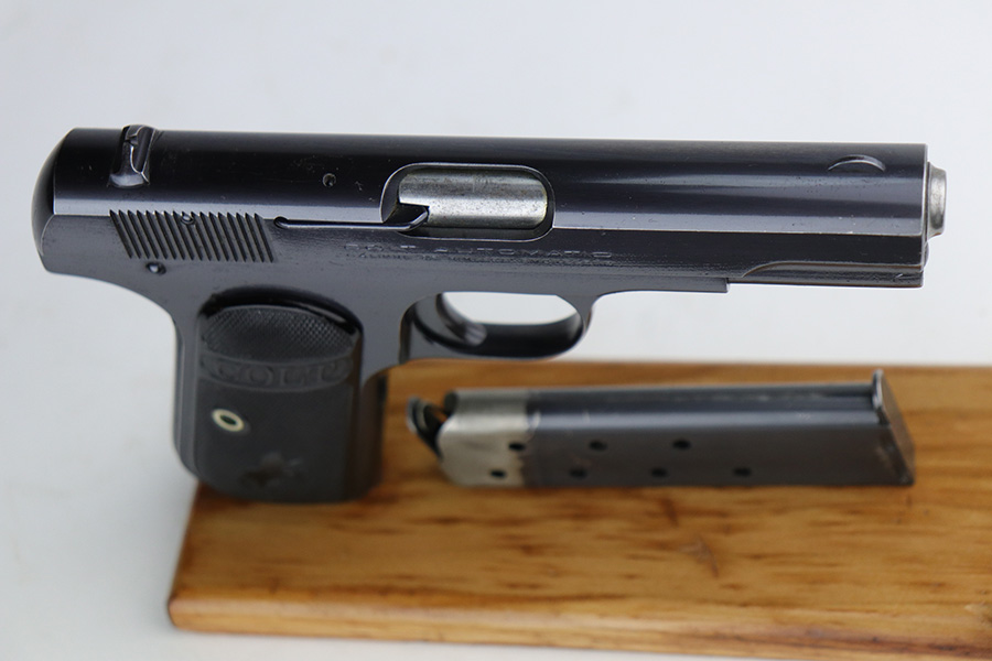 8/23/21 – This is an excellent and original Colt Model 1903 from 1922. The original high-polish blue rates at 95+% with most of the wear on the left side of the muzzle and underside of slide, and a little more on the grip safety. Beautiful bore with minimal signs of use. Minty grips with no cracks or chips. Excellent two-tone magazine.
