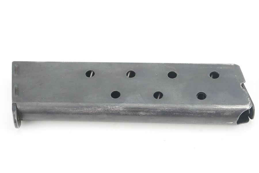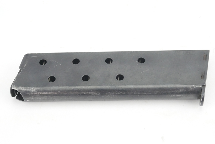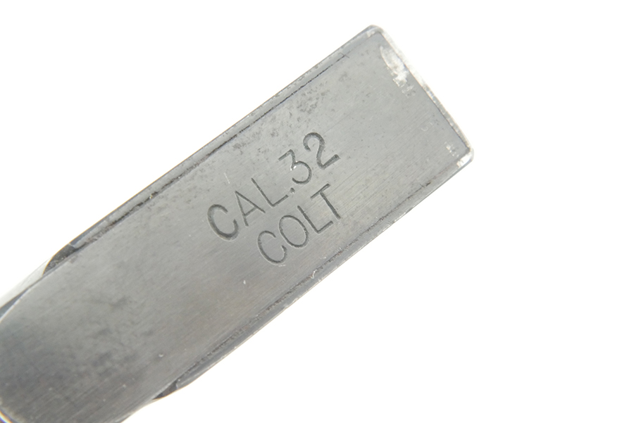 9/9/24 – This is an excellent example of an original Colt 1903 magazine. This magazine maintains almost all of it’s original bluing on the magazine tube. There is some finish thinning and loss in areas consistent with standard use. The magazine has very fine pinpricking throughout. The base plate of the magazine is also in excellent condition, with just minor marks from the magazine release from standard use. The base plate is stamped “CAL .32 COLT” and is easily legible. The spring in this magazine is still very strong.