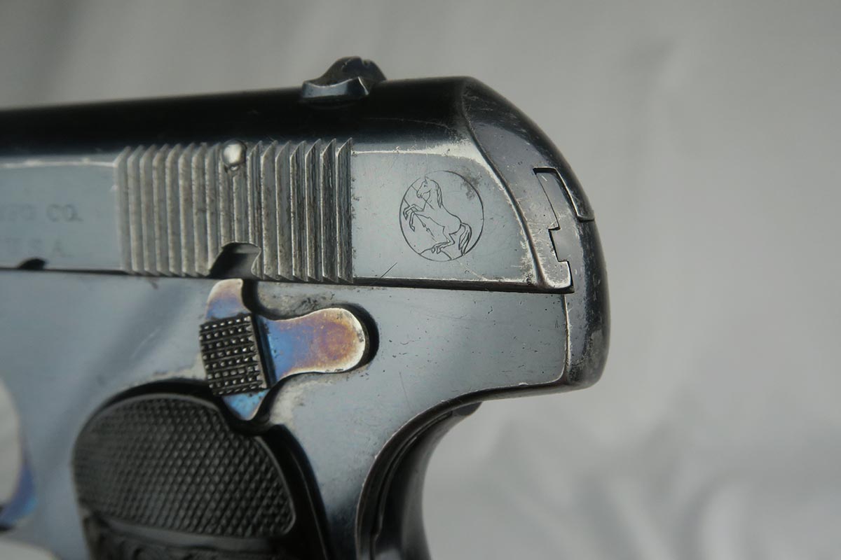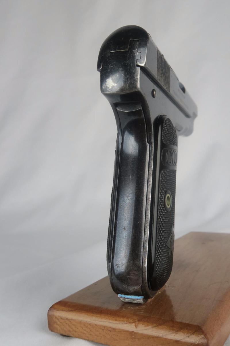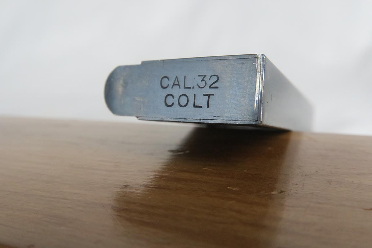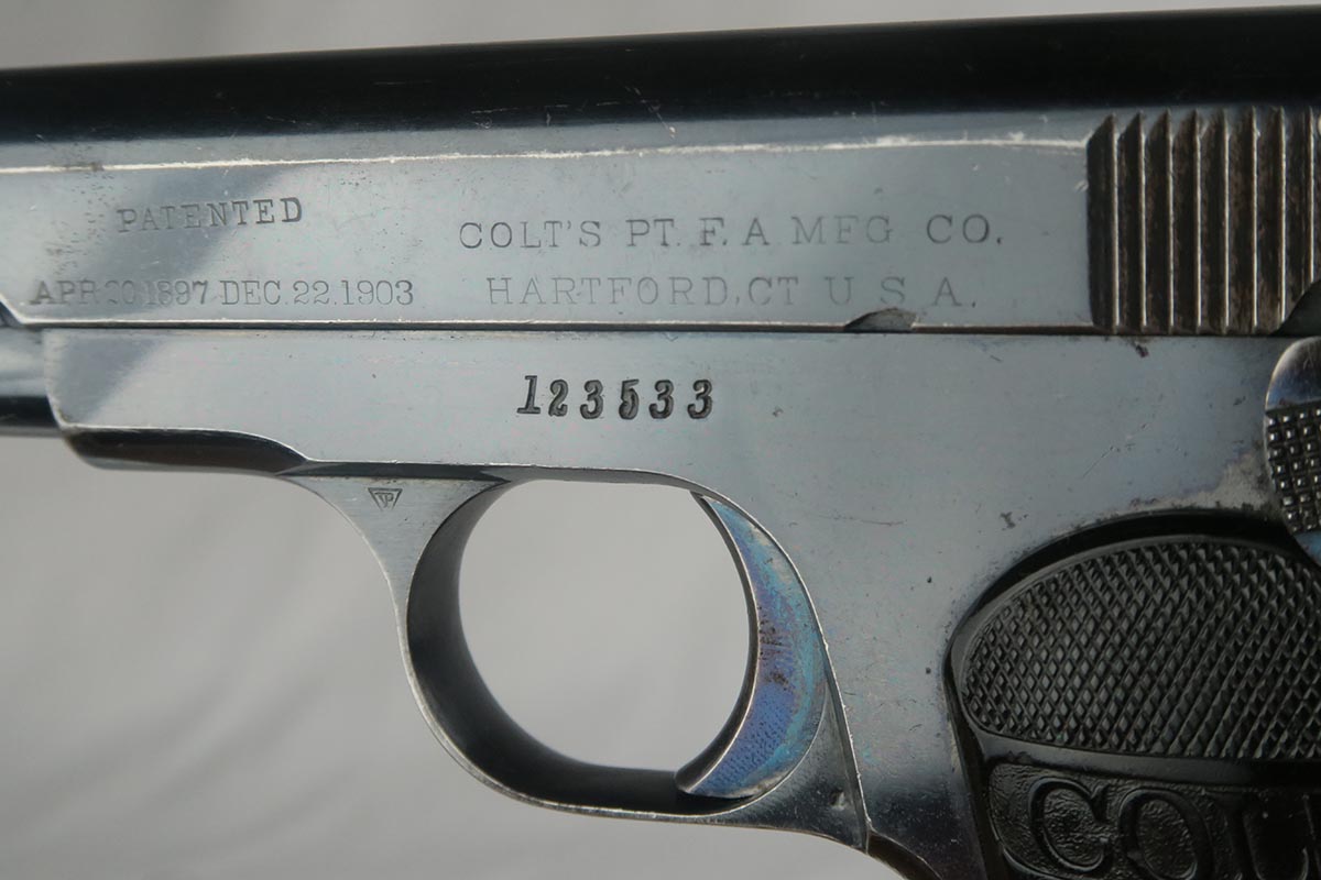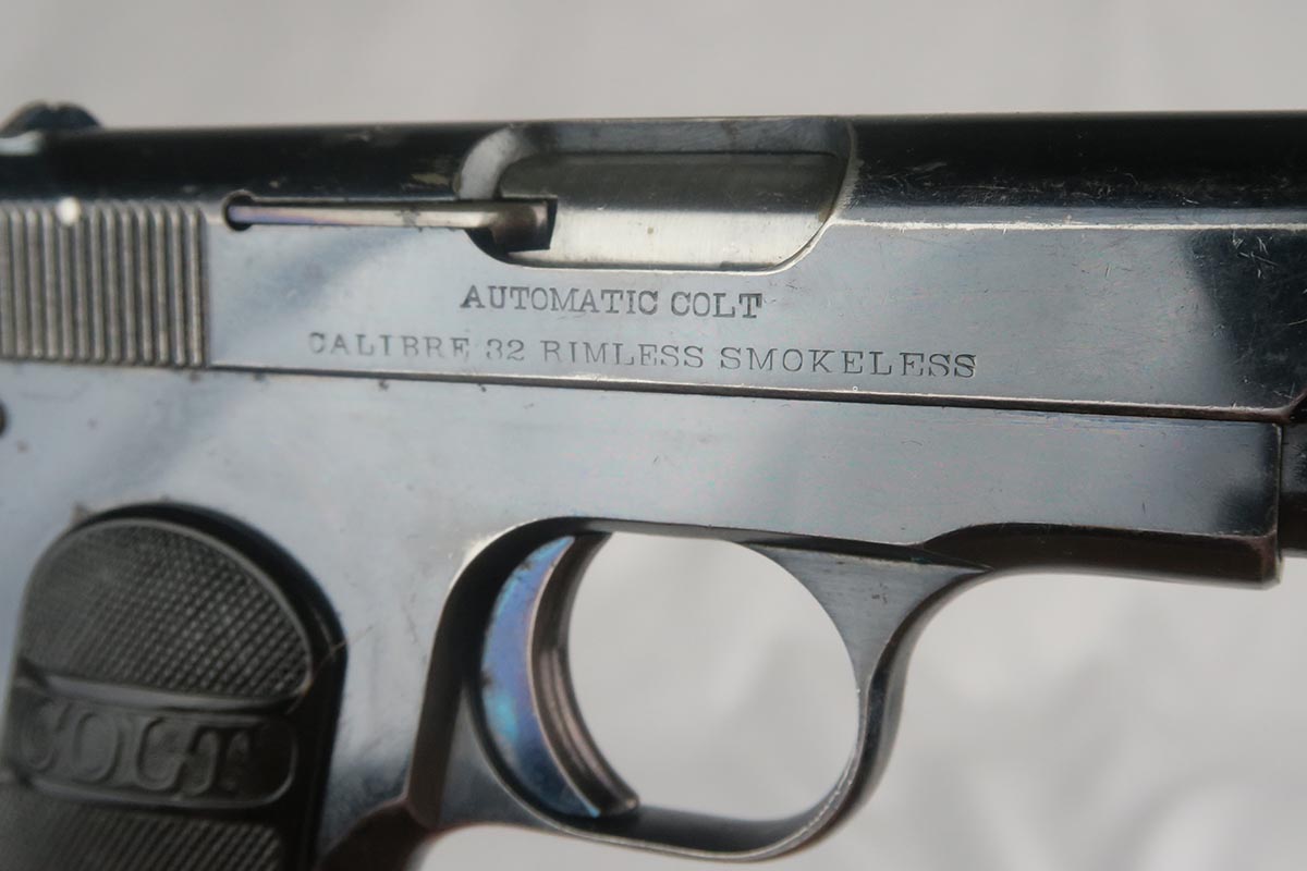 1/16/18 – This is an all original and correct Colt model 1903 that was manufactured in 1911. The high-polish blue rates at about 85-90% with finish loss on most of the high points. The grips are in very good condition with no cracks or chips. Nice fire blue on trigger and safety. Magazine is marked CAL .32 COLT. Excellent bore.