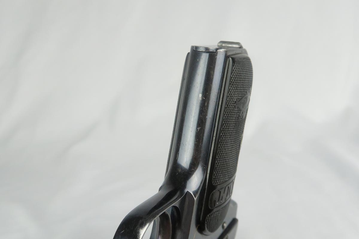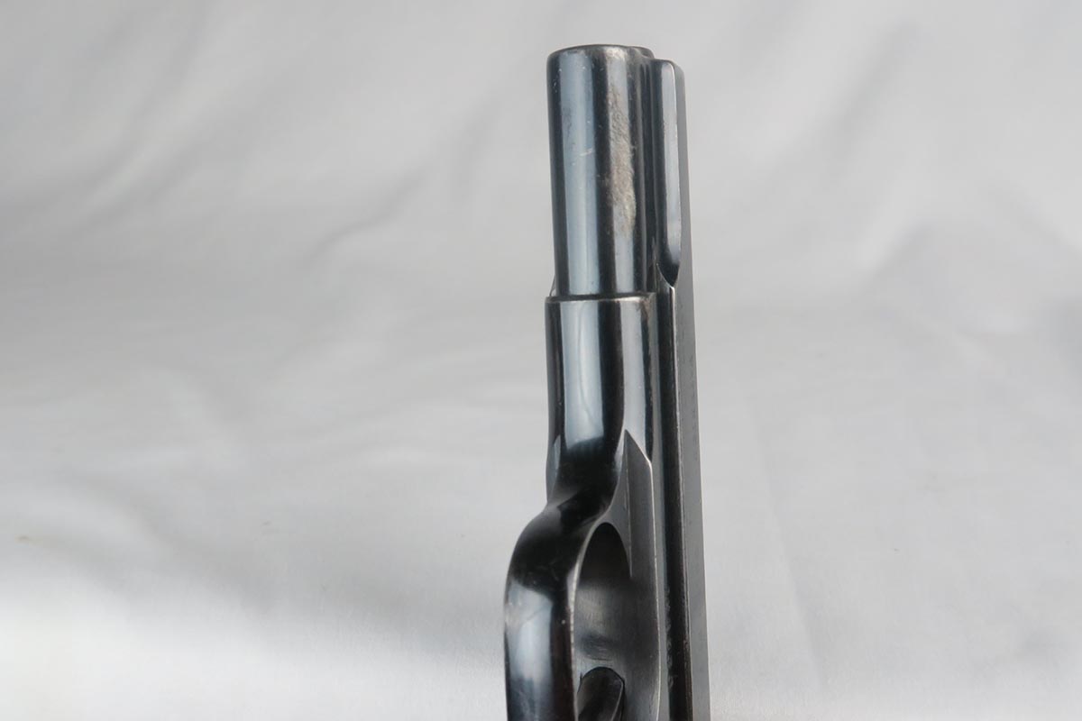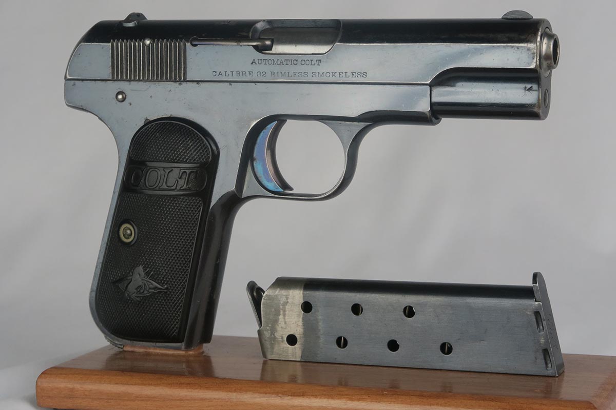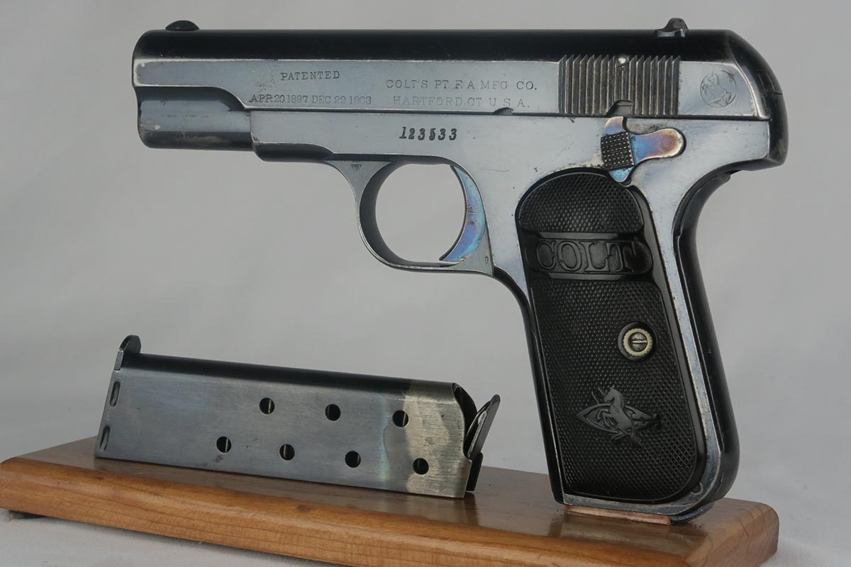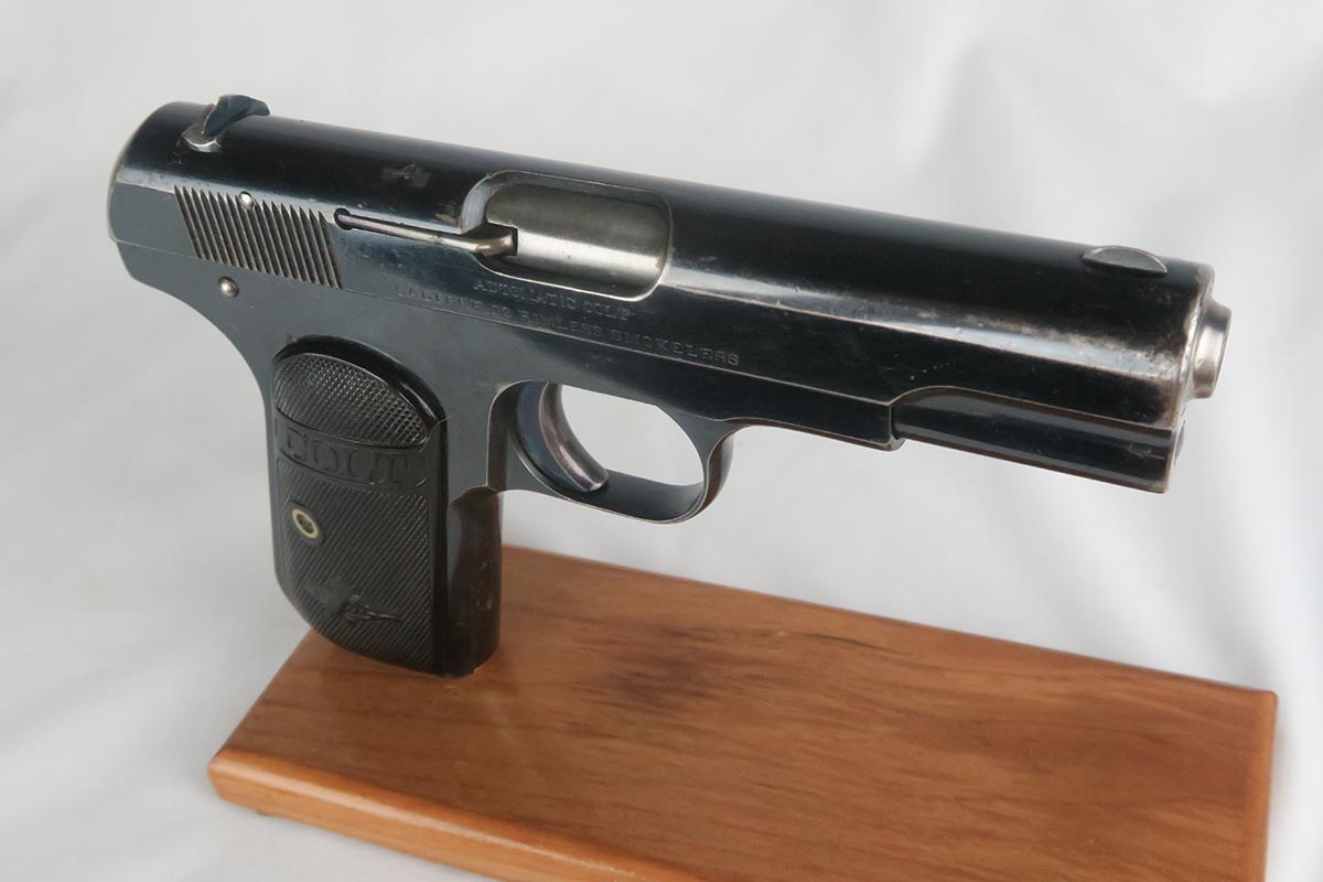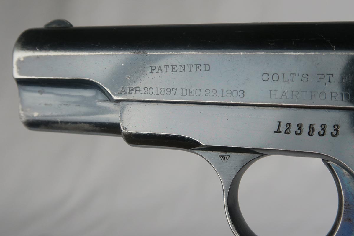 1/16/18 – This is an all original and correct Colt model 1903 that was manufactured in 1911. The high-polish blue rates at about 85-90% with finish loss on most of the high points. The grips are in very good condition with no cracks or chips. Nice fire blue on trigger and safety. Magazine is marked CAL .32 COLT. Excellent bore.