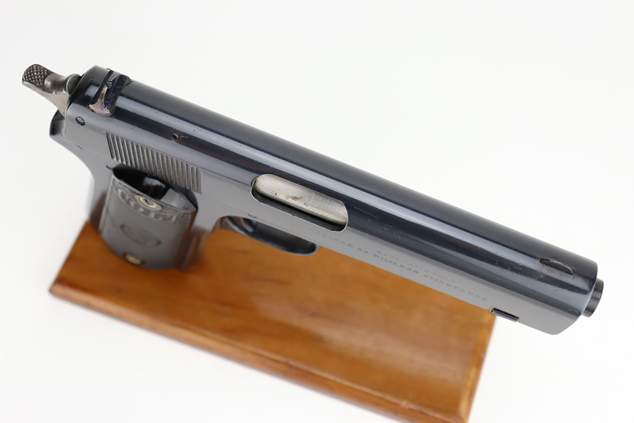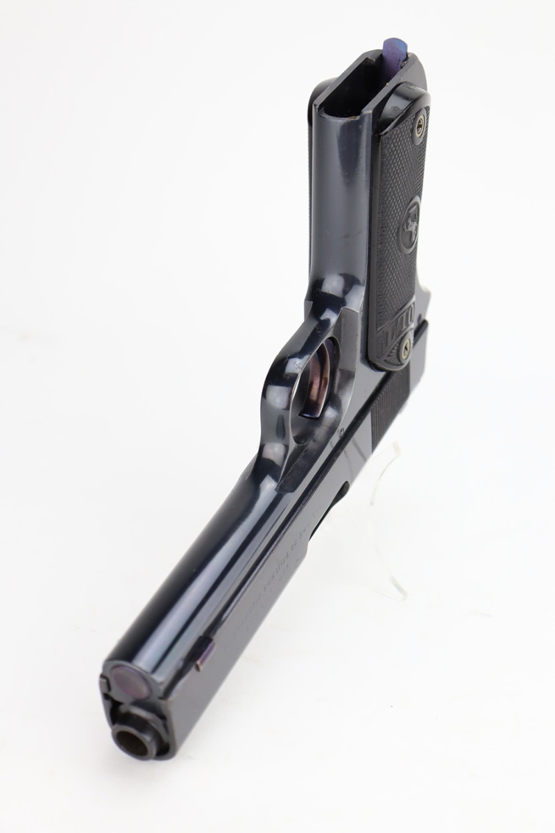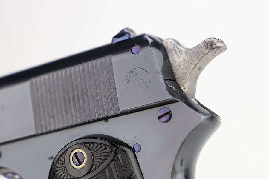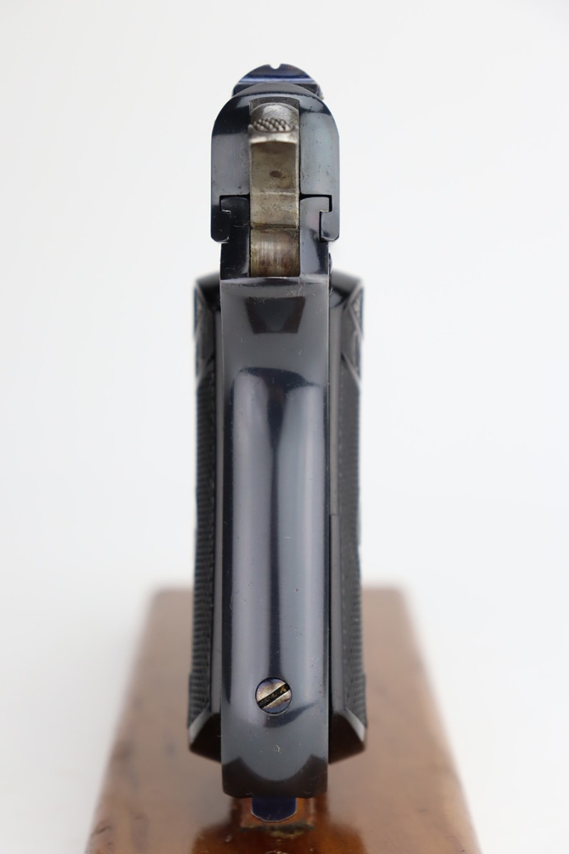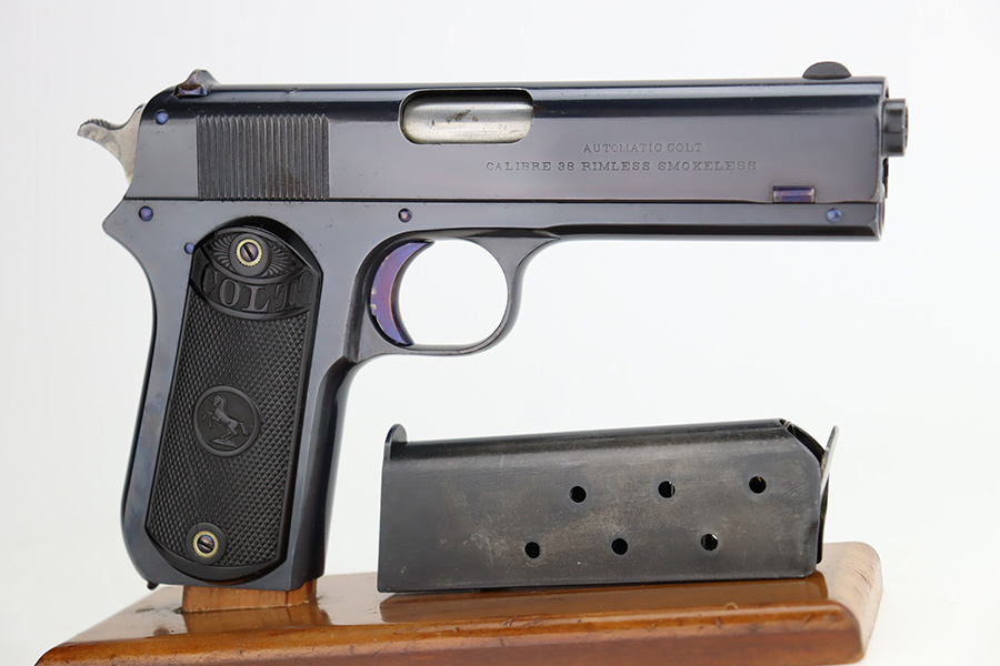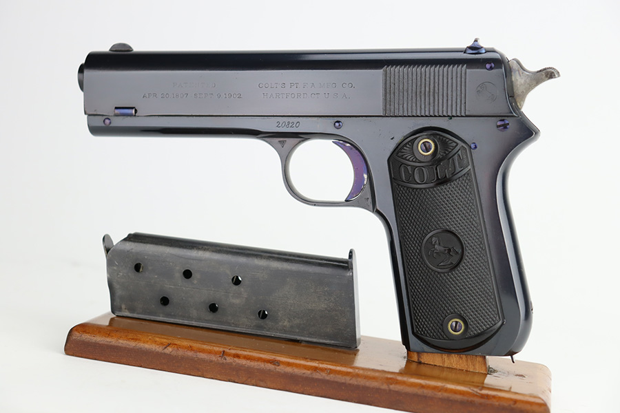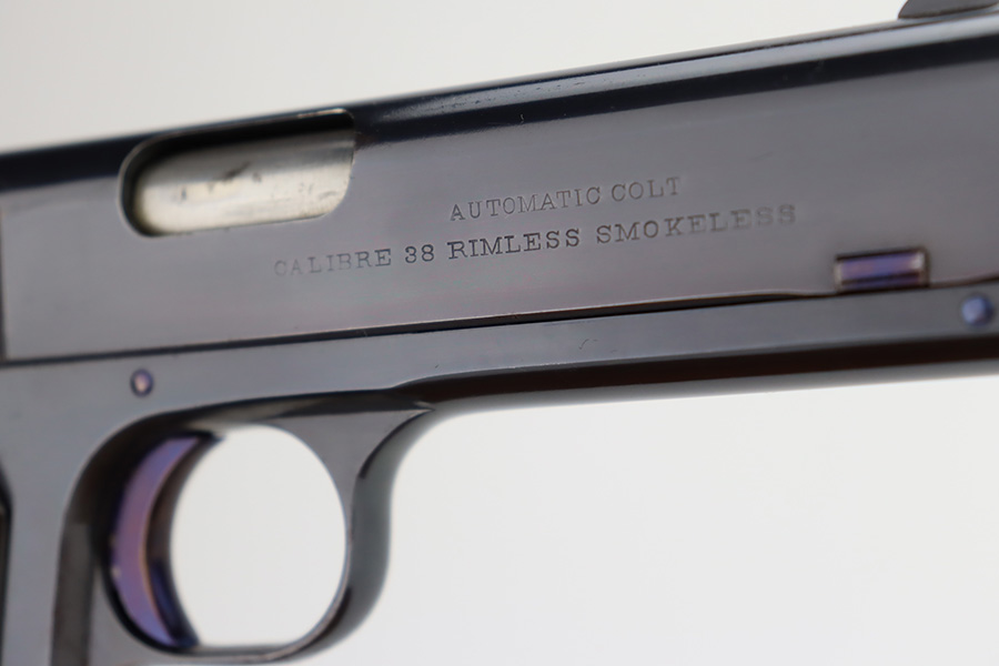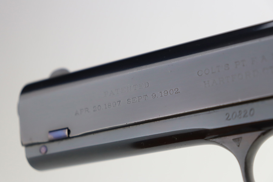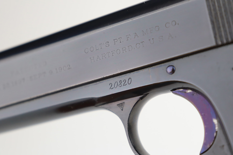 11/29/23 – This is a near-mint Colt 1903 Pocket Hammer that was manufactured in 1908. It has 98-99% of the blue remaining with just a little wear on the trigger guard, and some age/oxidation on the hammer. Beautiful fire blue on the trigger. Nice, original Colt grips with just a small crack in the bottom of the right panel. Unmarked, blued mag. Bore shows some frost and freckling throughout.
