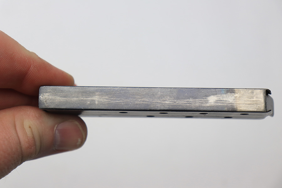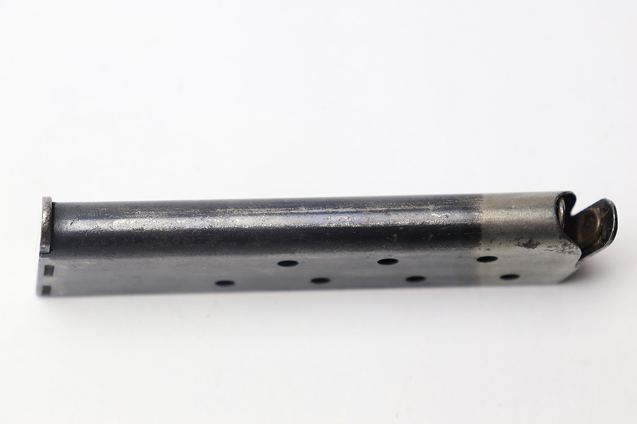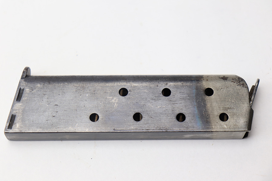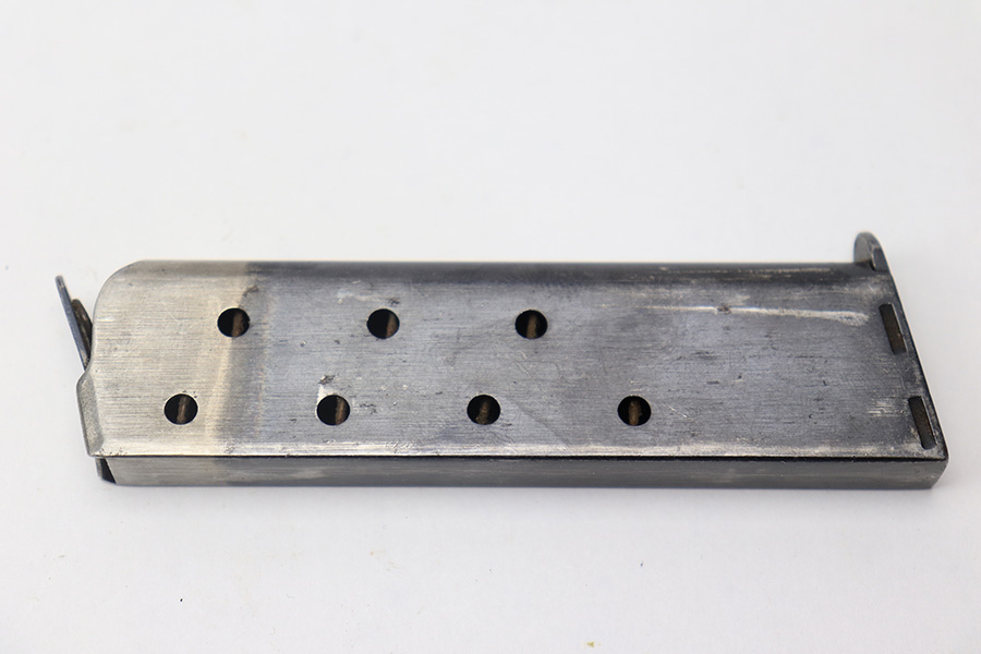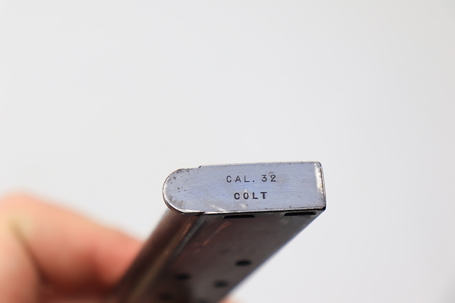 3/31/22 – This is a great example of a Colt 1908 magazine. The magazine is dual tone, retaining a majority of its blued finish where it was meant to be, showing only minor signs of scratchy wear throughout. The magazine base plate is marked “Cal. 32 COLT”. The follower and spring are functional.
