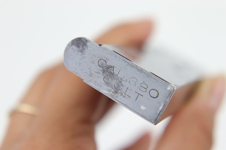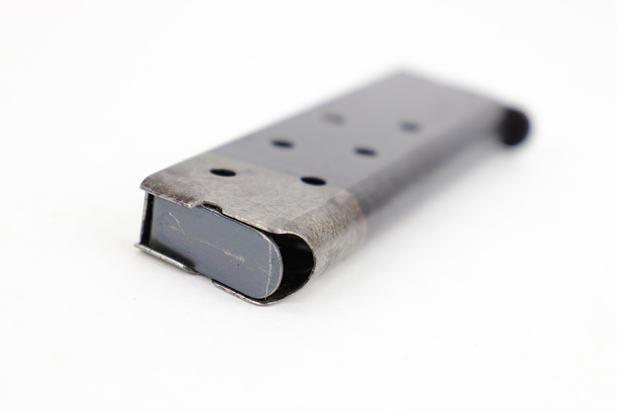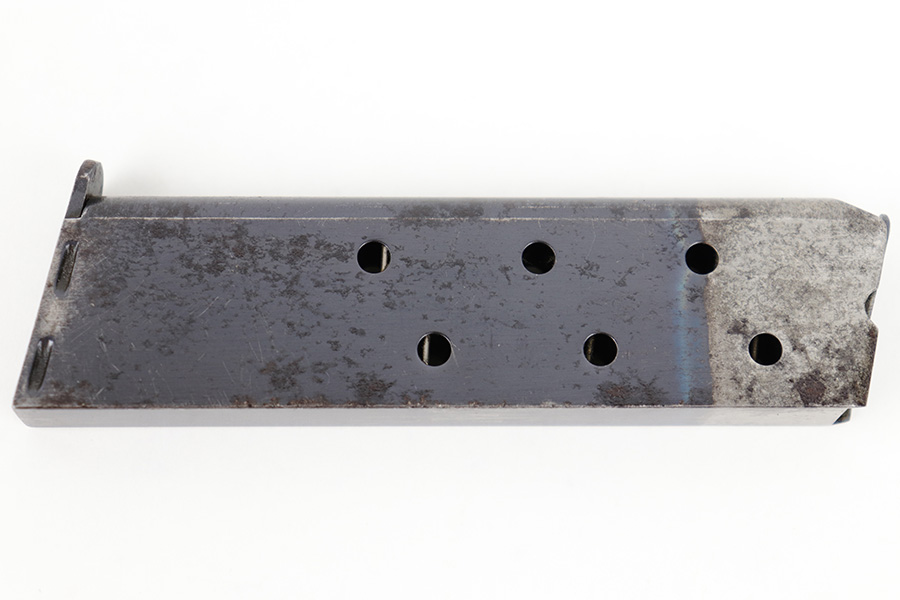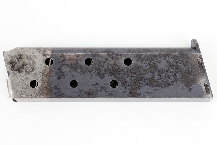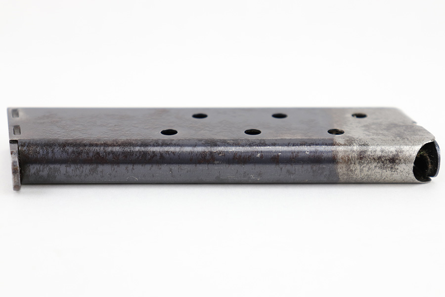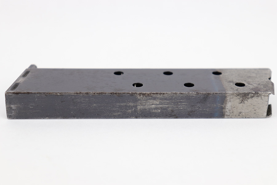 6/23/23 – This is an original, early production Colt M1908 magazine in .380. The magazine has a dual tone finish with most of the bluing intact. The right side of the magazine has dark patina throughout the finish, however. This surface patina is rough to the touch, whereas the rest of the wear throughout the magazine is more mild. None of the wear affects functionality. The spring is strong and smooth. The base of the magazine is marked “Colt .380 Auto”.