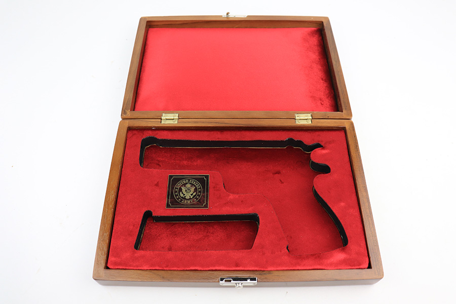 4/20/22 – This is an excellent custom-made wood display case for a Colt 1911 pistol. The inside of the case is lined with foam and blue velvet. (Note the photos show red velvet, but the example we have in stock is blue velvet). The case has room to store a 1911 pistol and extra magazine as soon. Note, the gun photographed is not included with the case.