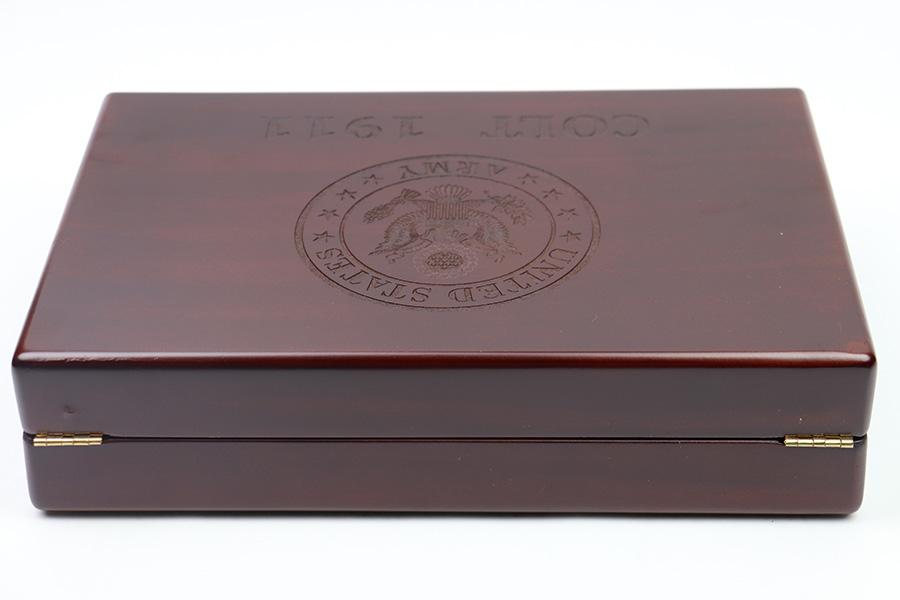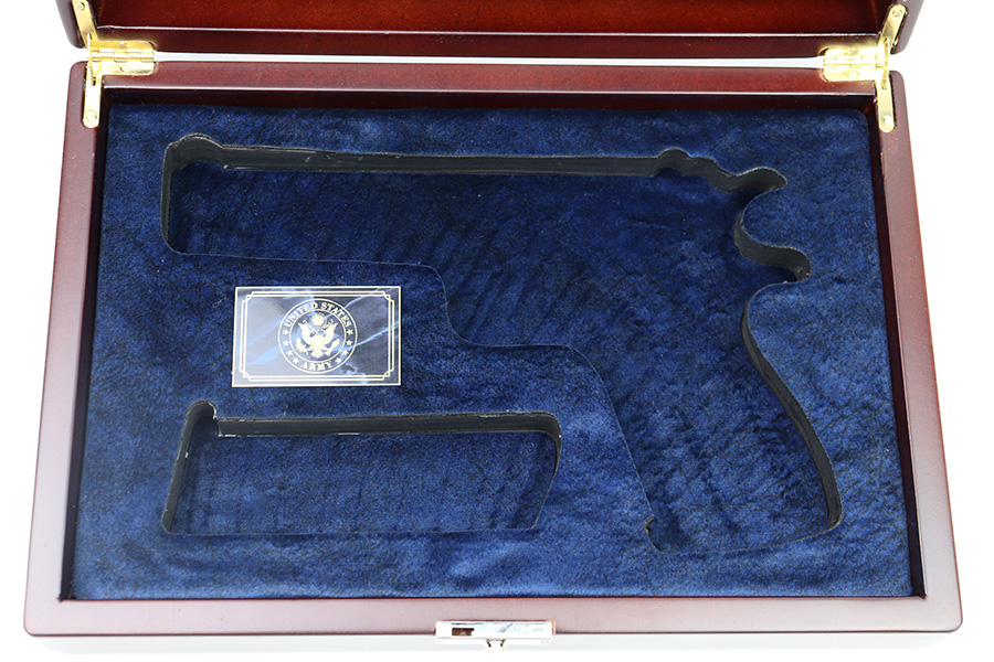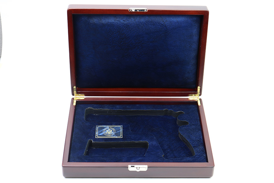 3/13/23 – This is a dark brown display case for a Colt model 1911 pistol. The case is approximately 11.25 x 7.75 x 2.5 inches. The blue velvet interior is cushioned for excellent storage as well as display. Excellent condition.