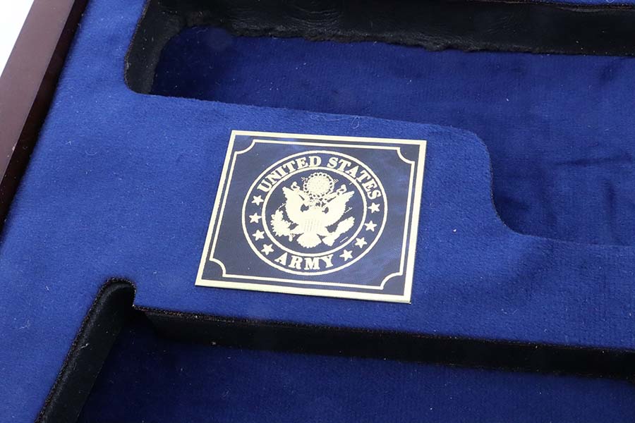 3/19/24 – This is a dark brown display case for a Colt model 1911 pistol. The case is approximately 11.25 x 7.75 x 2.5 inches. The blue velvet interior is cushioned for excellent storage as well as display. Excellent condition with just some very light surface scratches here and there. The closure clasp is a bit tight.