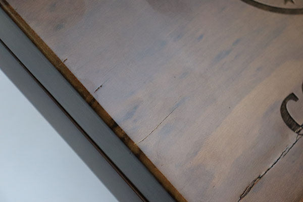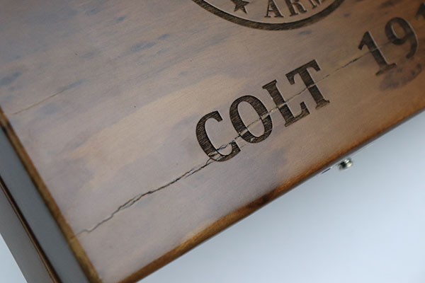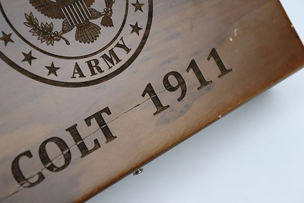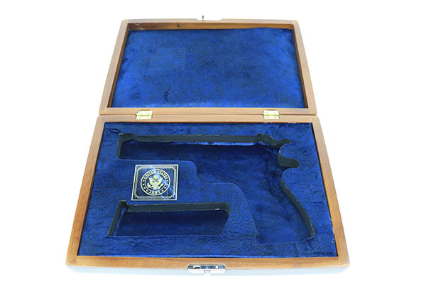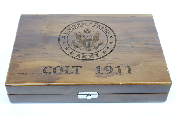 10/3/22 – This is a custom-made wood display case for a Colt 1911 pistol. The inside of the case is lined with foam and blue velvet. The case has room to store a 1911 pistol and extra magazine as well. The gun photographed is not included with the case. Note, as shown in the photographs the lid of the case is cracked and damaged, this crack does appear to be cosmetic and does not impede function.
