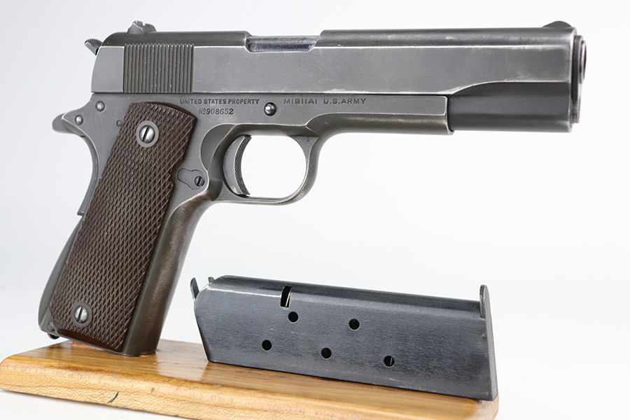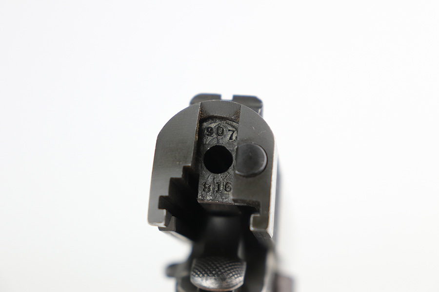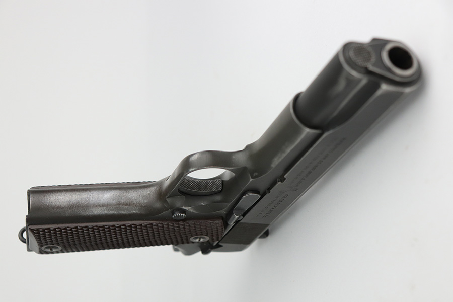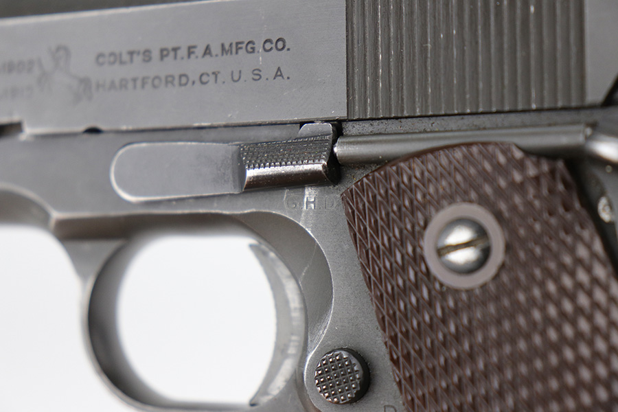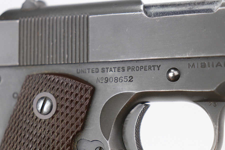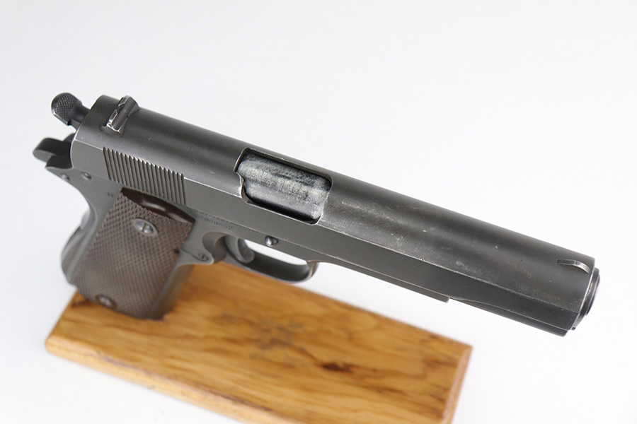 4/11/22 – This is a nice Colt 1911A1 that was made in 1943 and issued to the US Army. The finish is original but the slide and frame are mismatched, less than 1,000 digits off from each other. It’s not an arsenal re-work example but presumably didn’t leave the factory together, even though the finish is congruent throughout. Standard high edge wear on slide and front of frame, but largest area of wear is the front strap. Colt barrel with large ‘G’ marking. Bore has strong rifling but a little freckling in the grooves. Excellent grips. Postwar, unmarked mag.