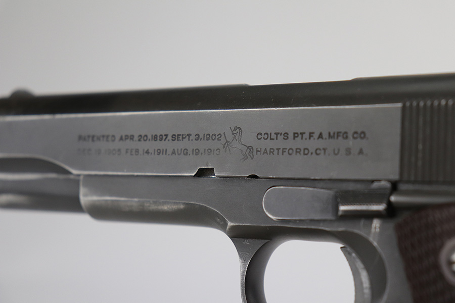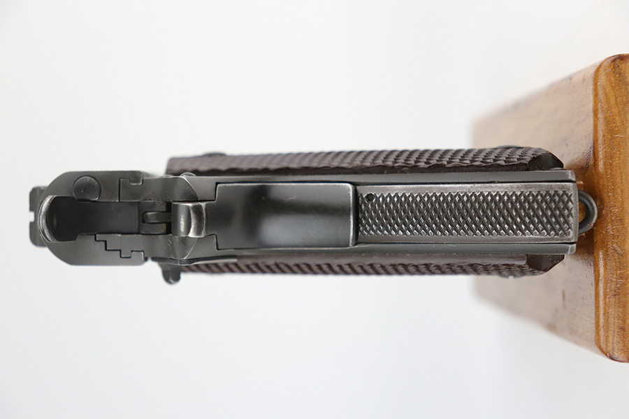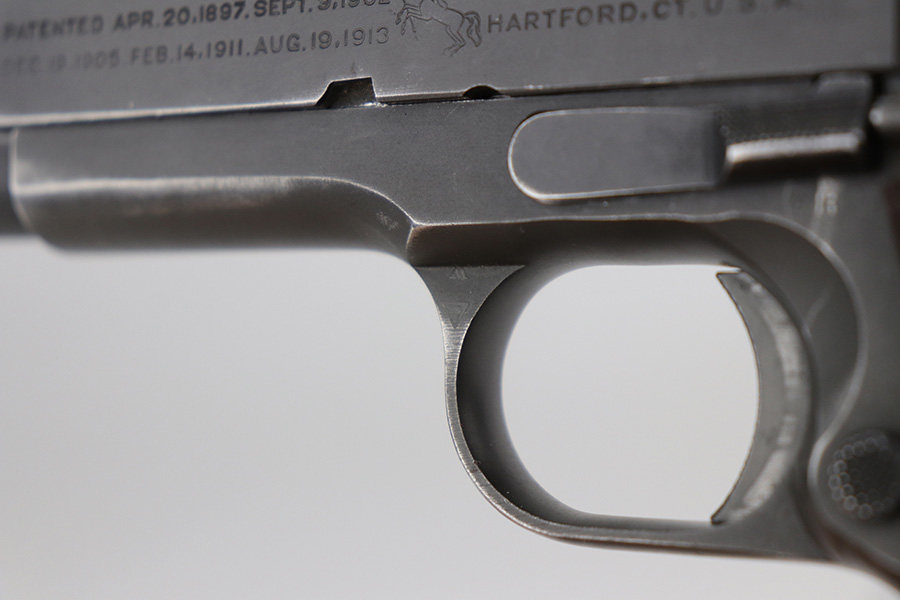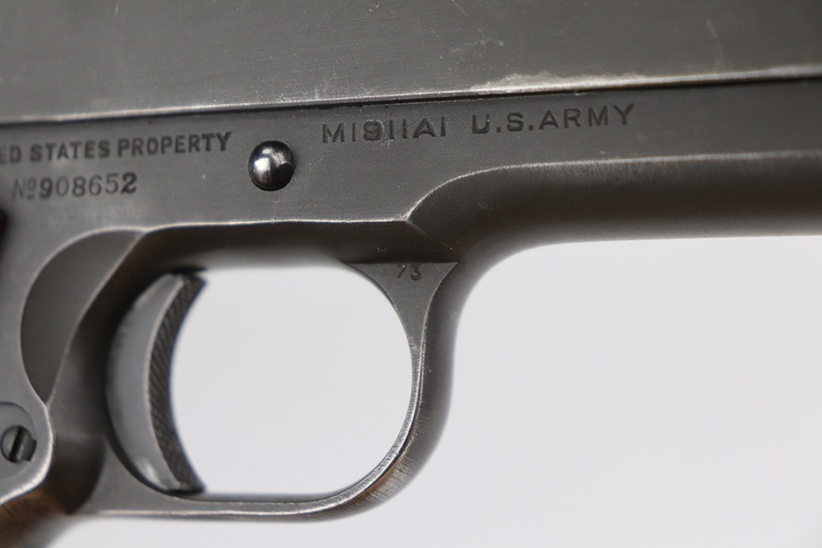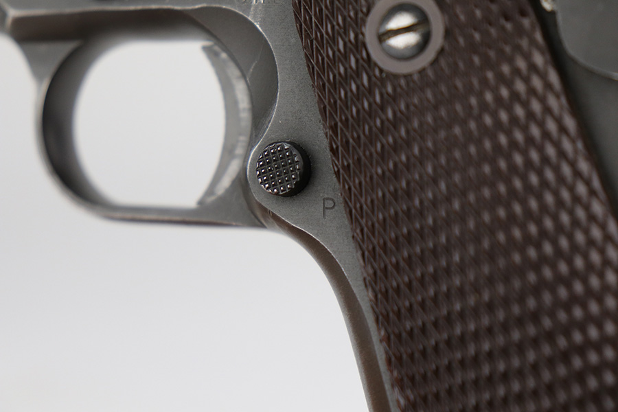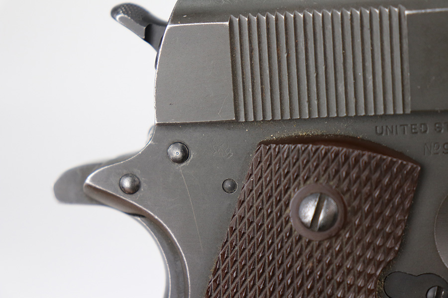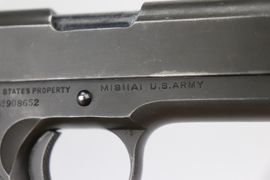 4/11/22 – This is a nice Colt 1911A1 that was made in 1943 and issued to the US Army. The finish is original but the slide and frame are mismatched, less than 1,000 digits off from each other. It’s not an arsenal re-work example but presumably didn’t leave the factory together, even though the finish is congruent throughout. Standard high edge wear on slide and front of frame, but largest area of wear is the front strap. Colt barrel with large ‘G’ marking. Bore has strong rifling but a little freckling in the grooves. Excellent grips. Postwar, unmarked mag.