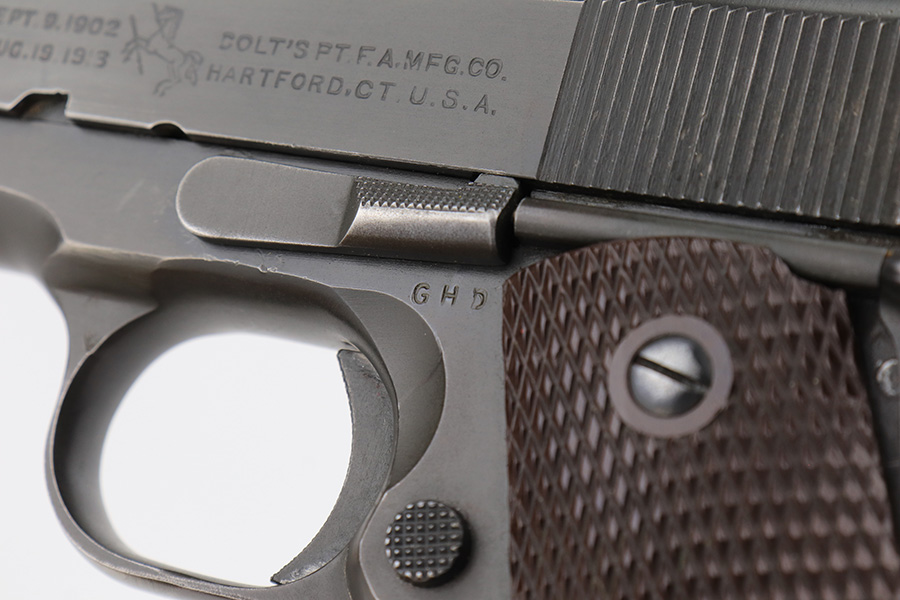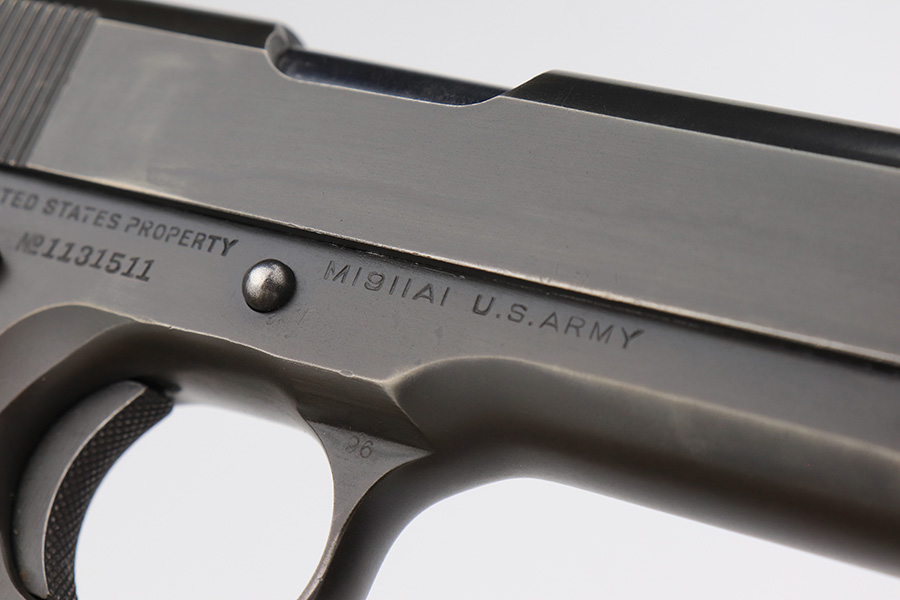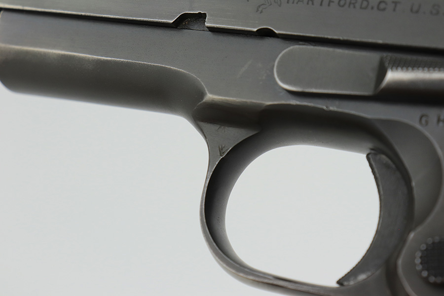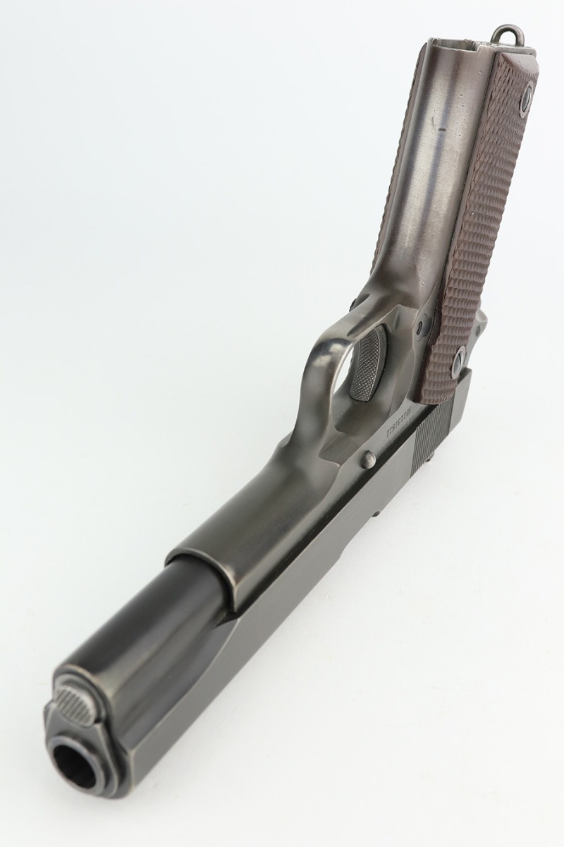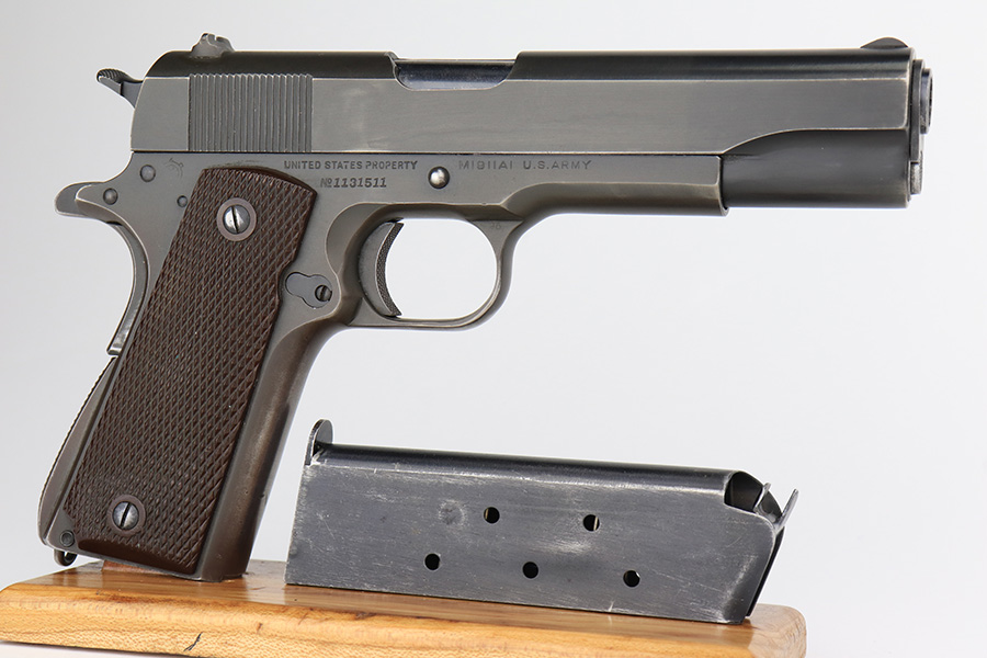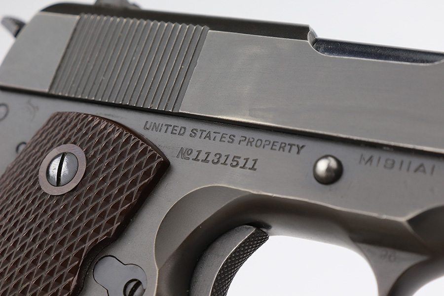 2/10/23 – This is a nice example of an original Army-issued Colt 1911A1 from 1943. All original with the matching numbered slide and frame. Original Colt barrel with large ‘G’ under lug. The pistol has a very nice profile but nearly all of the finish loss is on the front strap. Excellent grips with only minor handling wear. The bore has strong rifling but there is some freckling throughout the grooves. Unmarked magazine.