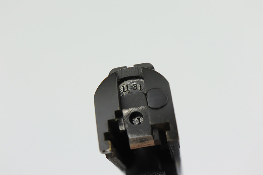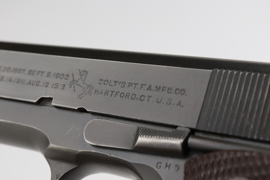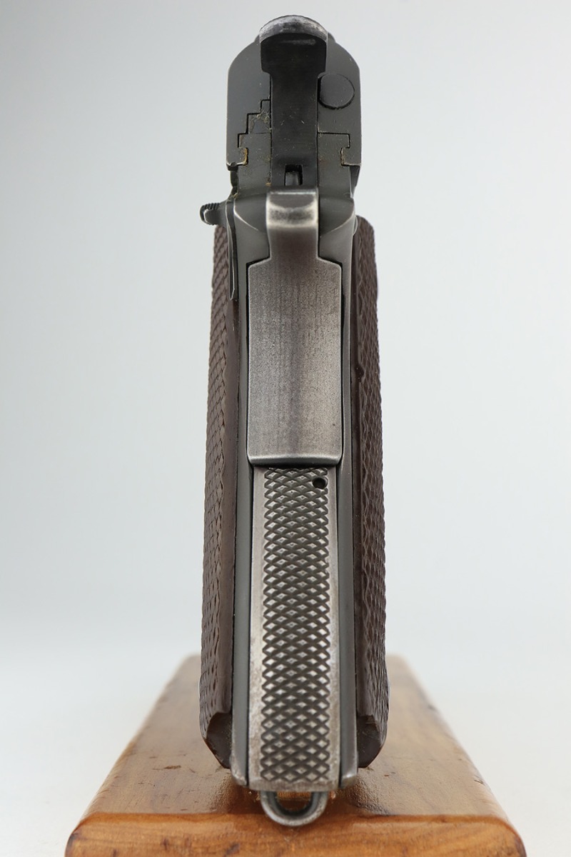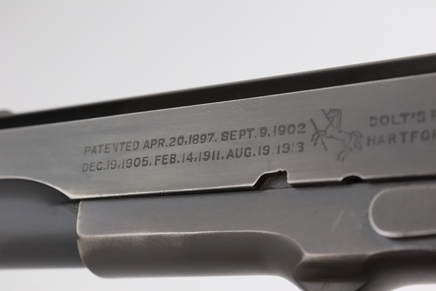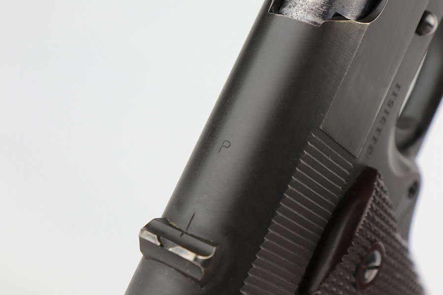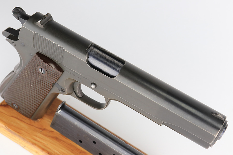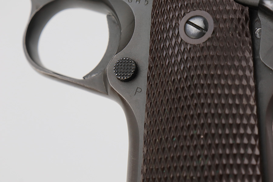 2/10/23 – This is a nice example of an original Army-issued Colt 1911A1 from 1943. All original with the matching numbered slide and frame. Original Colt barrel with large ‘G’ under lug. The pistol has a very nice profile but nearly all of the finish loss is on the front strap. Excellent grips with only minor handling wear. The bore has strong rifling but there is some freckling throughout the grooves. Unmarked magazine.