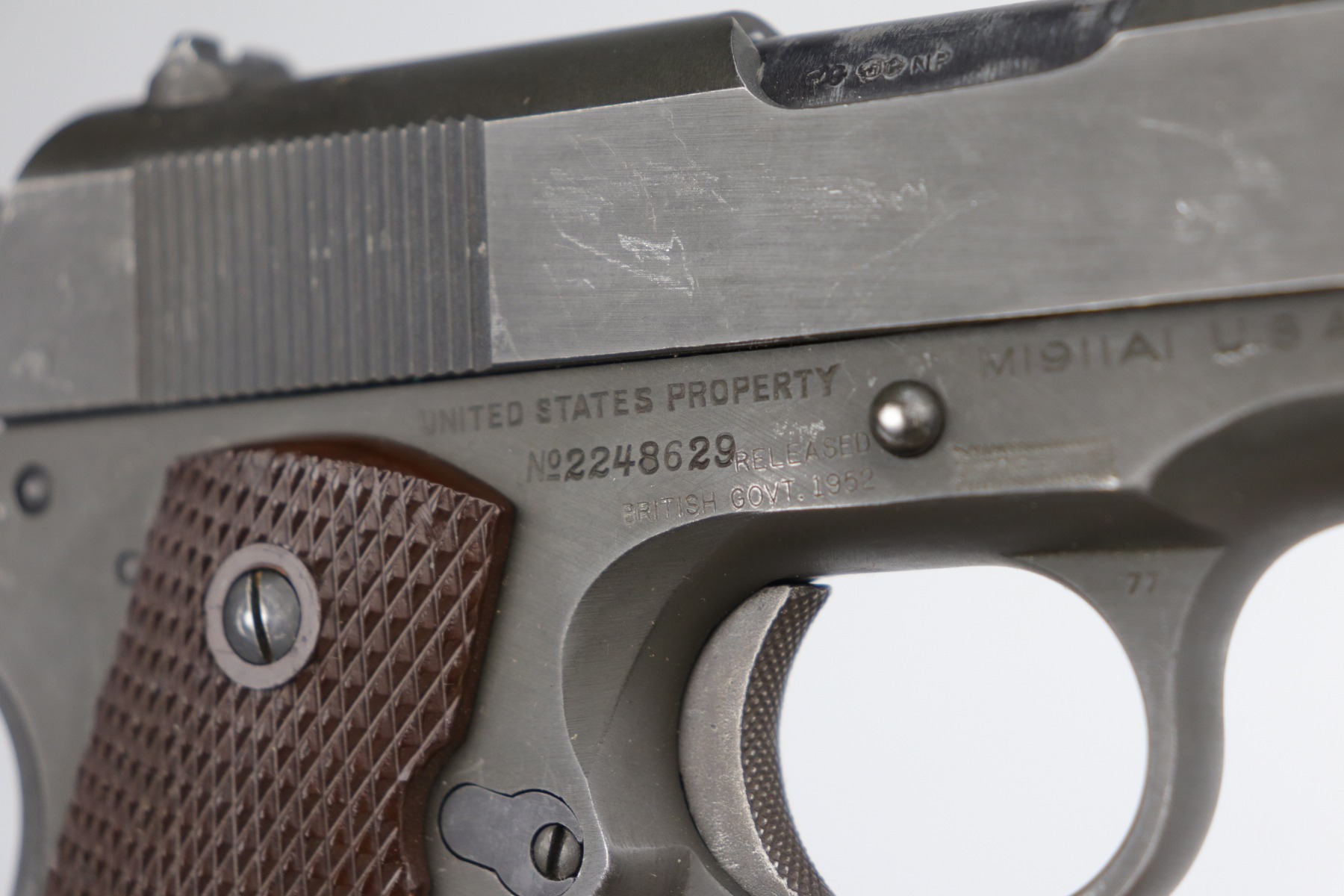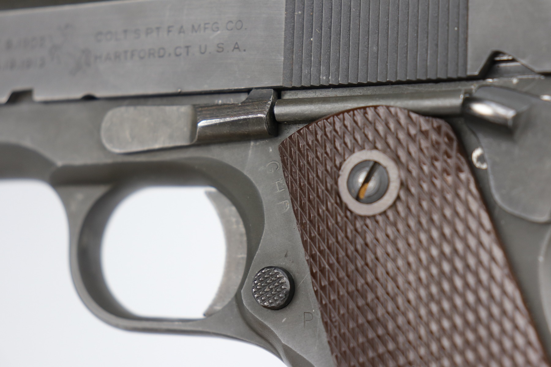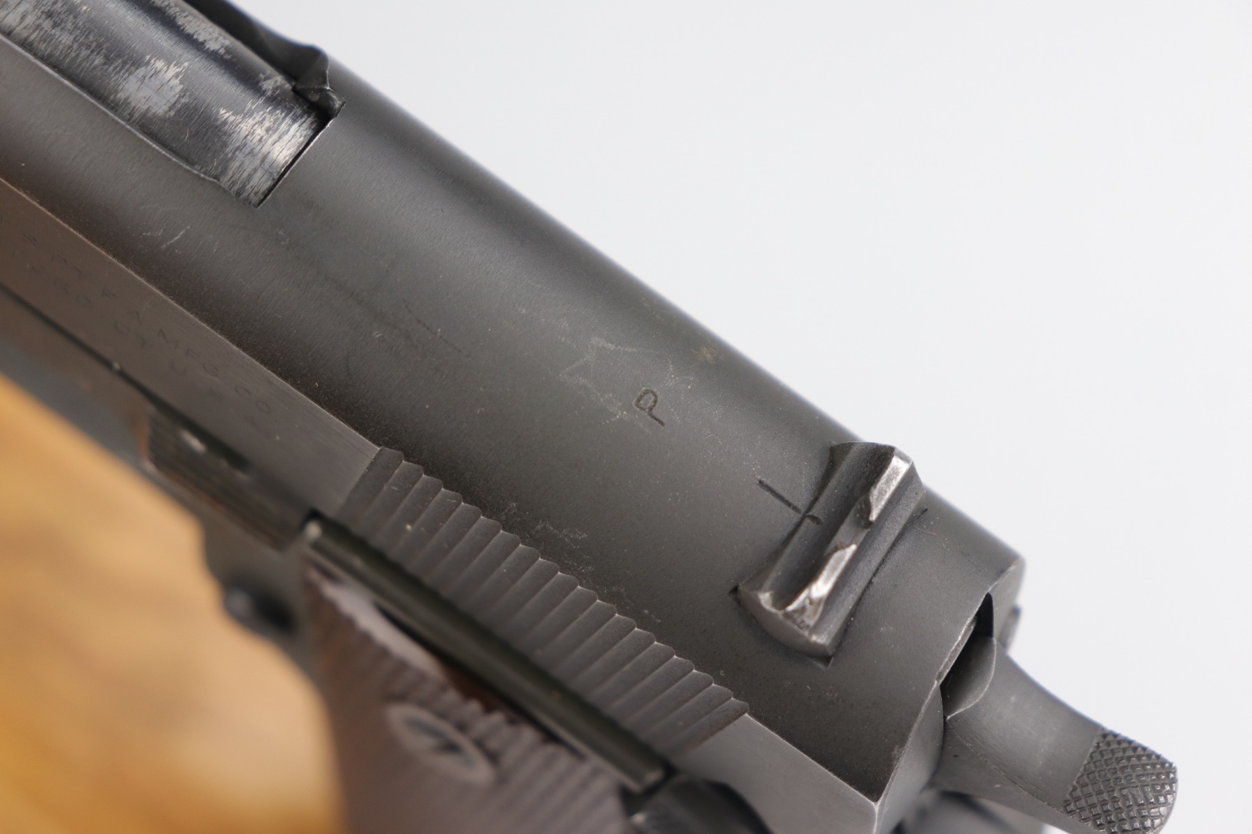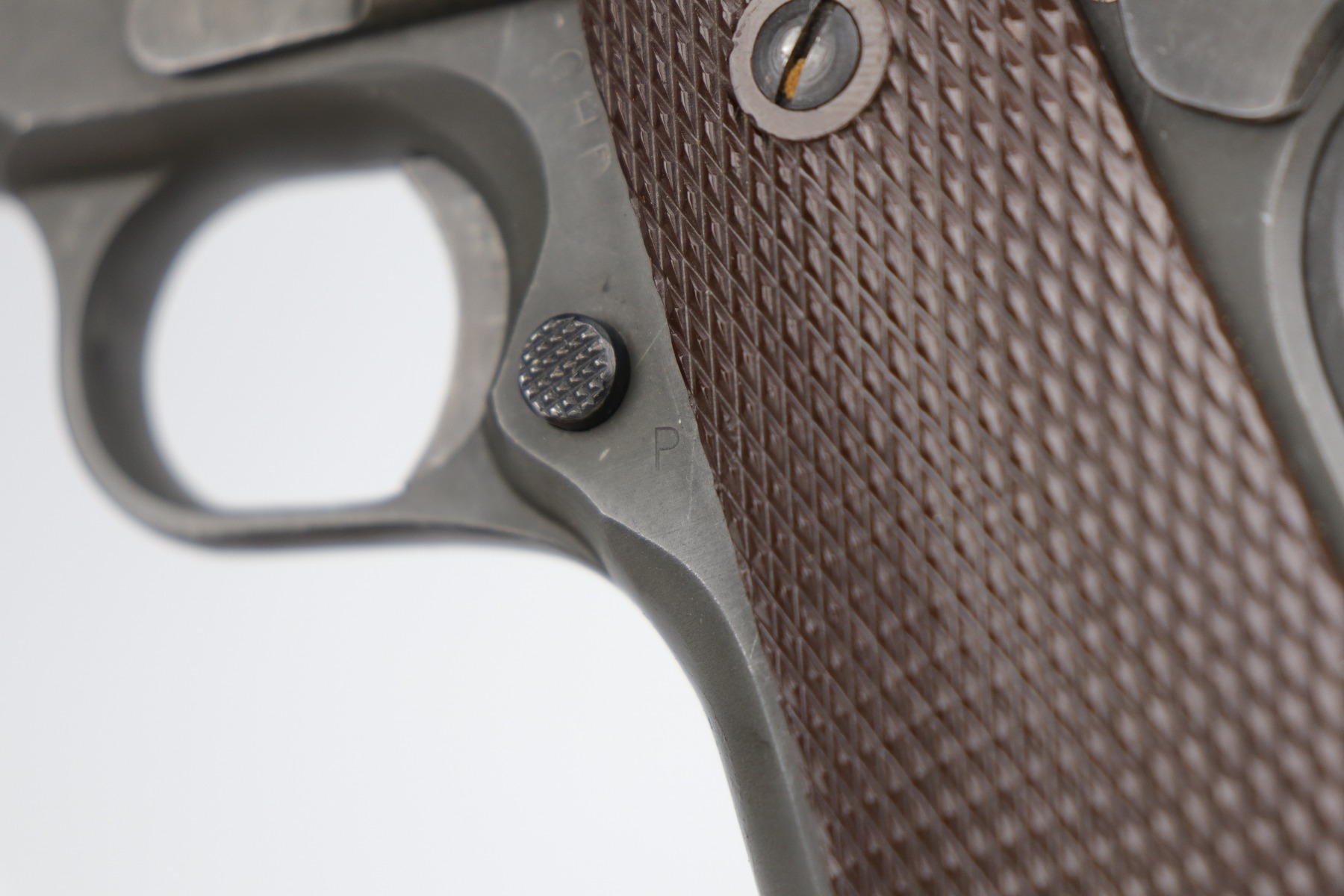 10/27/20 – This is an excellent example of a 1945 Colt 1911A1. The pistol ended up in the hands of the British government/military as part of the lend-lease program, as the right side of the frame and slide have various English proofs, including ‘RELEASED BRITISH GOVT. 1952’ on slide, and ‘NOT ENGLISH MAKE’ on frame. It has retained about 95% of its original finish. There is minor muzzle wear and wear around some of the high edges. There is spotty wear on the right side of the slide. It has excellent grips an d comes with a period-correct magazine. The bore is nice – good rifling with minor fouling in the grooves.