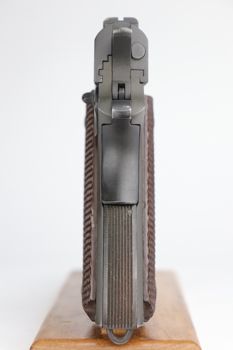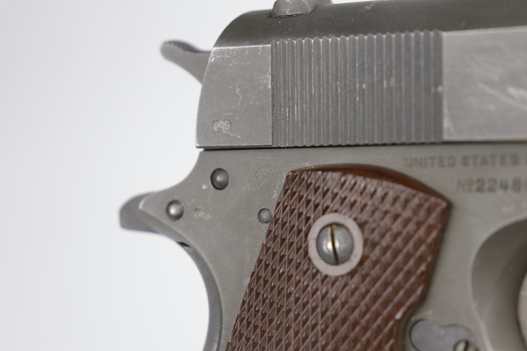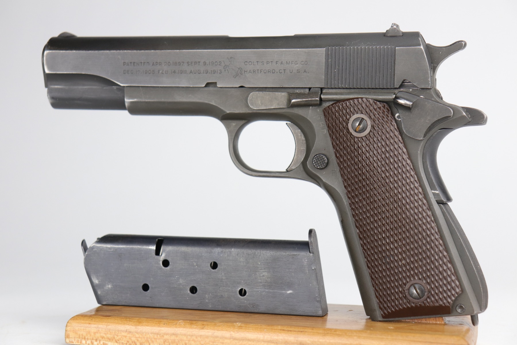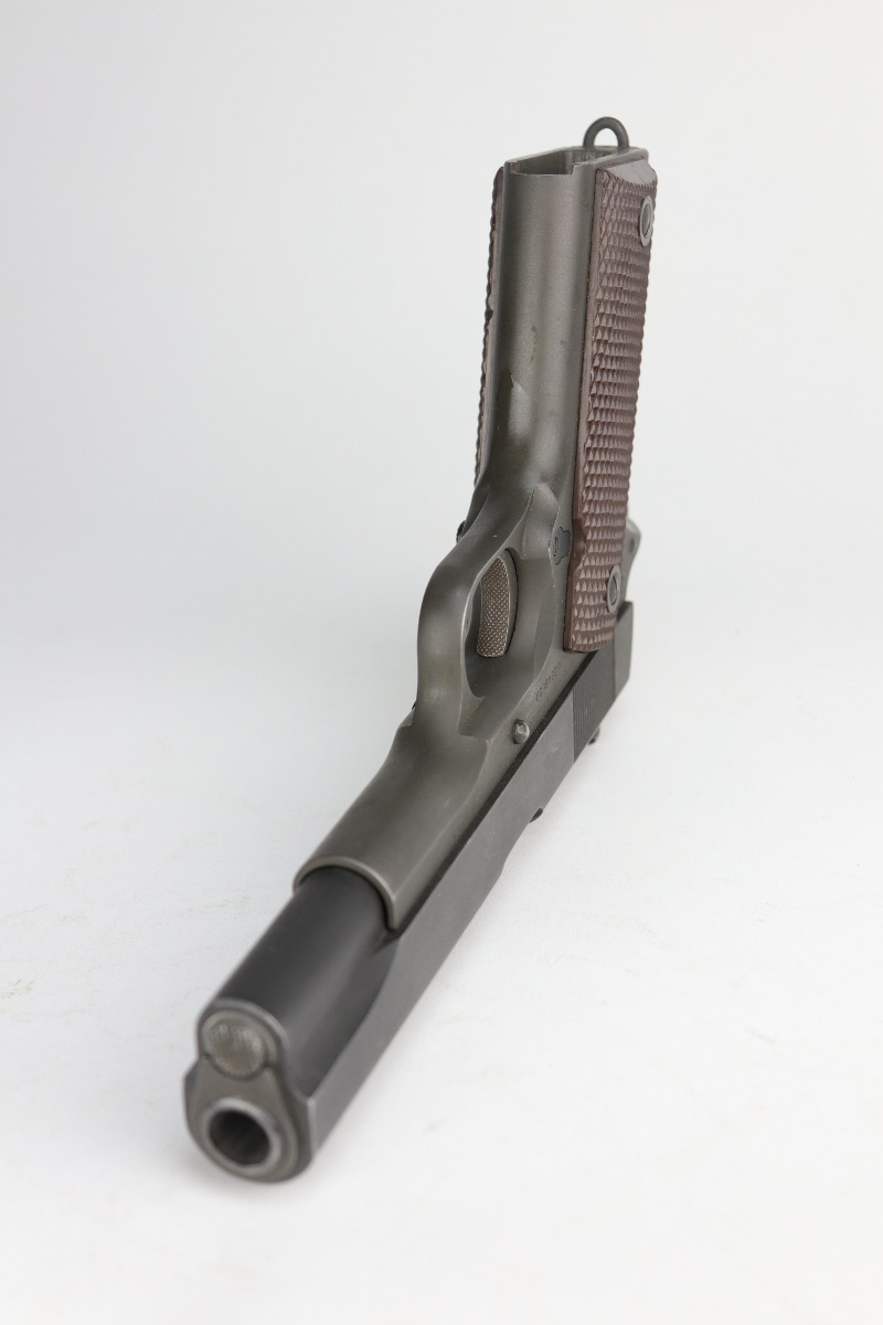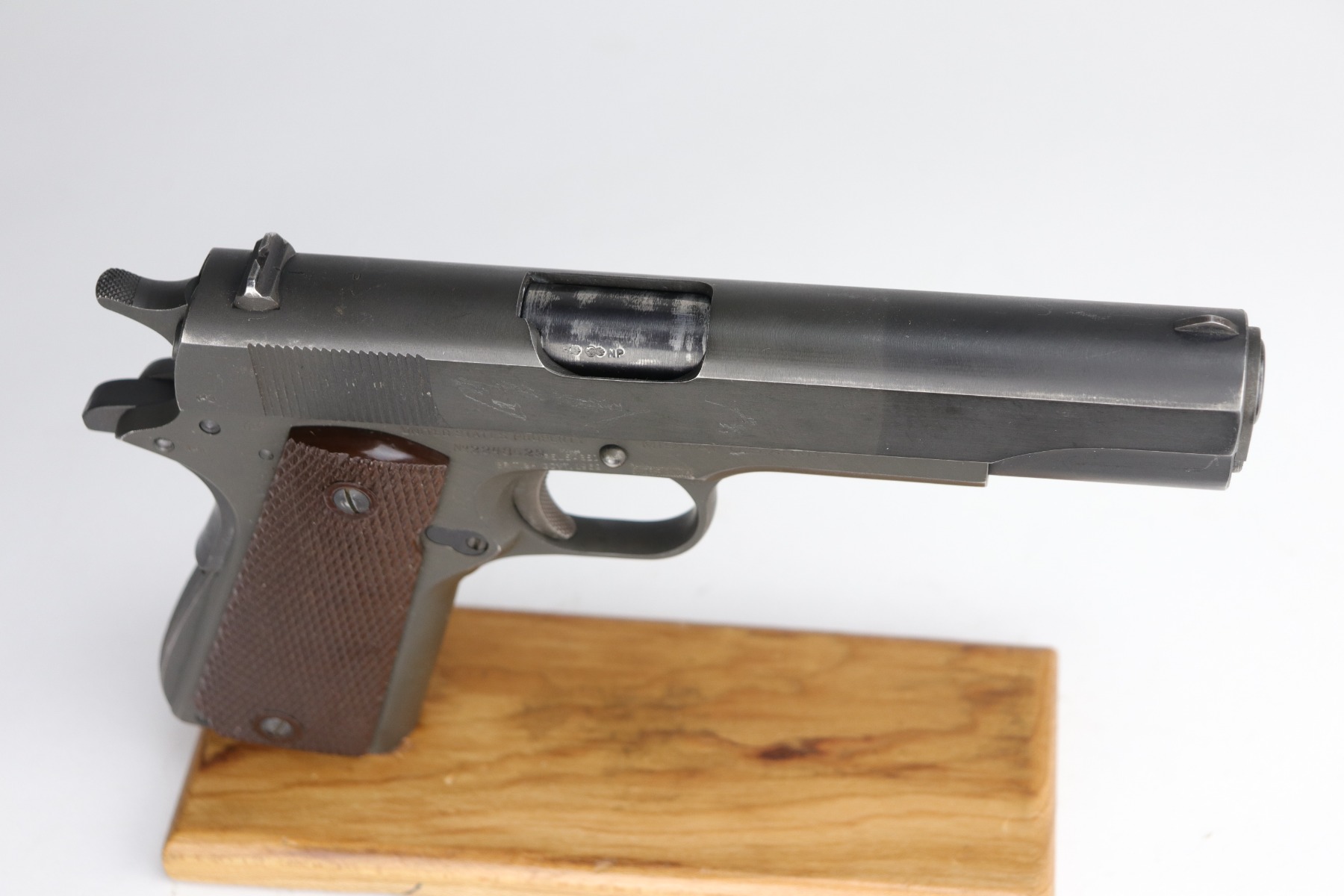 10/27/20 – This is an excellent example of a 1945 Colt 1911A1. The pistol ended up in the hands of the British government/military as part of the lend-lease program, as the right side of the frame and slide have various English proofs, including ‘RELEASED BRITISH GOVT. 1952’ on slide, and ‘NOT ENGLISH MAKE’ on frame. It has retained about 95% of its original finish. There is minor muzzle wear and wear around some of the high edges. There is spotty wear on the right side of the slide. It has excellent grips an d comes with a period-correct magazine. The bore is nice – good rifling with minor fouling in the grooves.