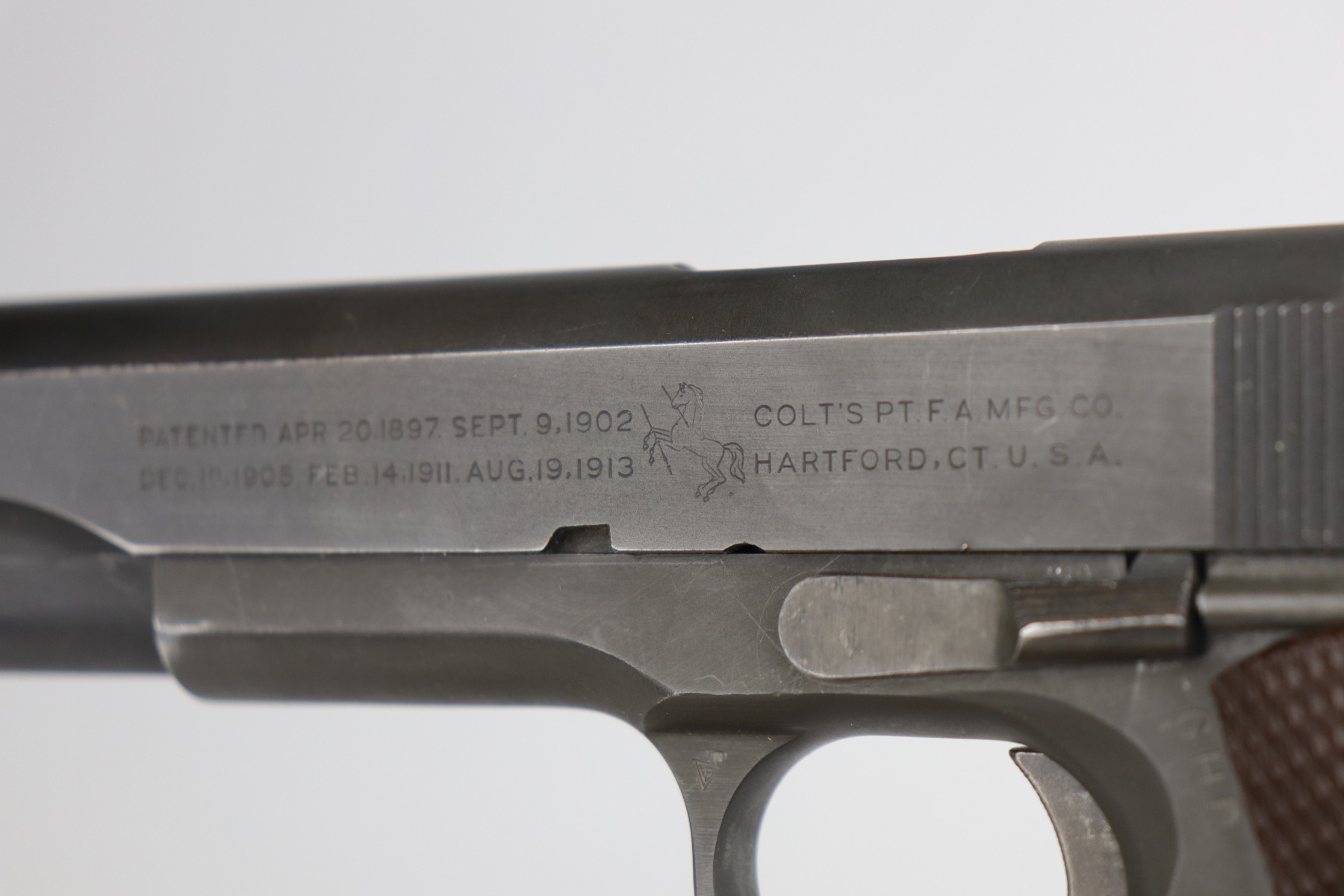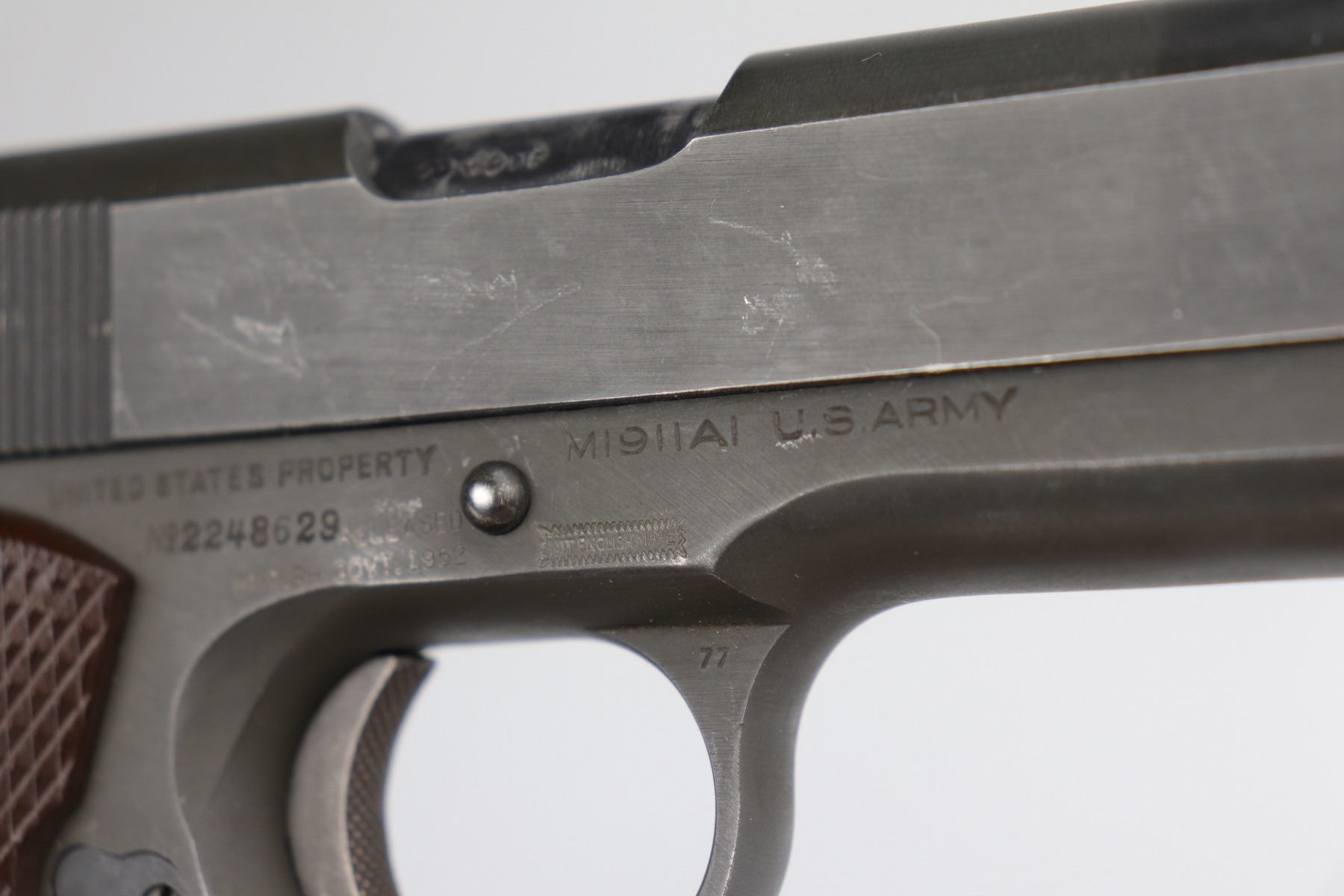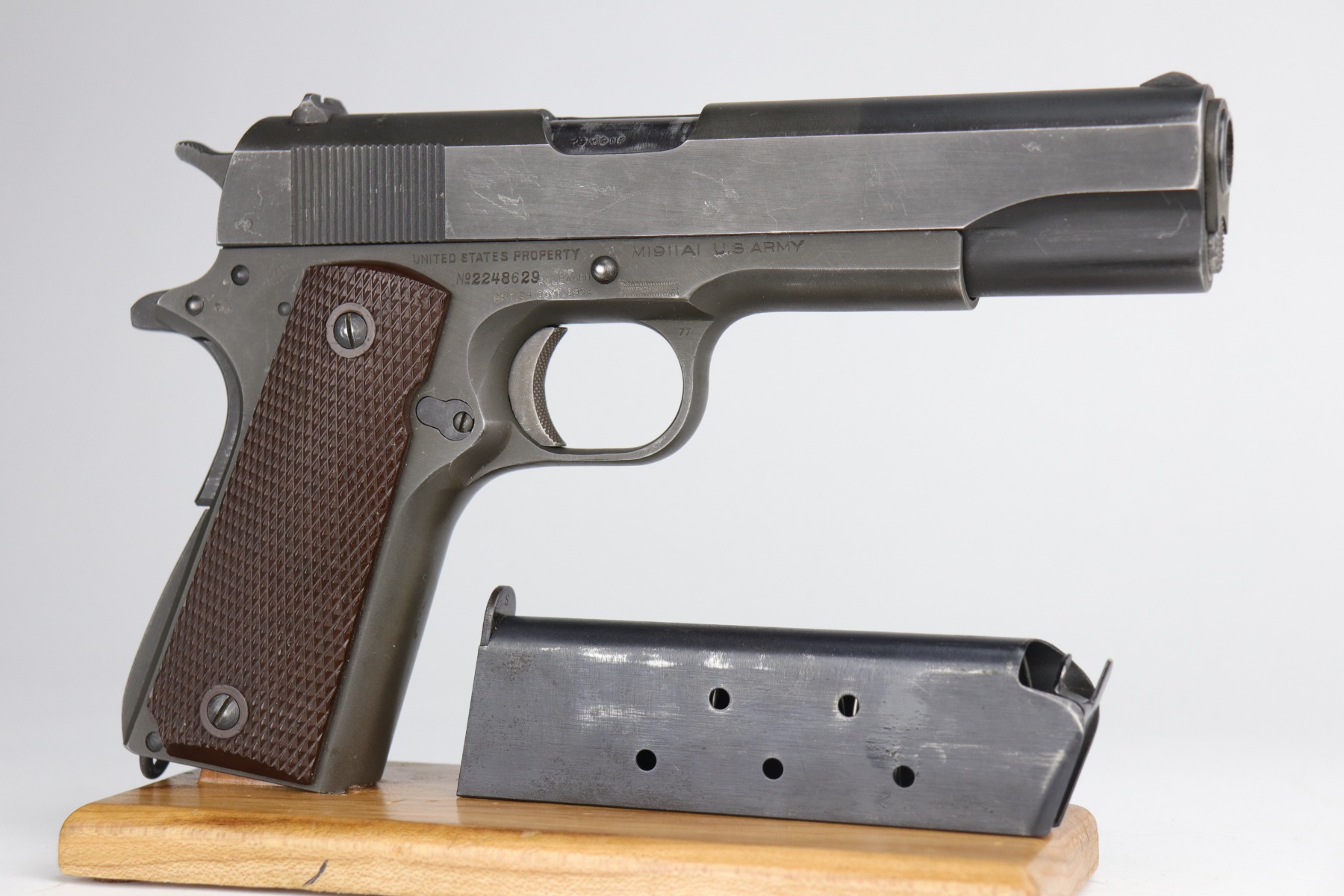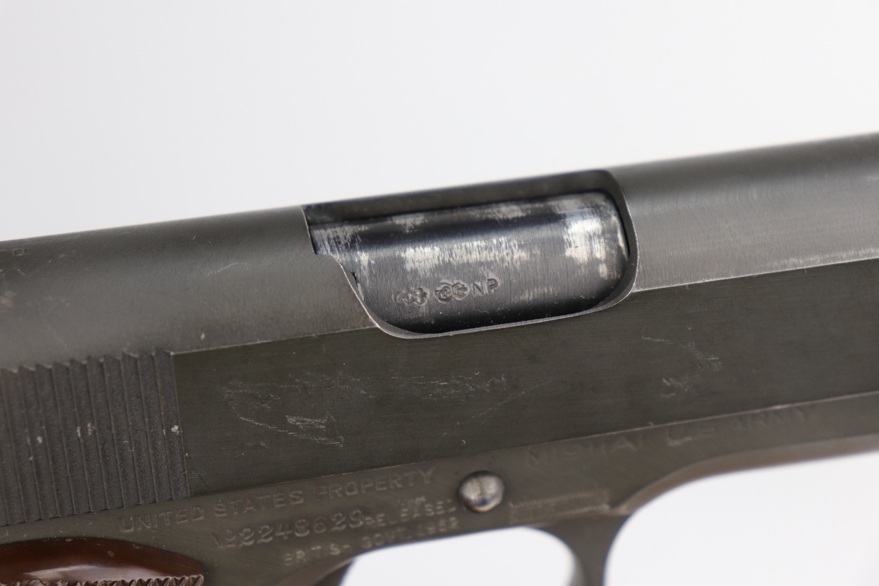 10/27/20 – This is an excellent example of a 1945 Colt 1911A1. The pistol ended up in the hands of the British government/military as part of the lend-lease program, as the right side of the frame and slide have various English proofs, including ‘RELEASED BRITISH GOVT. 1952’ on slide, and ‘NOT ENGLISH MAKE’ on frame. It has retained about 95% of its original finish. There is minor muzzle wear and wear around some of the high edges. There is spotty wear on the right side of the slide. It has excellent grips an d comes with a period-correct magazine. The bore is nice – good rifling with minor fouling in the grooves.