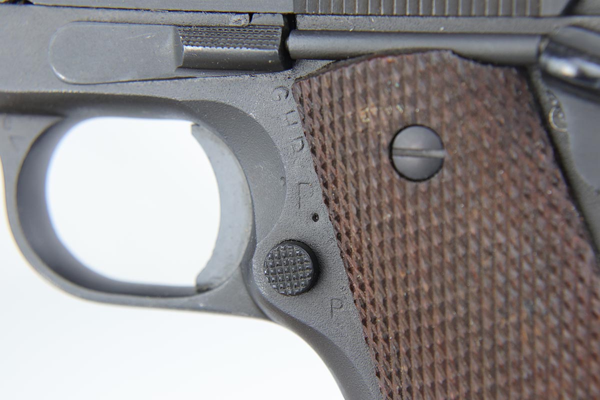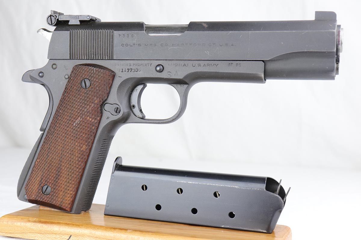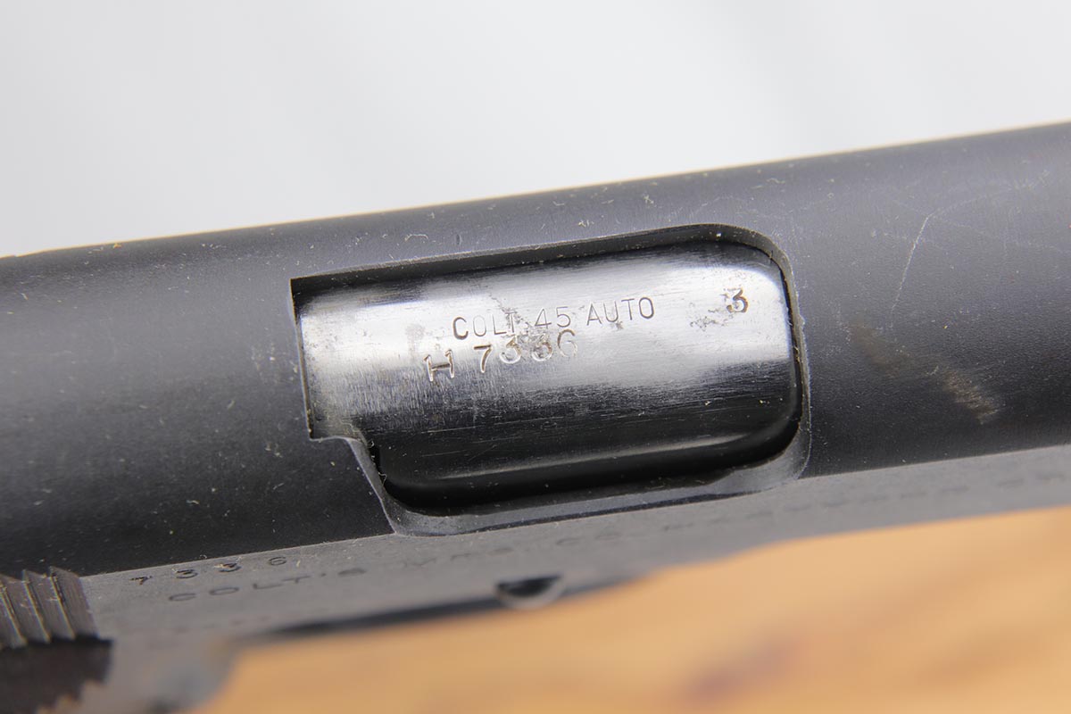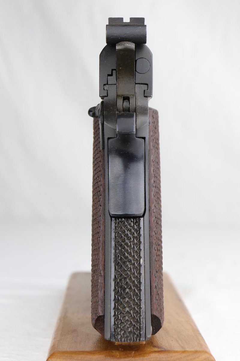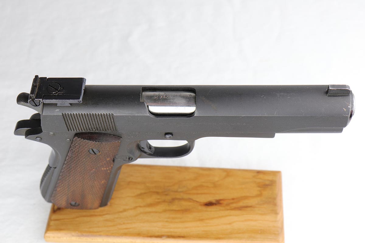 1/16/19 – This is a Colt 1911A1 that was part of the Government National Match reworks package. It has a Colt military frame from 1943, with SA (Springfield Armory) rework proof on frame. If features further National Match characteristics such as the rear sight, and the slide and barrel were stamped with the final four digits of the frame serial. The slide is a Government Model slide, and the parts are all paired together then parkerized, leaving an excellent finish on this pistol to pair with a terrific bore. Excellent wood grips.