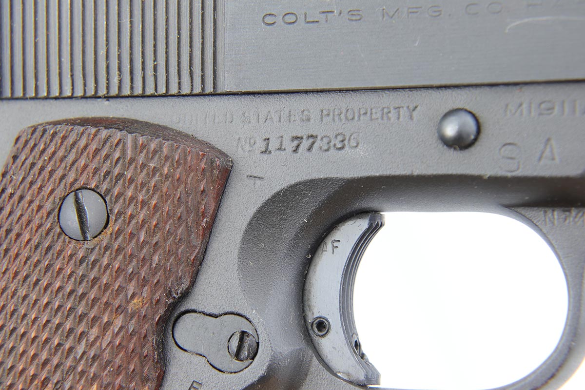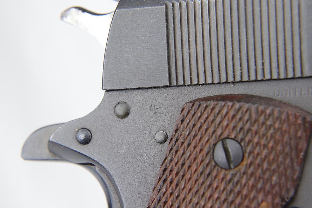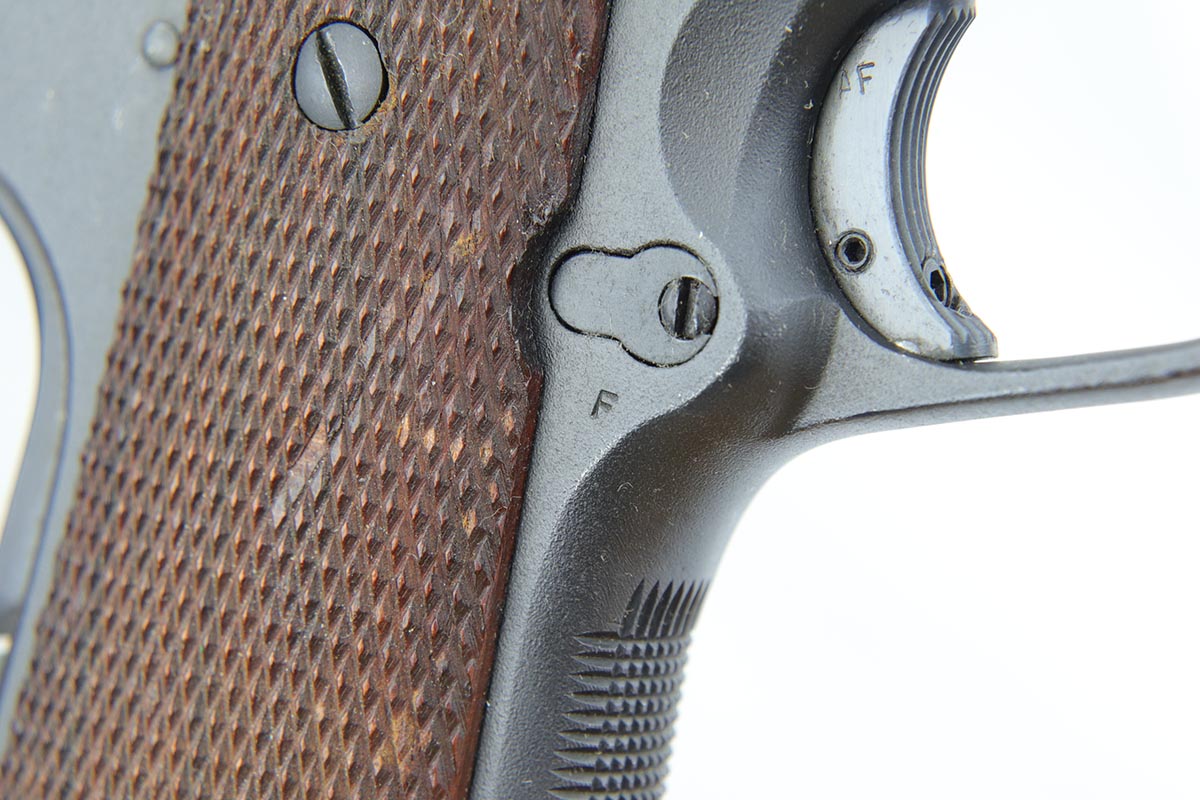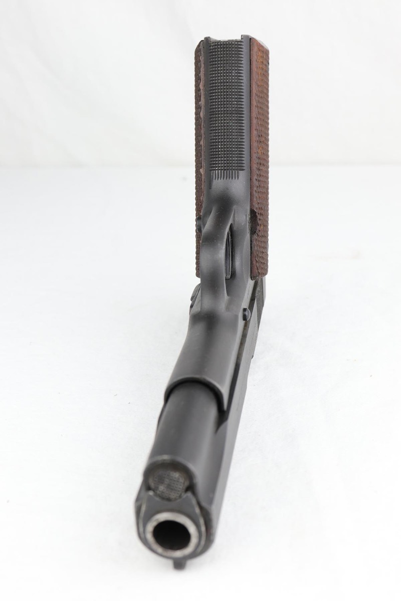 1/16/19 – This is a Colt 1911A1 that was part of the Government National Match reworks package. It has a Colt military frame from 1943, with SA (Springfield Armory) rework proof on frame. If features further National Match characteristics such as the rear sight, and the slide and barrel were stamped with the final four digits of the frame serial. The slide is a Government Model slide, and the parts are all paired together then parkerized, leaving an excellent finish on this pistol to pair with a terrific bore. Excellent wood grips.