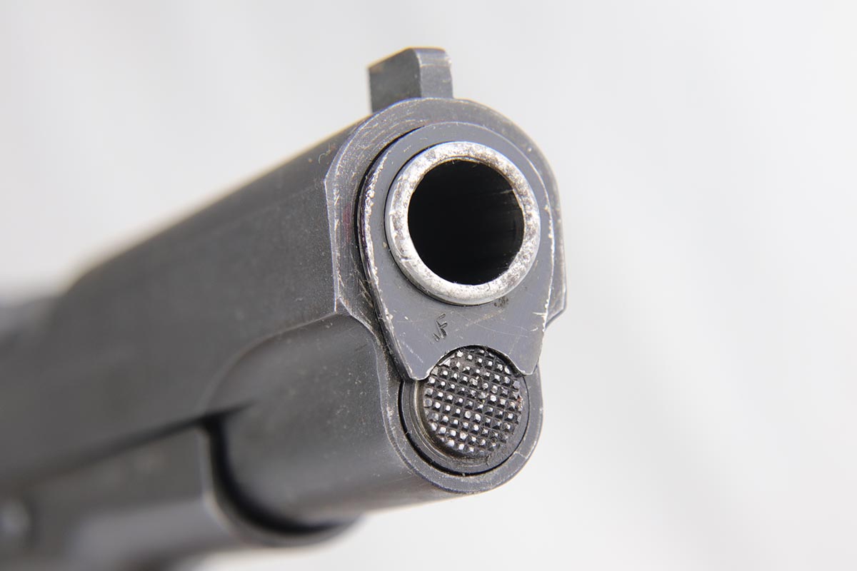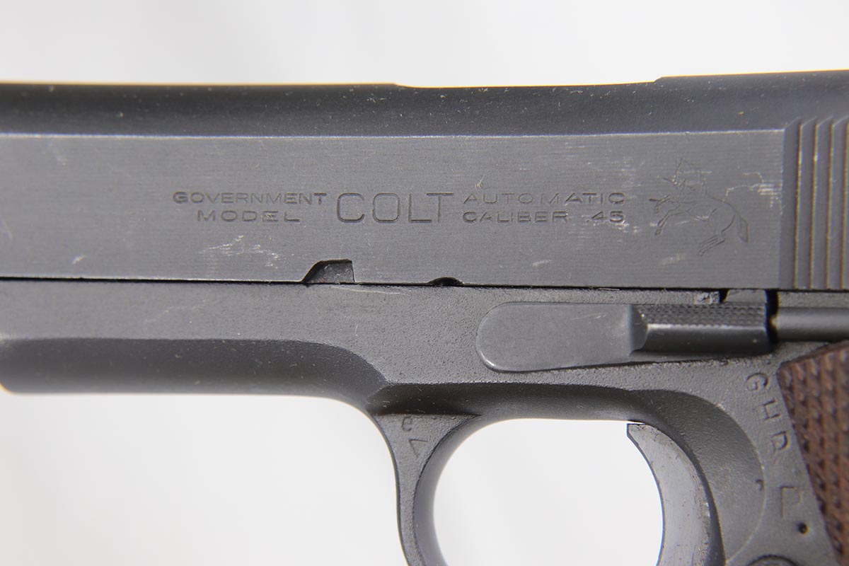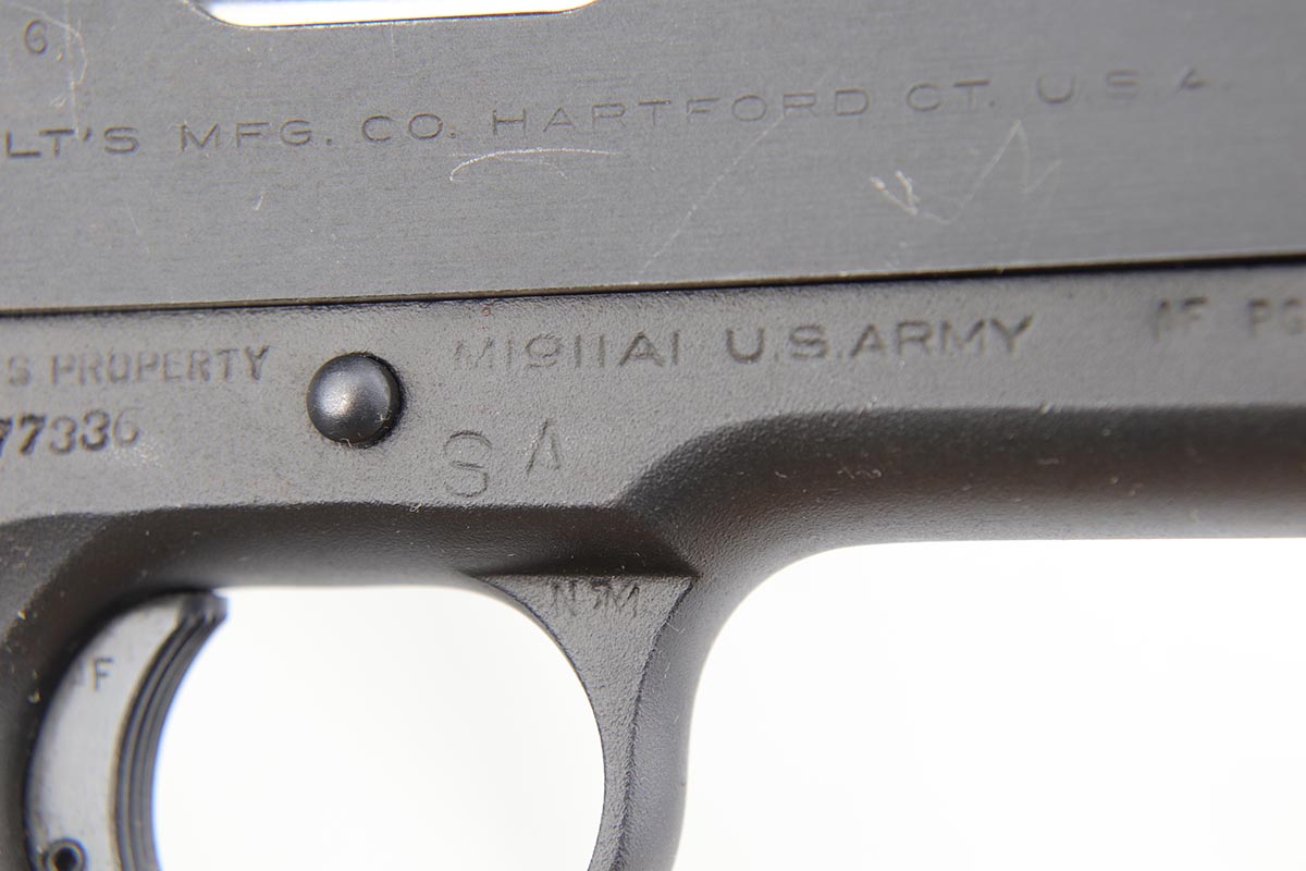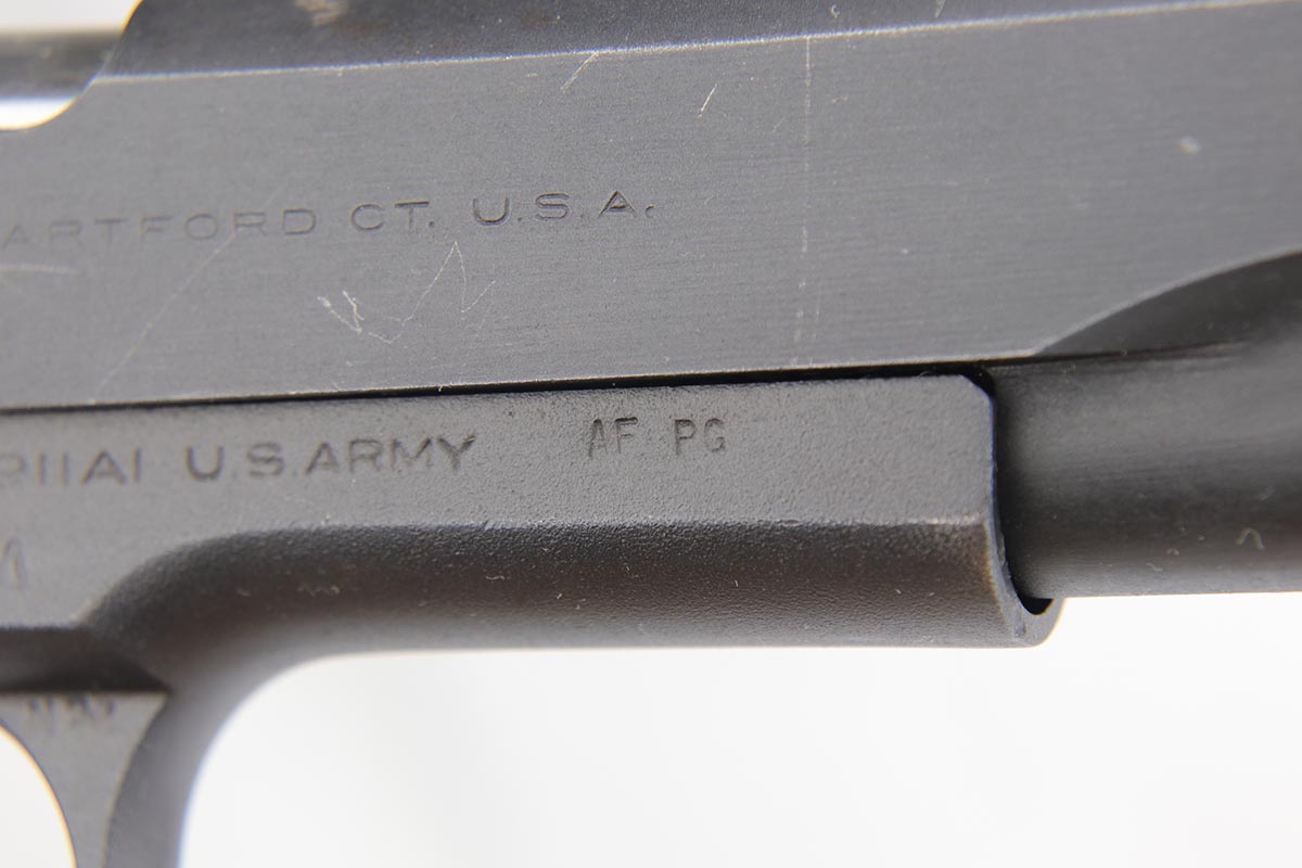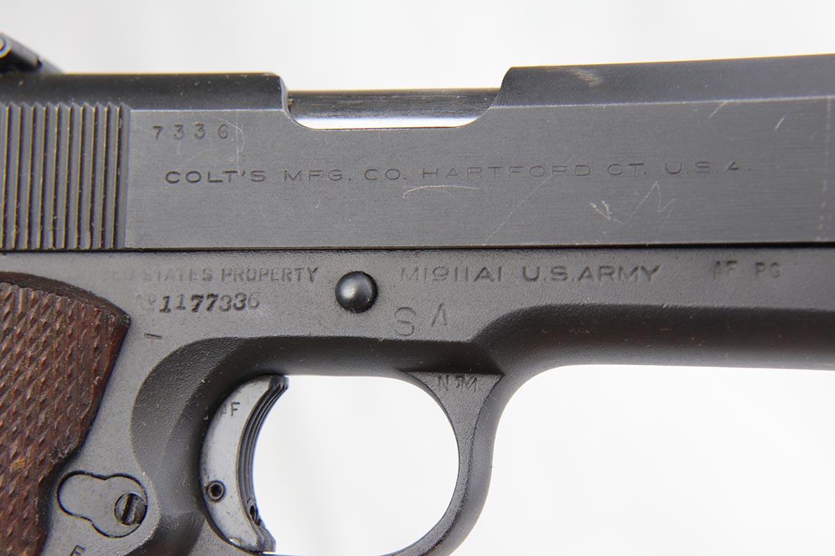 1/16/19 – This is a Colt 1911A1 that was part of the Government National Match reworks package. It has a Colt military frame from 1943, with SA (Springfield Armory) rework proof on frame. If features further National Match characteristics such as the rear sight, and the slide and barrel were stamped with the final four digits of the frame serial. The slide is a Government Model slide, and the parts are all paired together then parkerized, leaving an excellent finish on this pistol to pair with a terrific bore. Excellent wood grips.