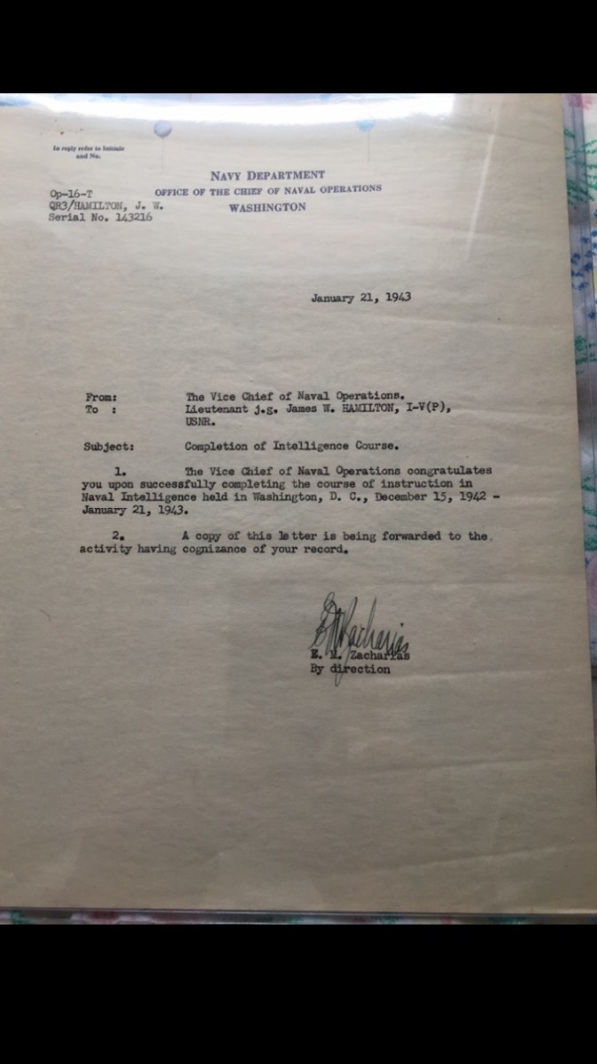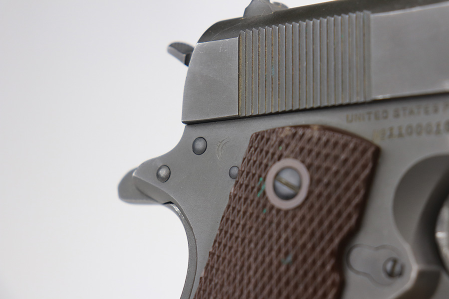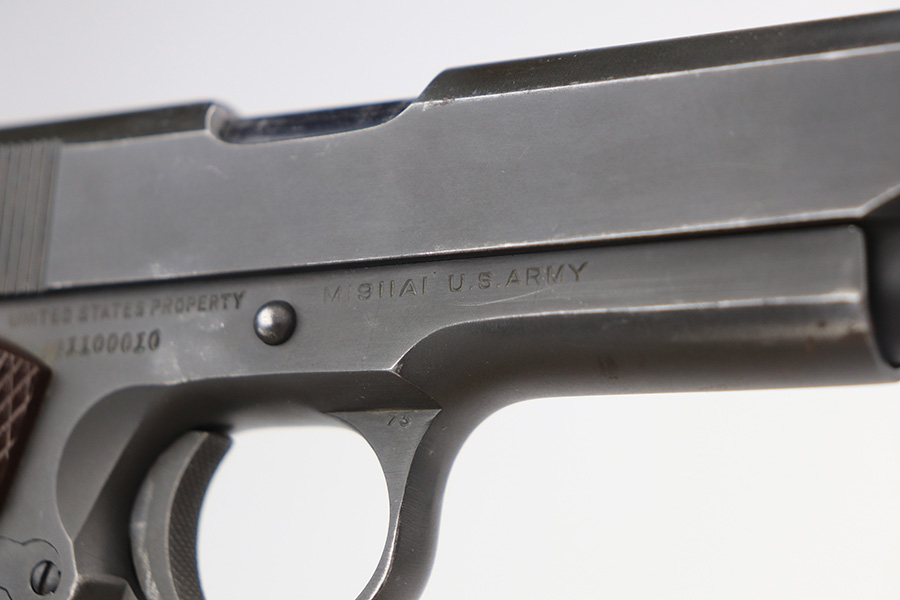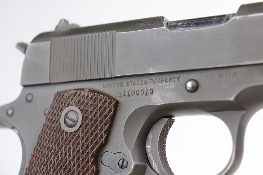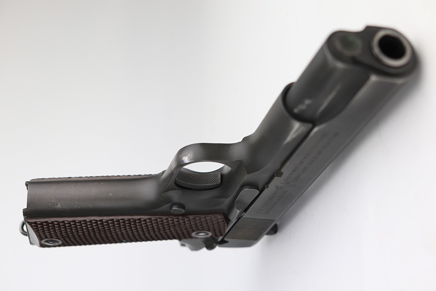 2/21/23 – This is a nice, honest example of an original Colt 1911A1 that was manufactured in 1943. This was sold to us by the nephew of the vet who it was issued to, Lt. J. Walter Hamilton. The seller doesn’t know many of the details around his uncle’s service in the war, but he does have some photos of him and a letter from the Navy Department on Hamilton’s completion of the Naval Intelligence course. This pistol would’ve been manufactured a little after the date on this document, so was presumably issued to him once he held the position of Naval Intelligence Officer. The seller let us take photos of the additional items but he wanted to keep the originals. The pistol itself has matching frame and slide with a Colt barrel that has small ‘F’ under the lug. There is some wear on the front edges of the frame and slide, and a small patch of freckling on the right side. Minor areas of finish loss here or there but no major patches of finish loss otherwise. Bore has a little freckling in the grooves but good condition overall with strong rifling. Excellent grips with no cracks.