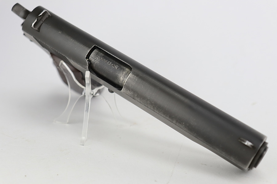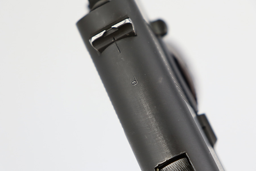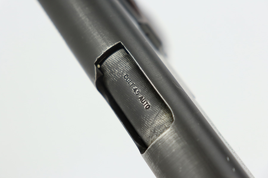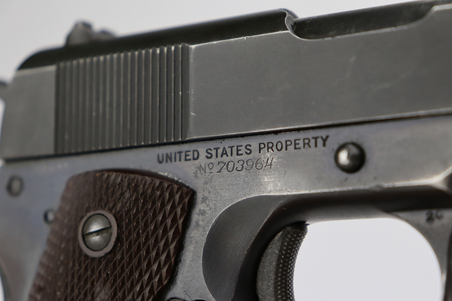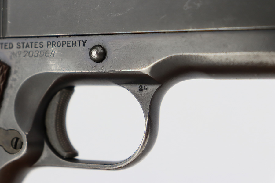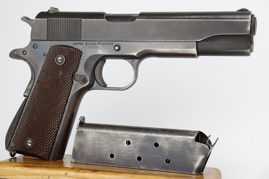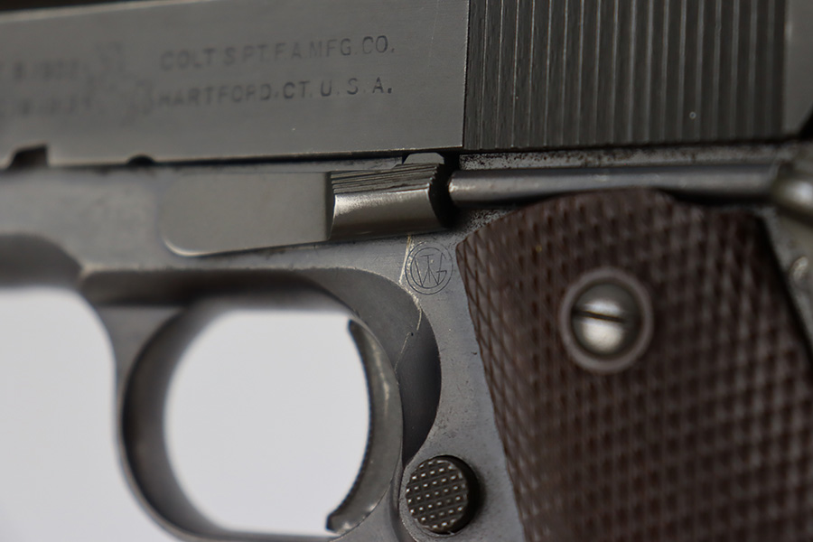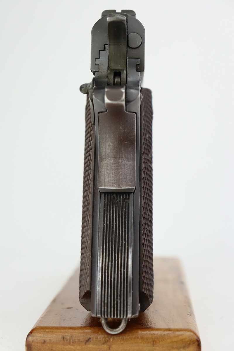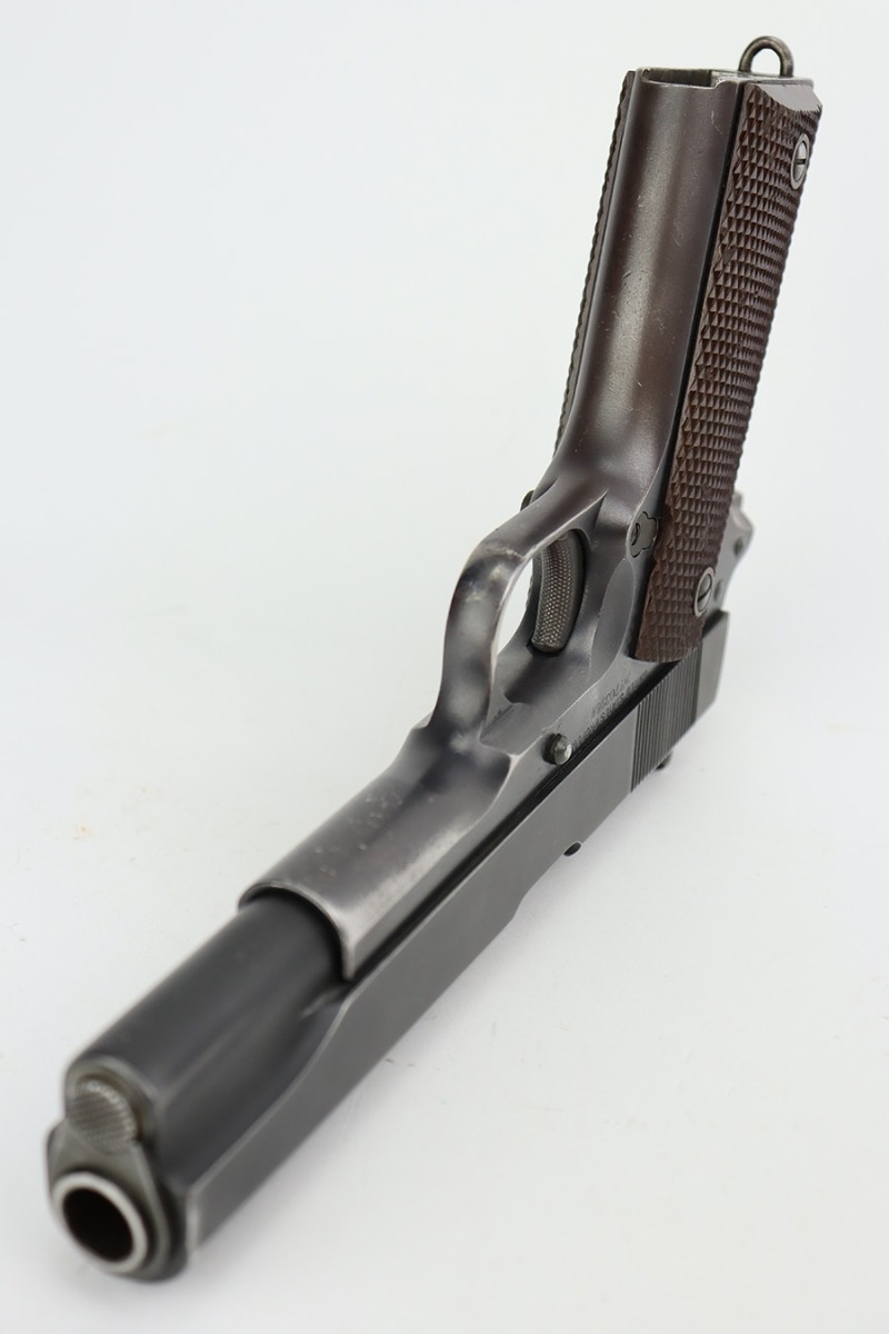 8/24/23 – This is an excellent example of a Colt Model 1911A1. Most of the parts are WW2-era, but the frame is a rare transitional from 1924. Unfortunately, it has been re-blued. The rest of the gun is parkerized. It also has a post-war Colt barrel. The gun has retained about 93% of its finish. There is minor wear around the muzzle and around the high edges in general. Some light brown patina on the grip straps and some tiny dings on the front strap. Fitted with excellent WW2-era plastic grips and comes with a WW2-era “R” marked magazine. Mint bore.