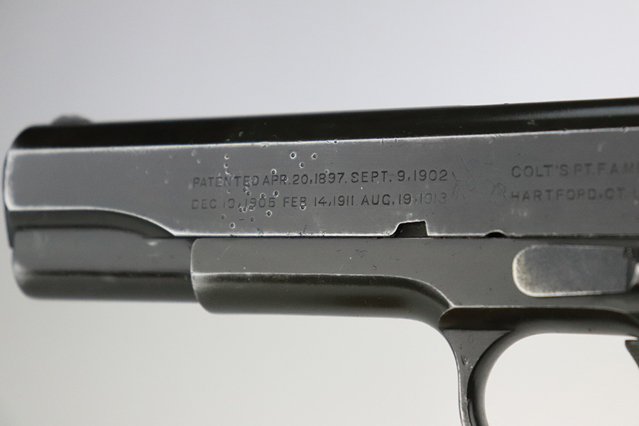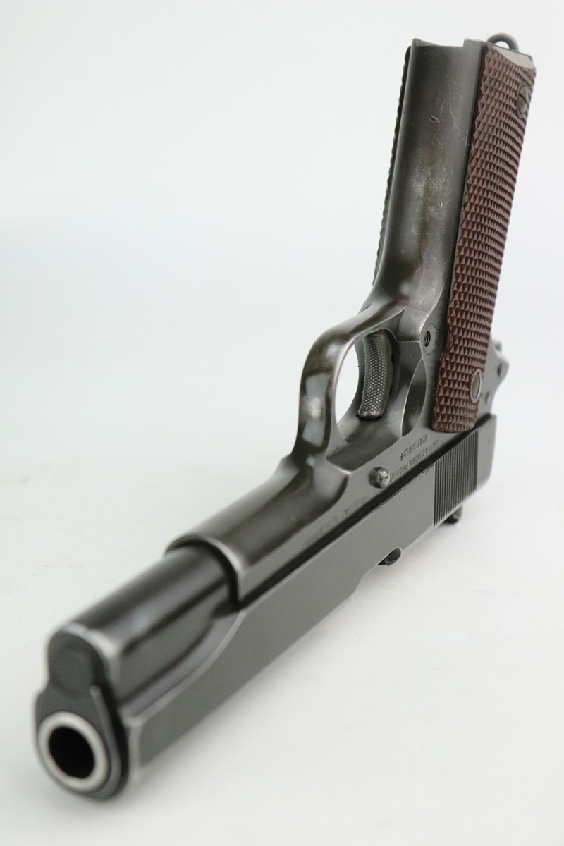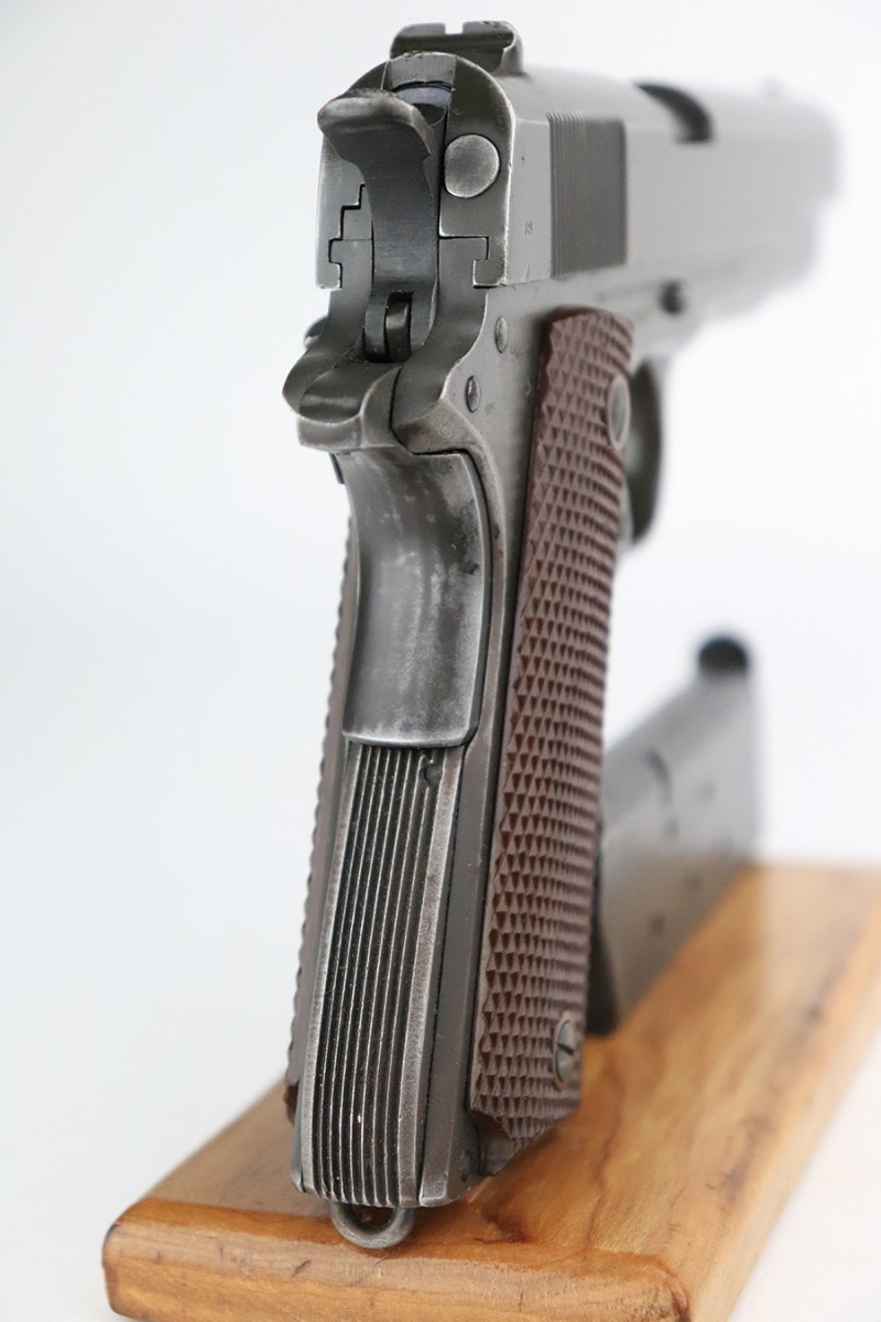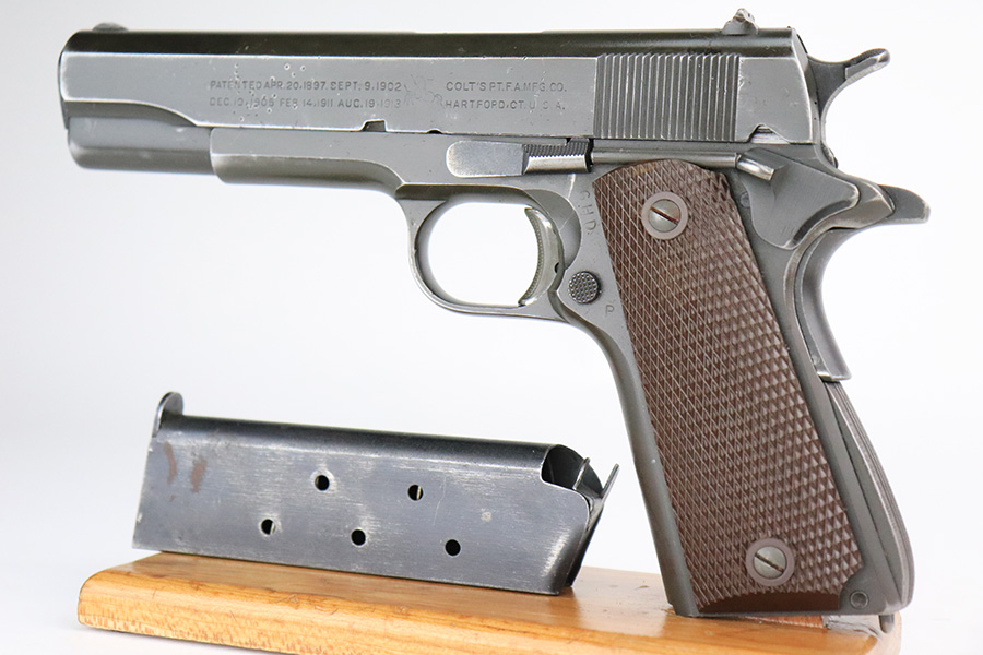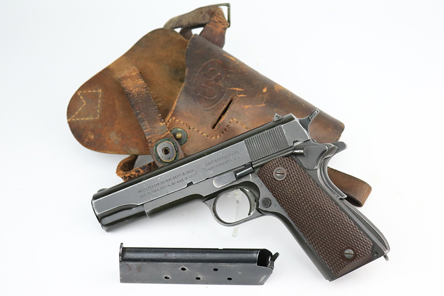 7/29/22 – This is a U.S. Army issued and inspected Colt 1911A1 from 1944 that was sent to Britain as part of the lend-lease program. It has the proper U.S. military inspectors marks, and British proofs are visible on right rear frame and slide. The parkerized finish is original with most of the wear on the front strap and grip safety, though there is a series of small dings or punch marks on the left side of the slide (not sure what would’ve caused this). Rare Colt barrel with large G under the lug. Risdon magazine. Bore has strong rifling with just a little frost in the grooves. Comes with a period original shoulder holster that is ’43 dated and U.S. marked.