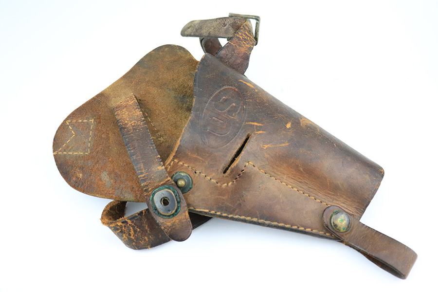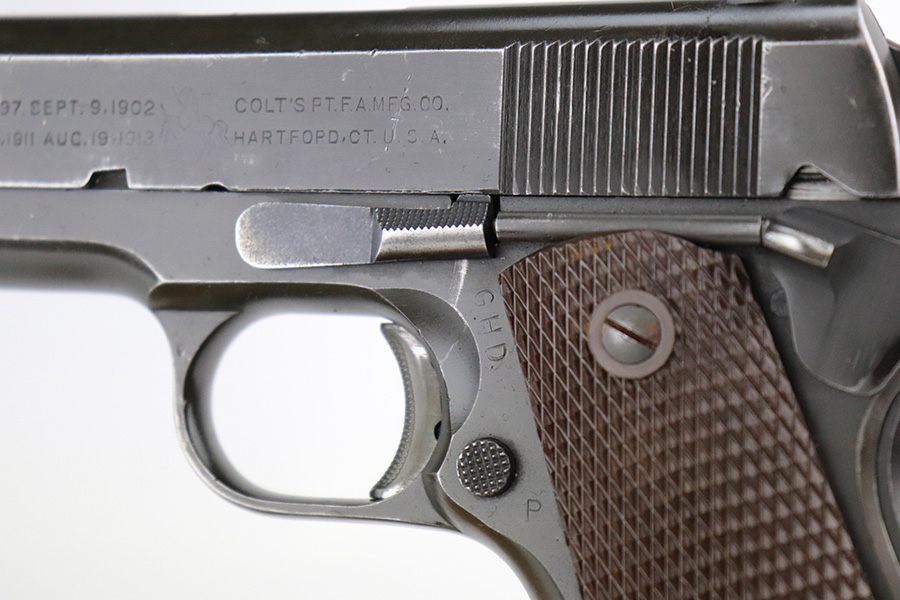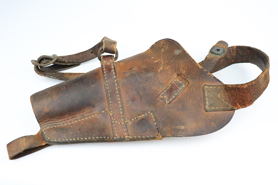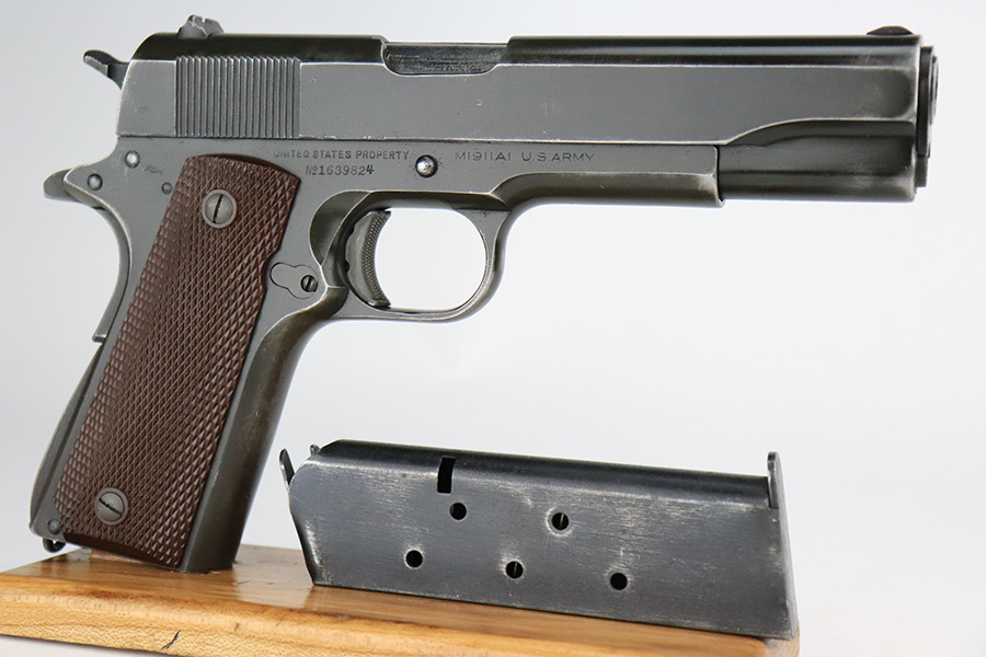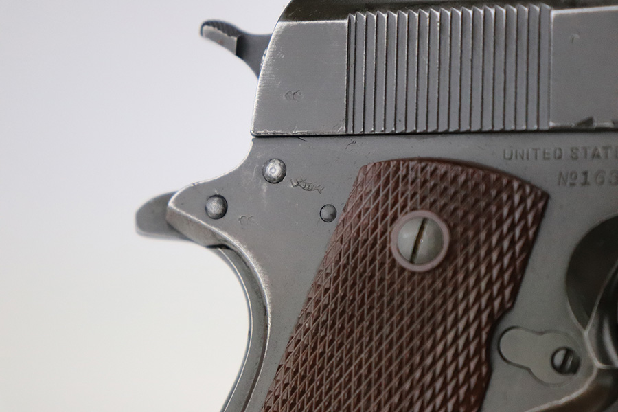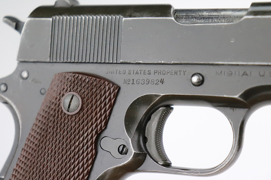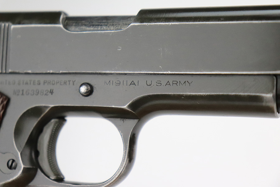 7/29/22 – This is a U.S. Army issued and inspected Colt 1911A1 from 1944 that was sent to Britain as part of the lend-lease program. It has the proper U.S. military inspectors marks, and British proofs are visible on right rear frame and slide. The parkerized finish is original with most of the wear on the front strap and grip safety, though there is a series of small dings or punch marks on the left side of the slide (not sure what would’ve caused this). Rare Colt barrel with large G under the lug. Risdon magazine. Bore has strong rifling with just a little frost in the grooves. Comes with a period original shoulder holster that is ’43 dated and U.S. marked.