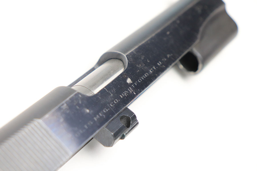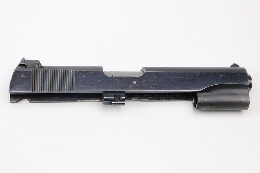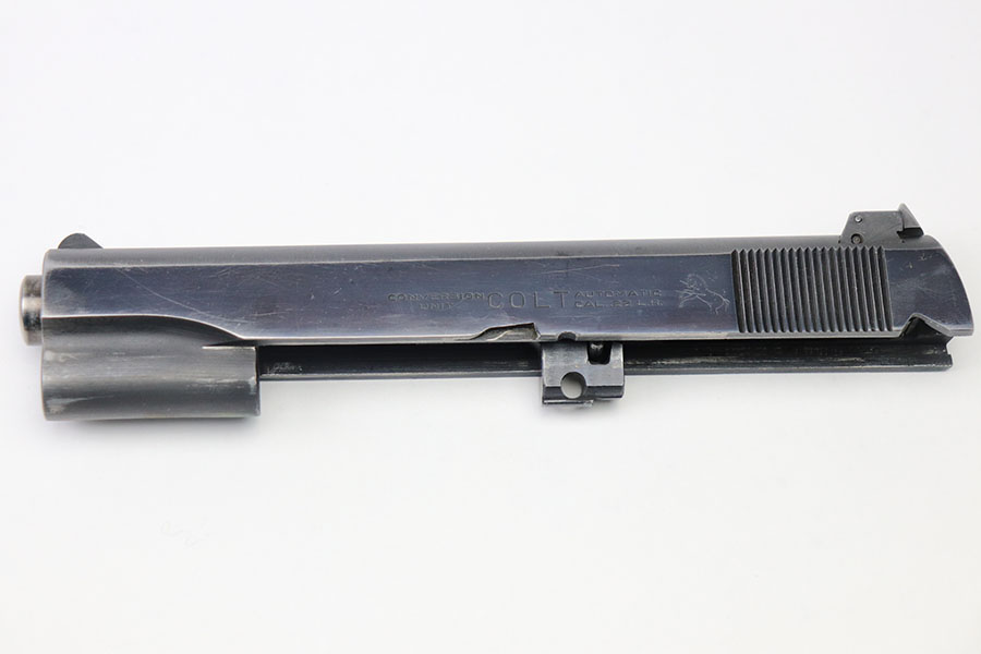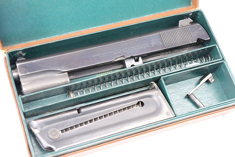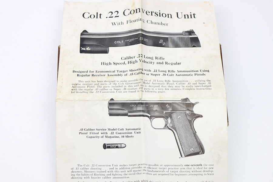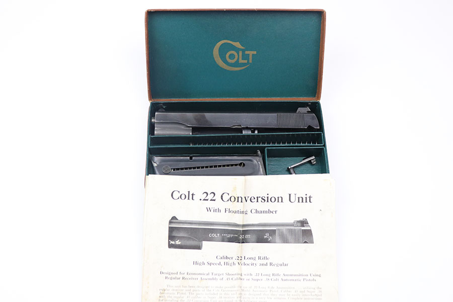 4/20/21 – This is a complete Colt .22 Conversion Kit for Colt .45 Caliber or Super .38 Colt Automatic Pistols. The kit includes an original box, slide & barrel, takedown lever, recoil spring, magazine, and original manual. According to the last page on the manual, this was made in 1948. The condition is excellent overall. There is some mild finish loss and surface wear on the slide and magazine, but no major damage. The bore is shiny with strong rifling, 9/10.