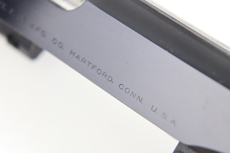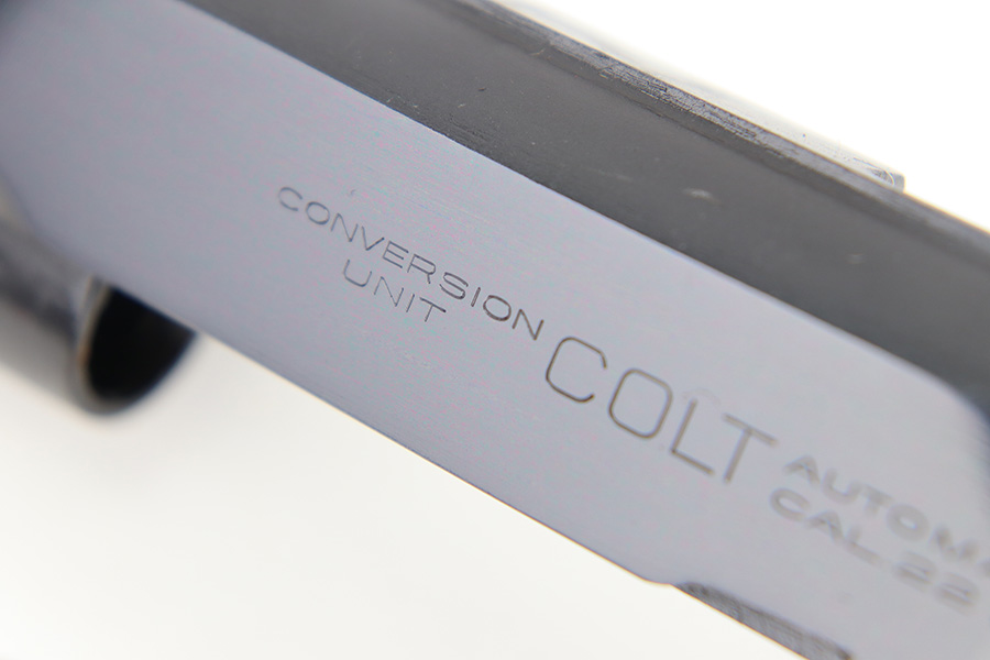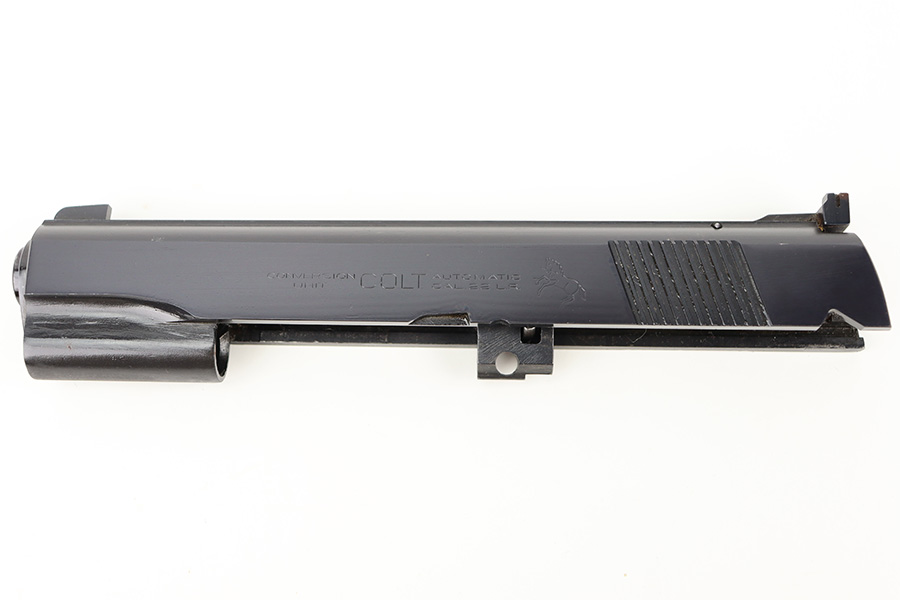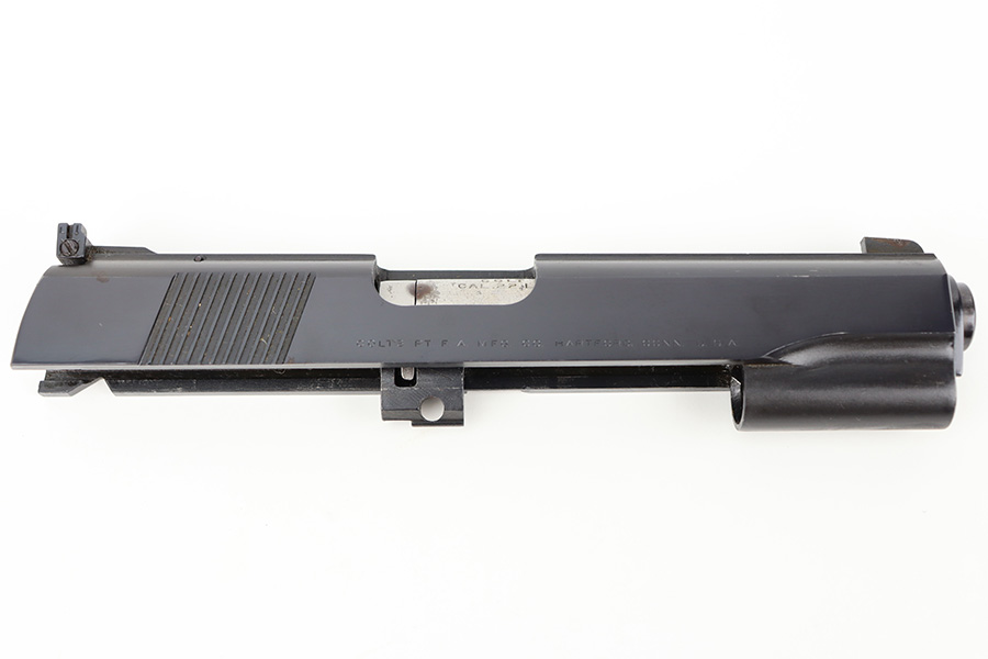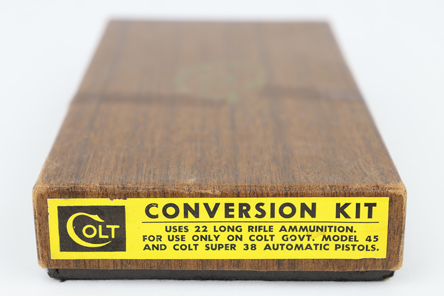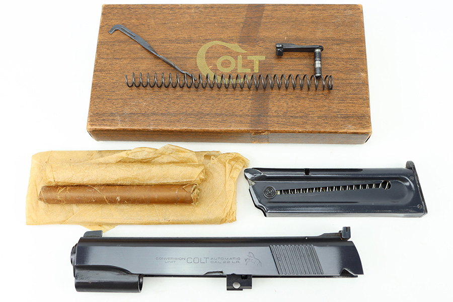 12/18/23 – This is an original Colt Conversion Kit for converting a Colt .45 or Colt Super 38 into .22 LR. The conversion kit comes with everything shown in photos; complete slide and barrel assembly, magazine, recoil spring, and takedown lever / small parts as shown. Everything is in excellent condition, except for some brown patina on the barrel near the ejection port (shown in photos). The bore is minty and clean. Comes with an original box as well.
