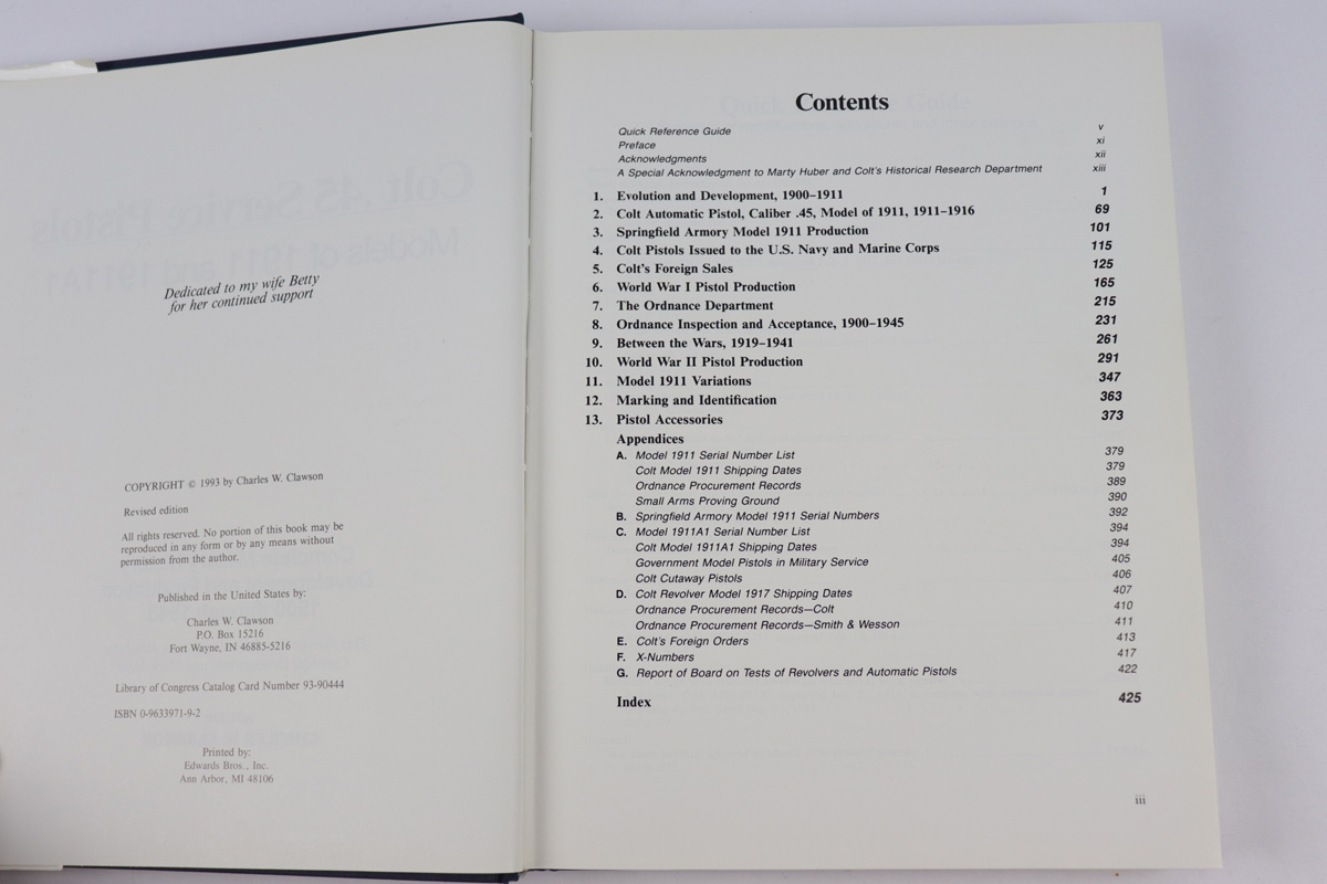 10/3/18 – This book is the most in depth, useful reference for the .45 Caliber Colt services pistols. Covers the model 1911 and model 1911A1, and is the best collector’s guide to date. No longer in print, these books are increasingly hard to find, especially in this condition. The book is in very good condition with only minor wear and a little discoloration to the sleeve. Hardcover edition with book sleeve in tact. Guaranteed original. 429 pages total!