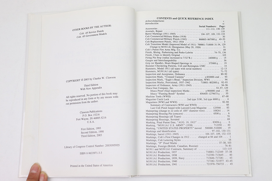 10/14/22 – This is an original copy of Charles Clawson’s resource book, “Collector’s Guide to Colt .45 Service Pistols: Models of 1911 and 1911A1 Third Edition”. The hardcover book is 146 pages and in excellent overall condition. The interior cover page is signed by the author. This book is to act as a quick reference guide for collectors, and is a very useful resource.
