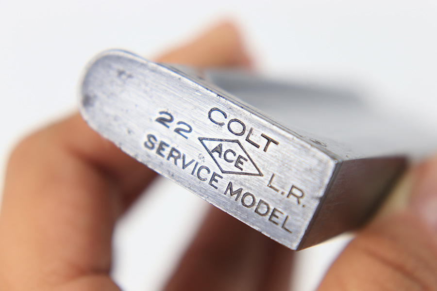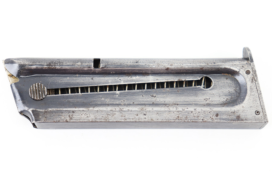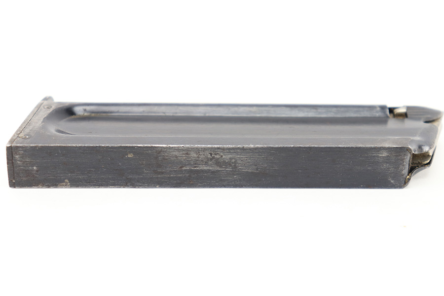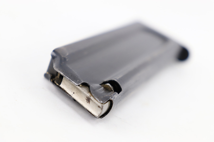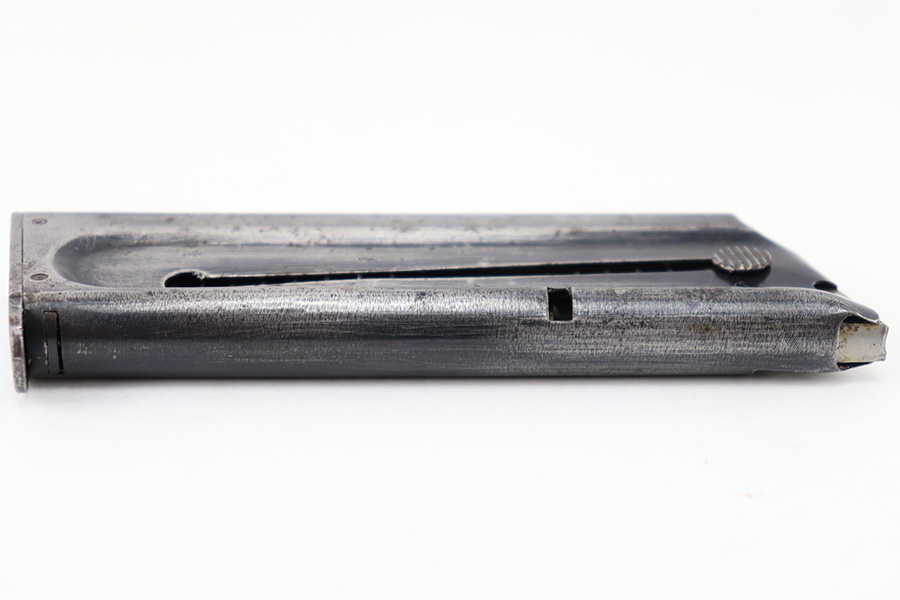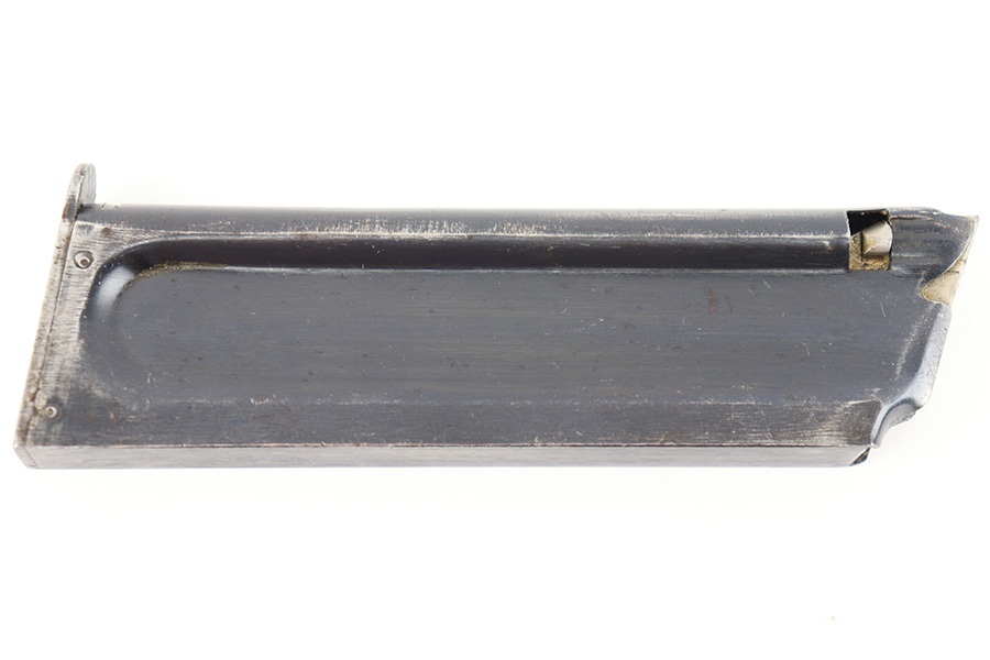 8/15/23 – This is an original Colt Ace Service Model .22 LR magazine. The magazine is fully blued, which is indicative of WW2 era production (or later). The magazine is in very good overall condition with some light finish loss and thinning to the original finish throughout, as well as areas of speckling patina and mild discoloration. The base is Colt maker stamped as shown. The spring is strong and fully functional.