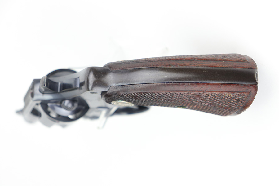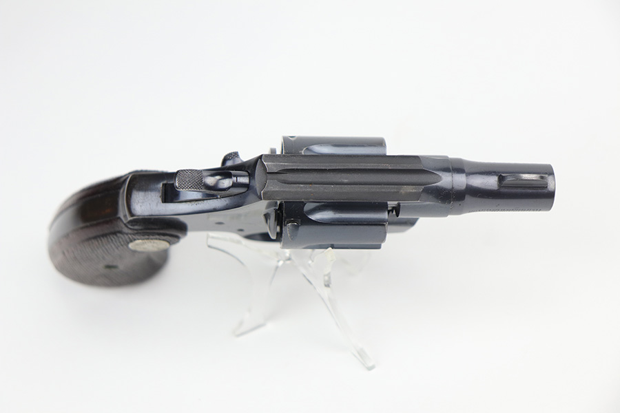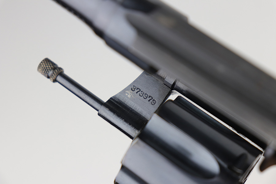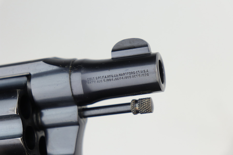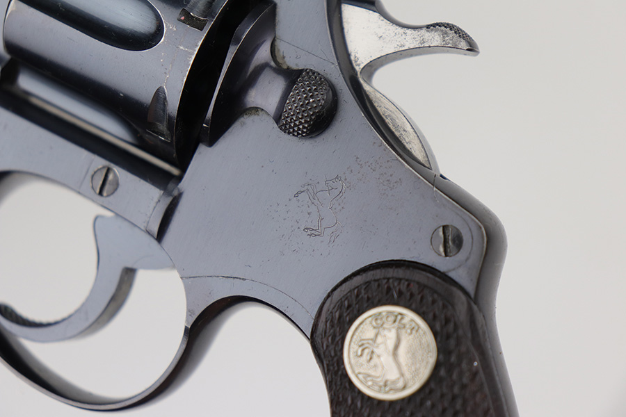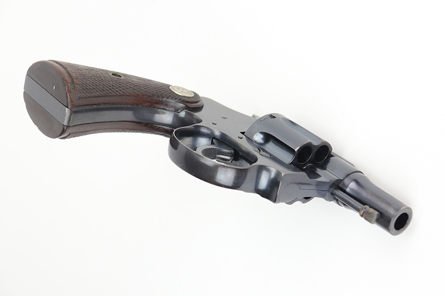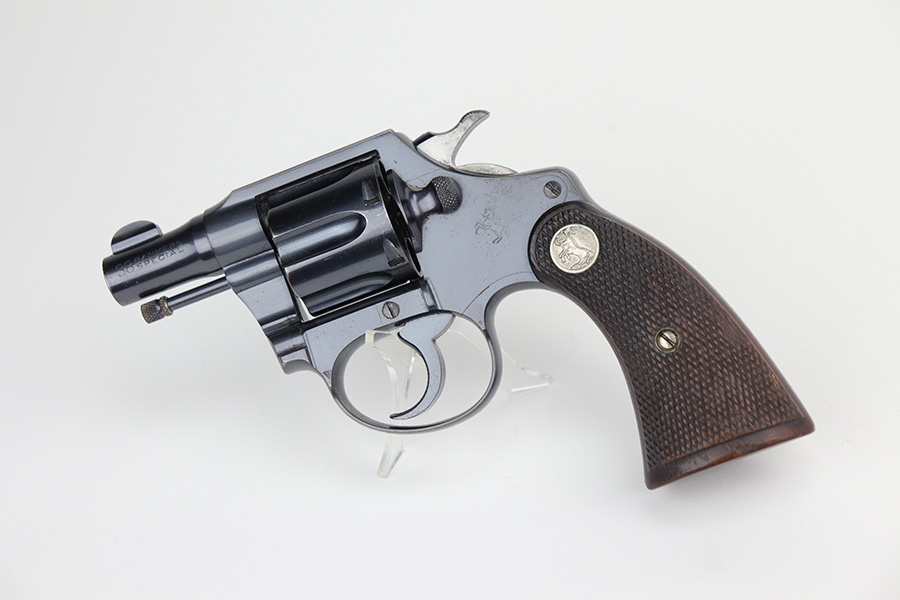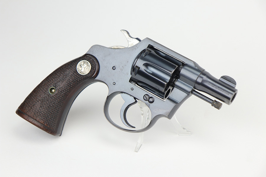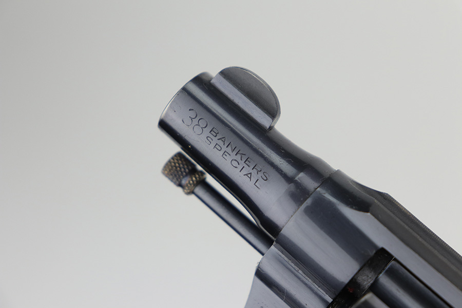 10/28/21 – This is an excellent and original example of the rare Colt Banker’s Special revolver, with this particular one being made in 1935. These models are similar in size and weight as the Detective Special pistols but they have a smaller frame and cylinder. They were designed with bank workers in mind and could be easily concealed. The U.S. Postal Service also issued considerable numbers of these to their railway mail clerks. It has about 96-97% of the original Colt blue remaining, with minor edge wear on muzzle and cylinder. There’s a very light turn mark on cylinder, and some dulling of the grip strap. Also minor surface oxidation on the frame. Mint bore and excellent grips. Two-inch snub barrel. Colt manufactured approximately 35,000 Banker Special revolvers between 1926 and 1943.