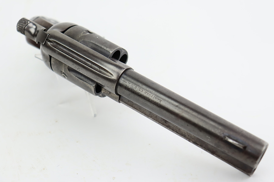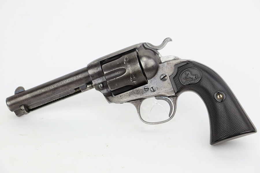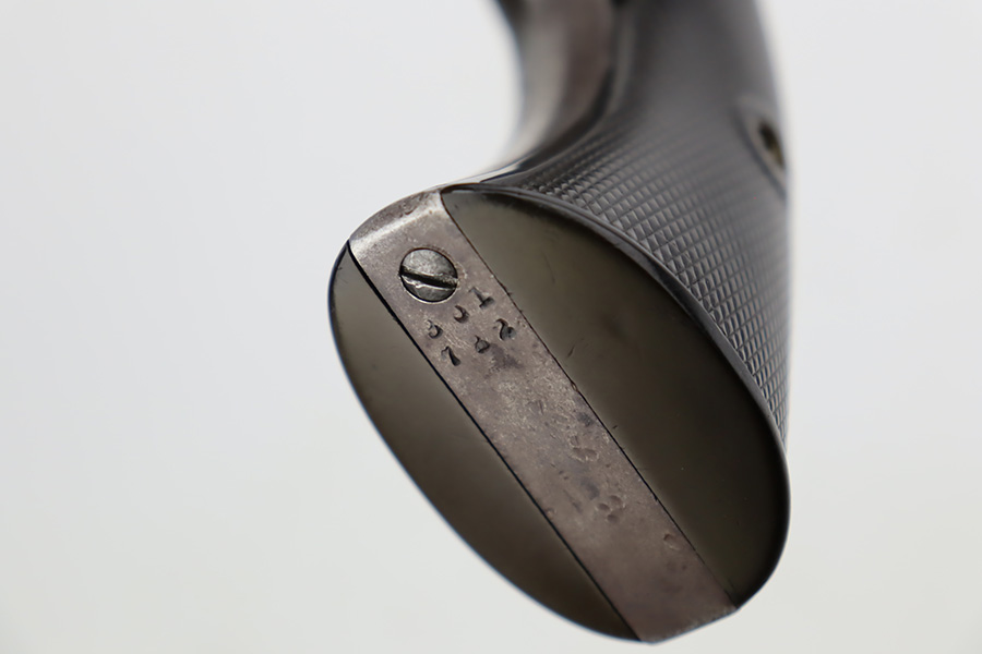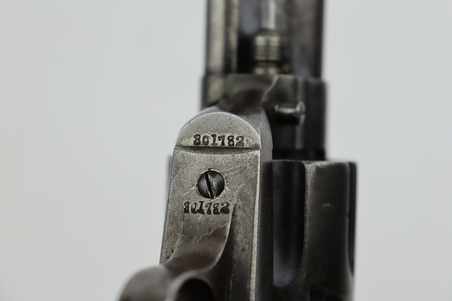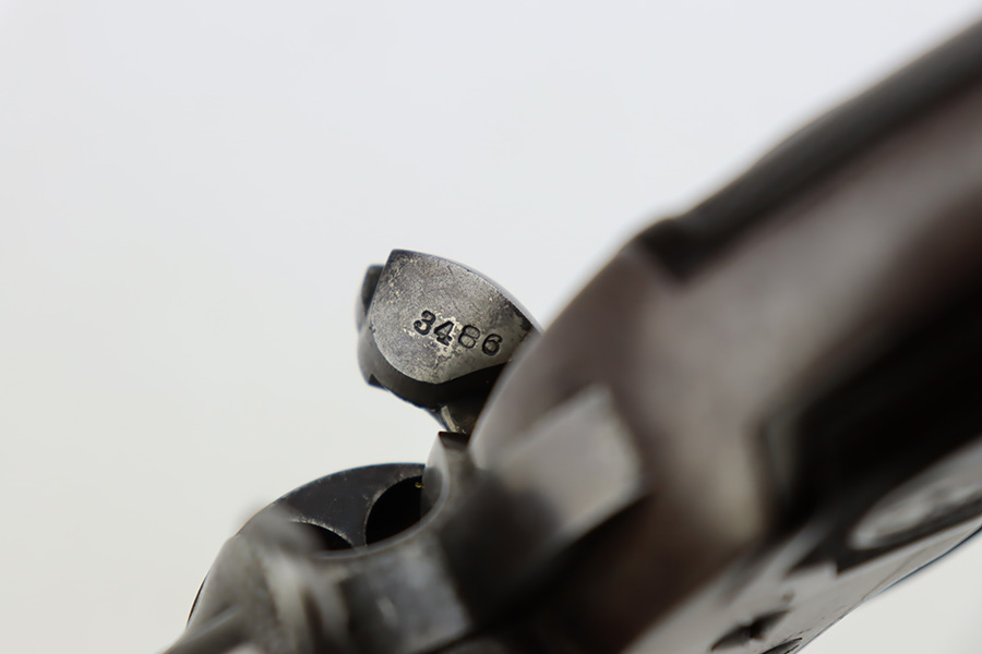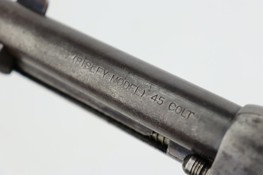 9/20/23 – This is an original Colt Bisley Model revolver from 1907. All numbered parts match and the bluing is original throughout. The finish is obviously worn with notable patina but no major areas of corrosion. Barrel is 4.75in with strong rifling but some corrosion in the forward half of the barrel. Excellent hard rubber grips with no cracks. Good mechanically.