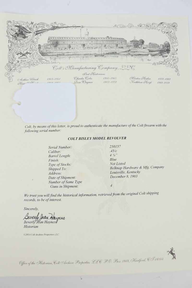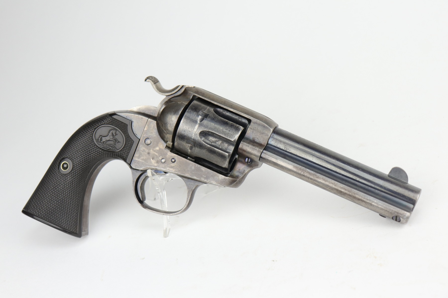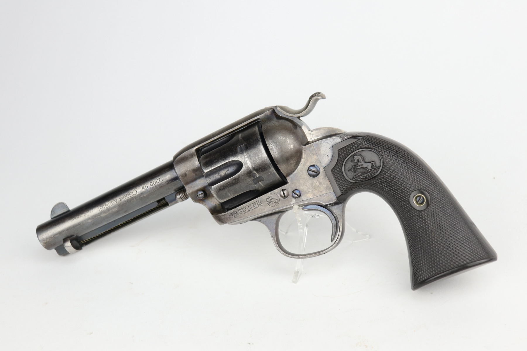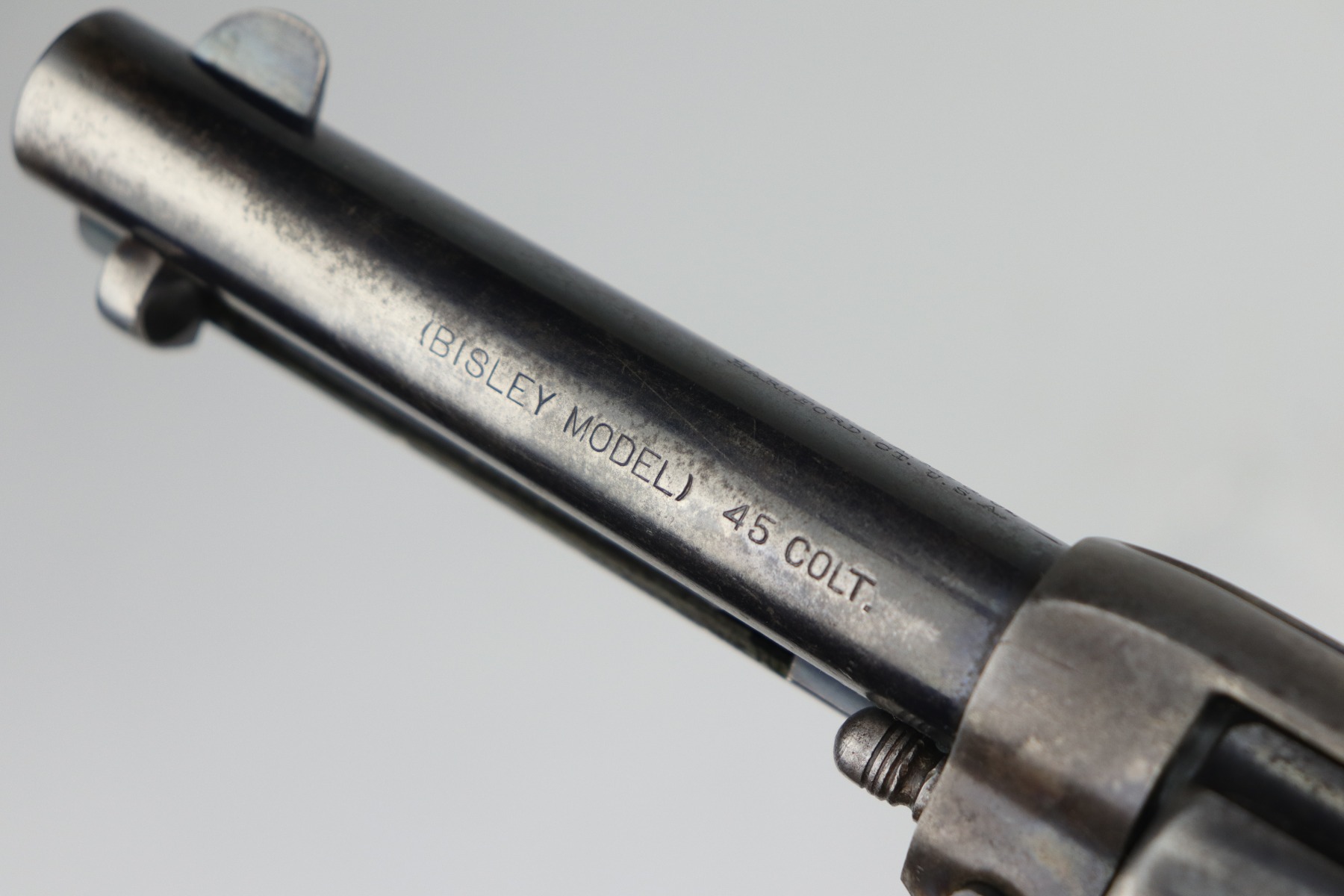 9/15/20 – This is an original Colt Model Bisley Revolver. It comes with a Colt factory letter. It has a 4.75″ barrel. According to the factory letter, it was shipped on December 8th of 1903 to the Belknap Hardware and Mfg Co. This particular example is fully functional and the action is smooth. The cylinder is tight. It has retained roughly 50% of its original finish – there are areas of wear throughout. There are a few small areas of light pin-pricking here and there. Roll mark on the cylinder. There are a few small dings and scratches on the front strap and the butt. Excellent, original grips. The bore is shiny with strong rifling – just a few areas of freckling. The gun is all matching.