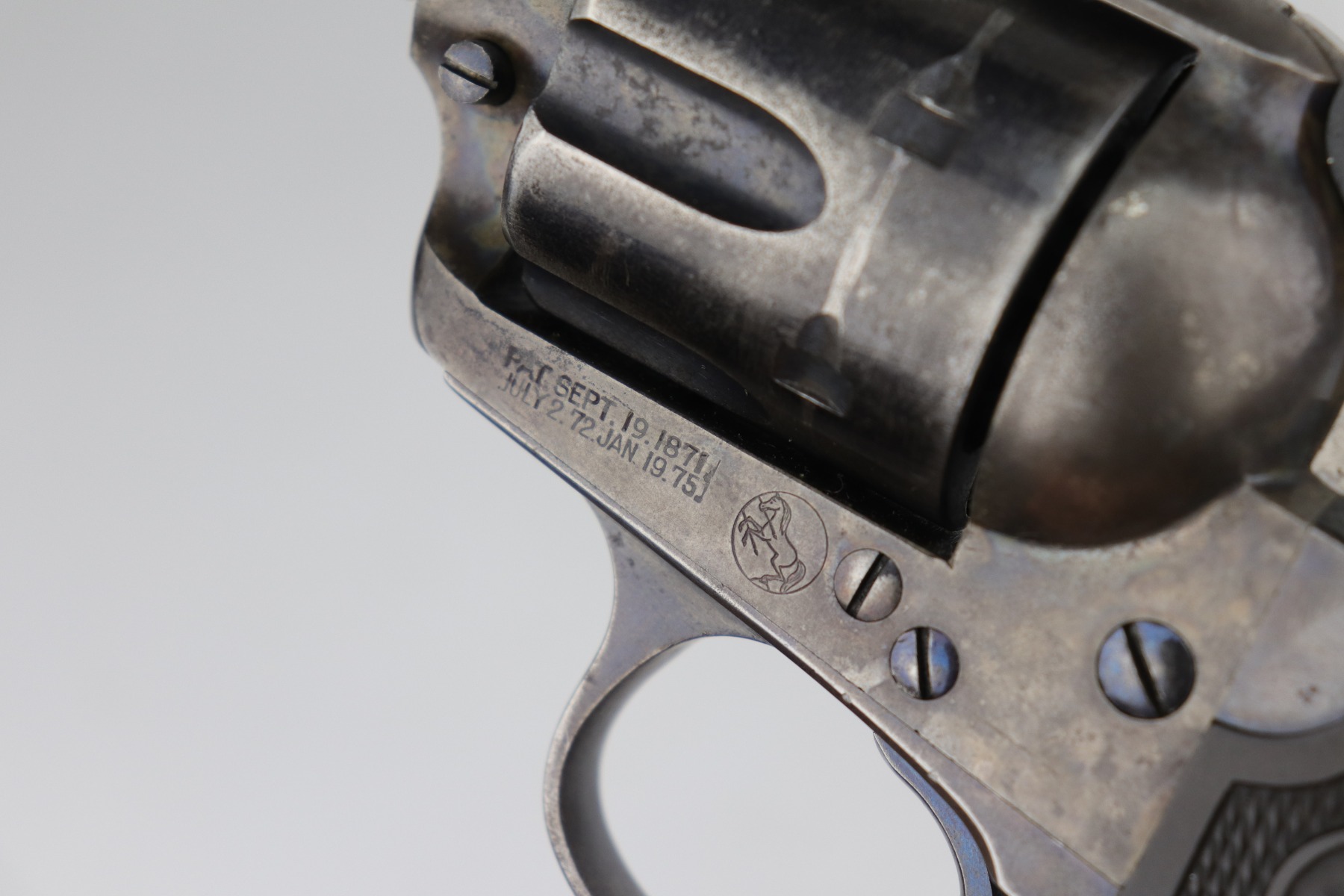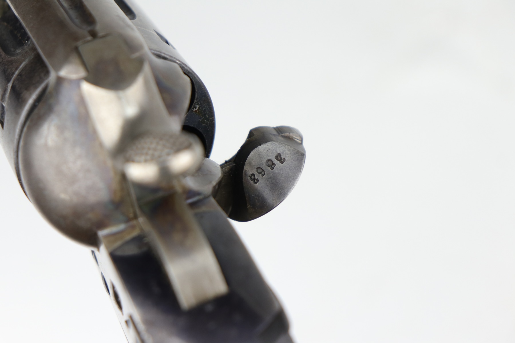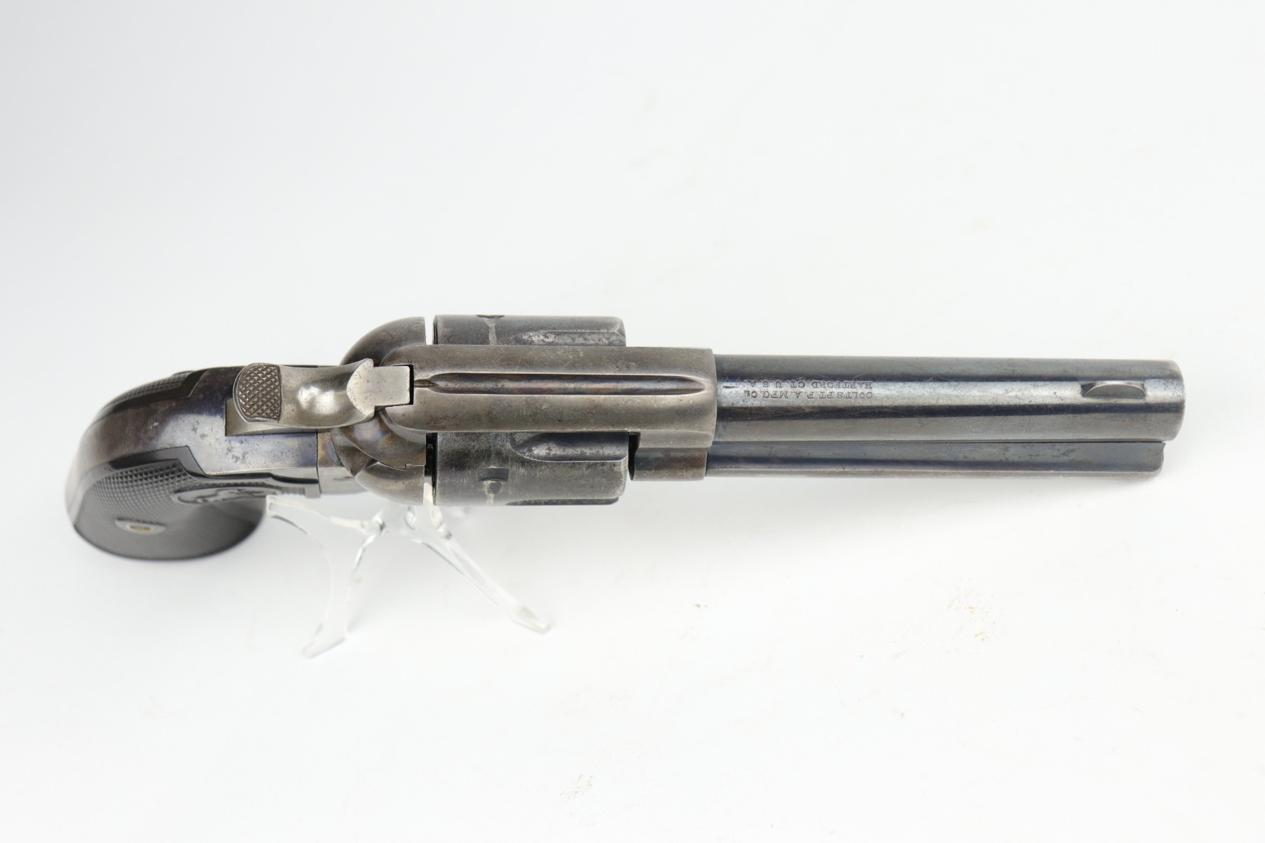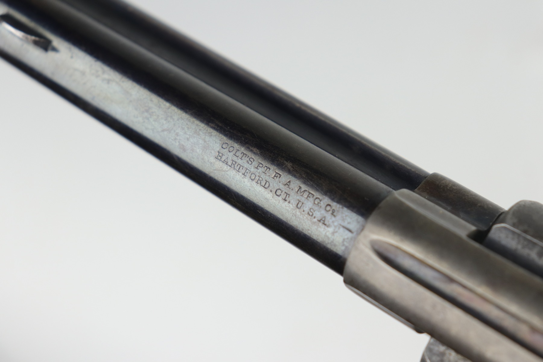 9/15/20 – This is an original Colt Model Bisley Revolver. It comes with a Colt factory letter. It has a 4.75″ barrel. According to the factory letter, it was shipped on December 8th of 1903 to the Belknap Hardware and Mfg Co. This particular example is fully functional and the action is smooth. The cylinder is tight. It has retained roughly 50% of its original finish – there are areas of wear throughout. There are a few small areas of light pin-pricking here and there. Roll mark on the cylinder. There are a few small dings and scratches on the front strap and the butt. Excellent, original grips. The bore is shiny with strong rifling – just a few areas of freckling. The gun is all matching.