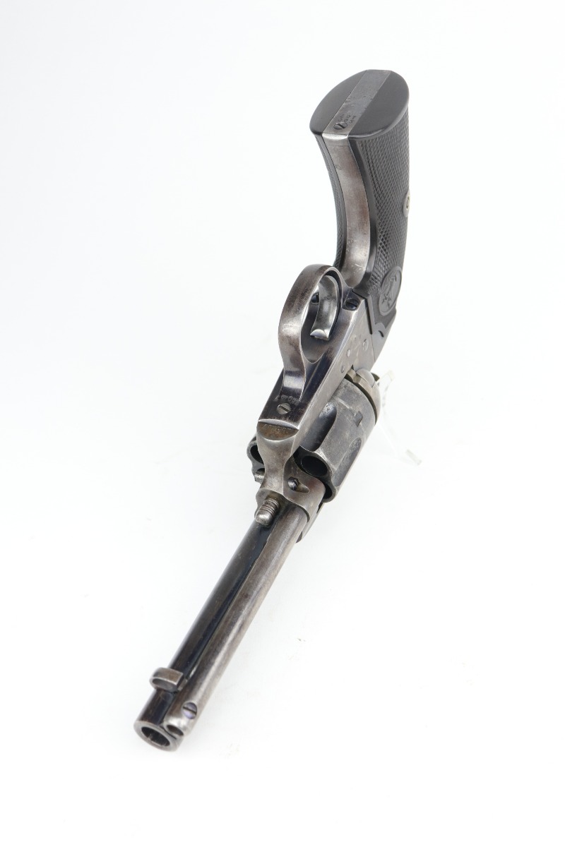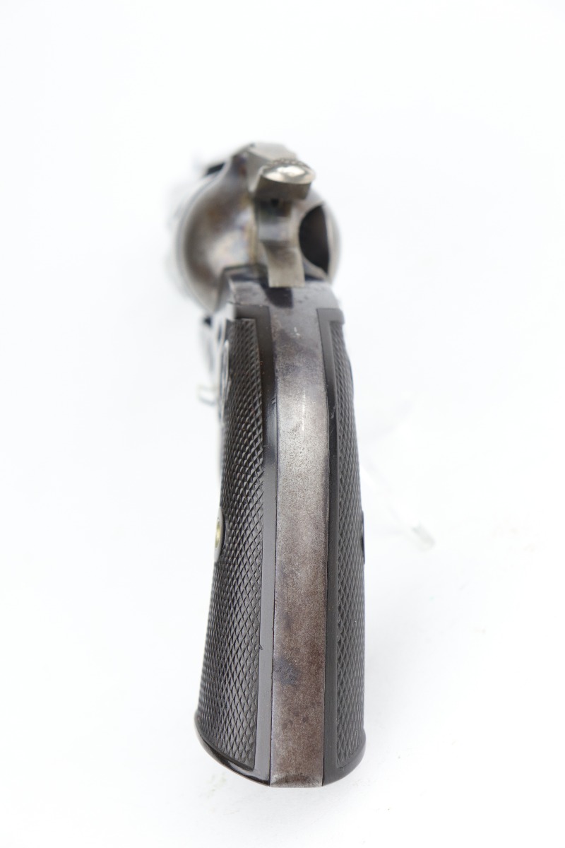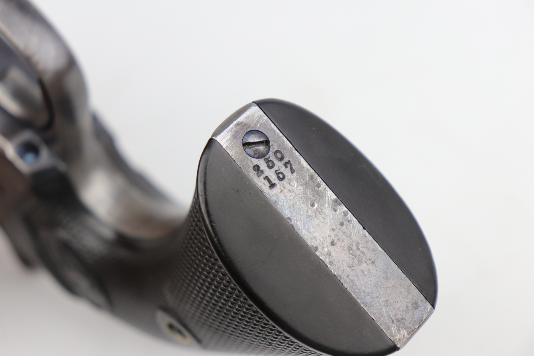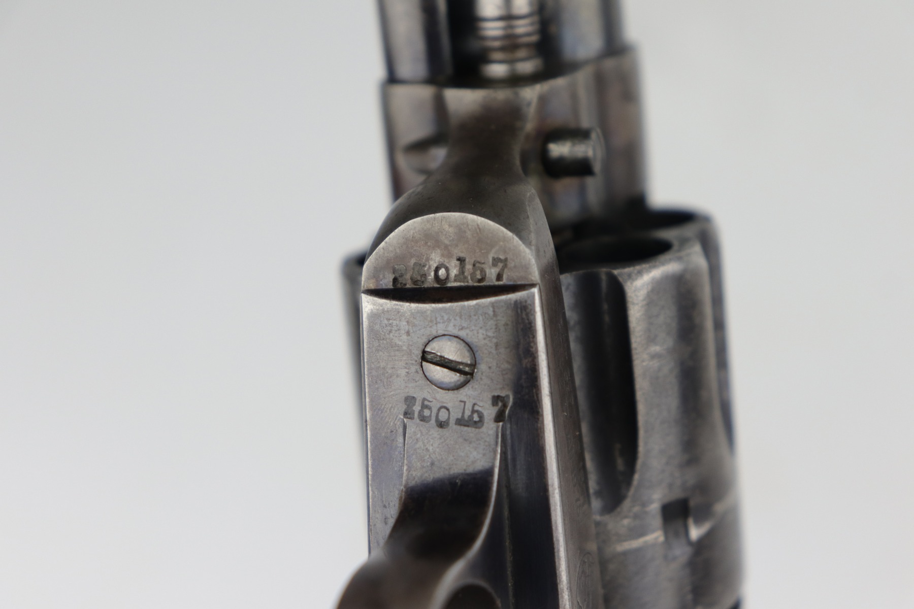 9/15/20 – This is an original Colt Model Bisley Revolver. It comes with a Colt factory letter. It has a 4.75″ barrel. According to the factory letter, it was shipped on December 8th of 1903 to the Belknap Hardware and Mfg Co. This particular example is fully functional and the action is smooth. The cylinder is tight. It has retained roughly 50% of its original finish – there are areas of wear throughout. There are a few small areas of light pin-pricking here and there. Roll mark on the cylinder. There are a few small dings and scratches on the front strap and the butt. Excellent, original grips. The bore is shiny with strong rifling – just a few areas of freckling. The gun is all matching.