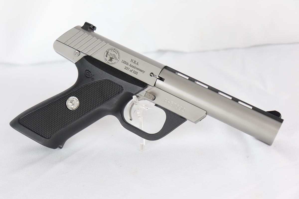 9/5/18 – This is an ANIB Colt Cadet limited edition that was made to commemorate the 125th anniversary of the NRA. There were 525 produced in this series and this pistol was number 237. The pistol shows little to no use and comes in the original Colt case, inside of the Colt picture box. Original Colt paperwork and tool is included. Heavy barrel with vent rib. FFL required.